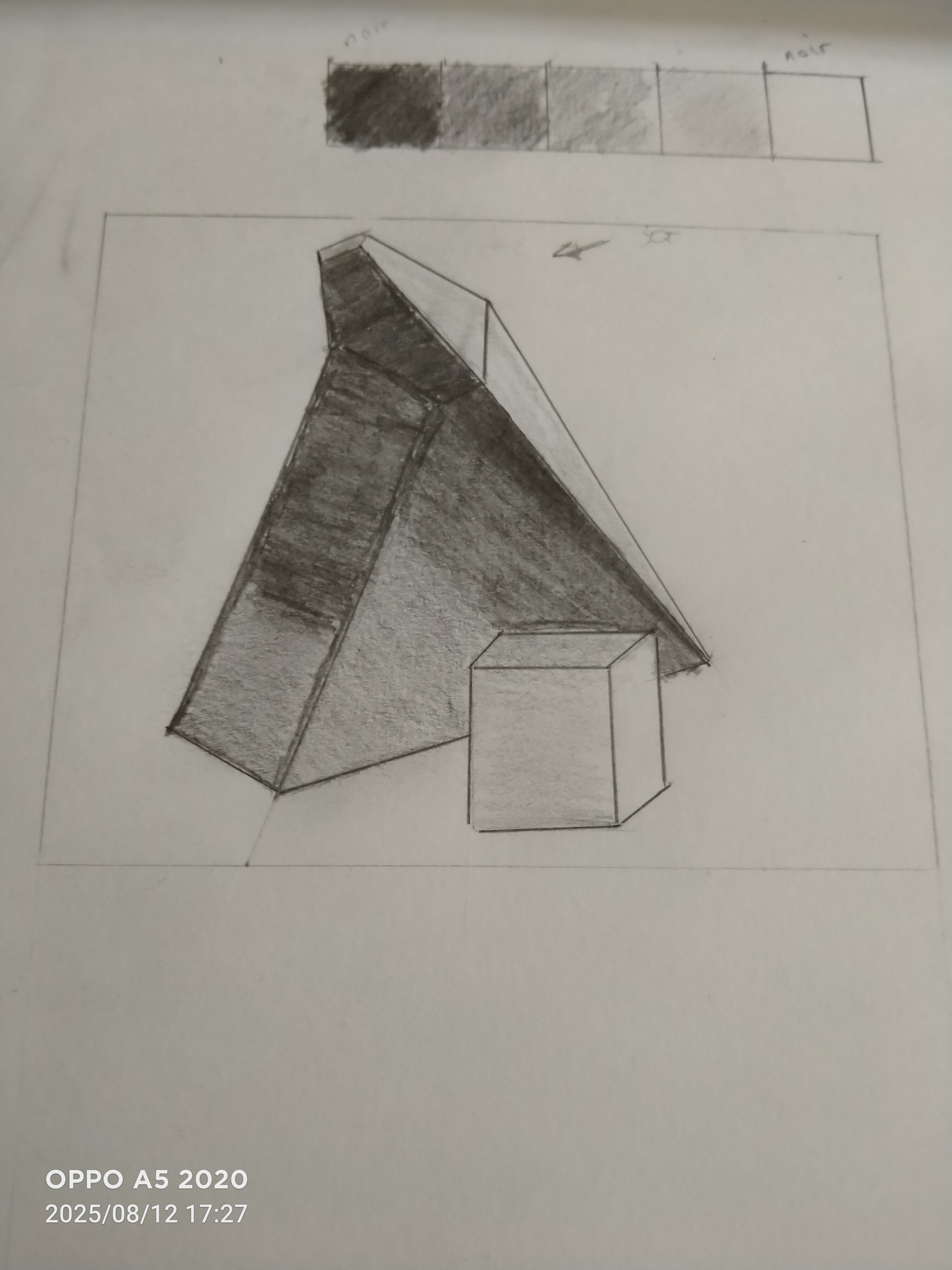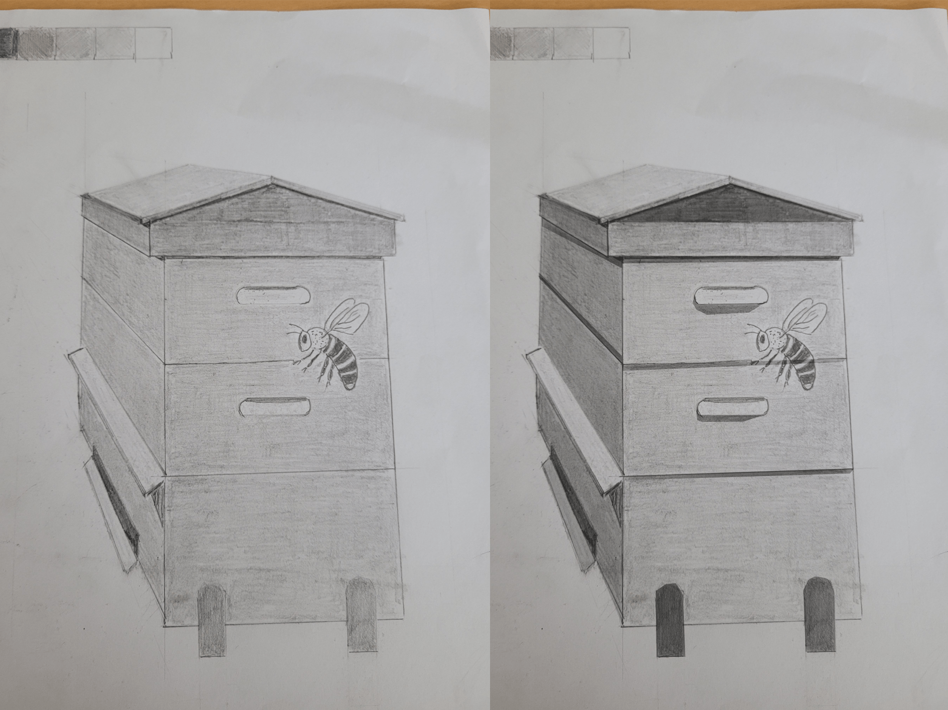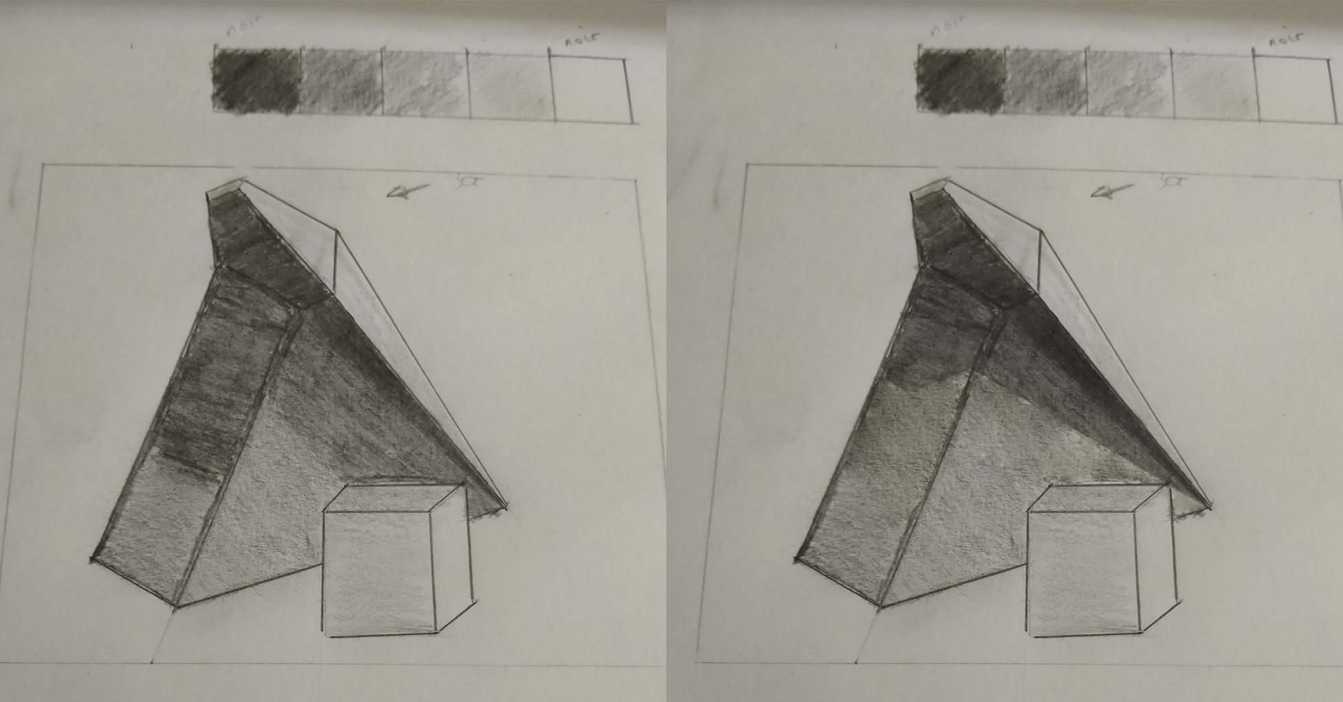Deuxièmement, tu as bien identifié les différents degrés d'intensité dans les ombres. La prochaine étape est de continuer à t'entraîner pour que l'ombrage soit de plus en plus doux et que tu obtiennes un rendu plus cohérent et uniforme.
