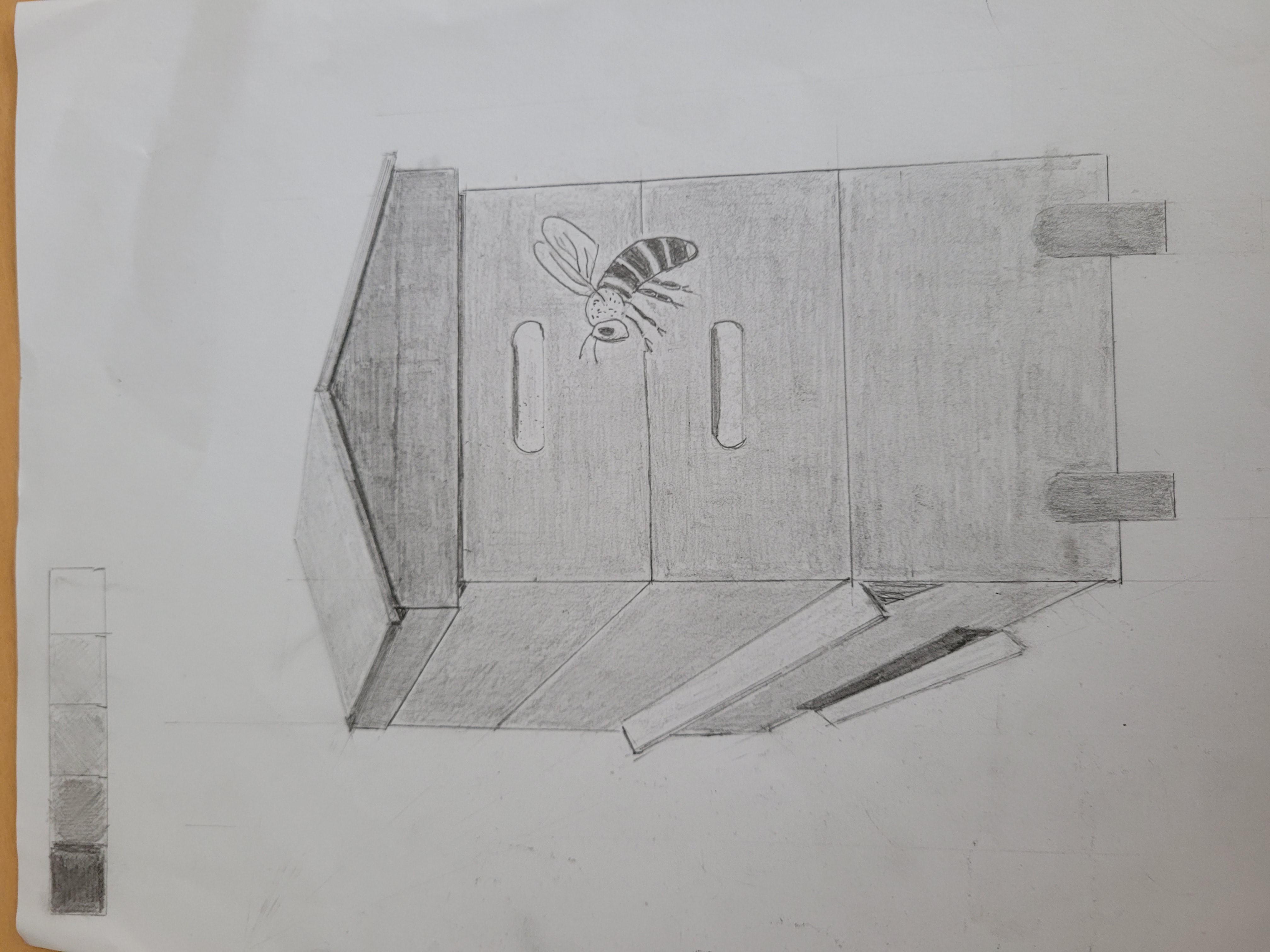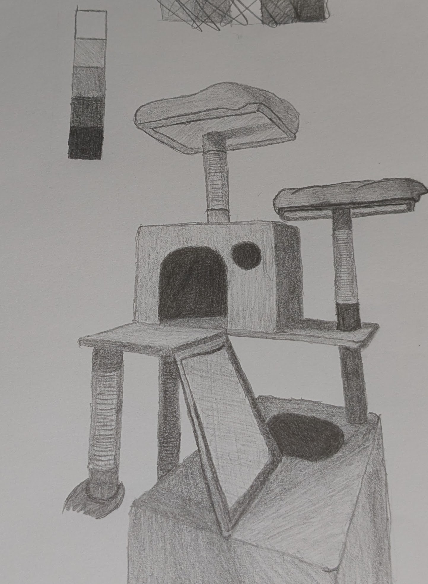 Top ! C'est vraiment réussit, surtout avec un critérium aussi fin, ça demande pas mal de patience aha. Le seul petit conseil que j'aurais à te donner pour avoir un résultat encore plus uniforme c'est de conserver un même sens de hachure, par exemple sur la plate-forme du bas on voit qu'entre les ombres et les lumières tu as dhangé de sens (sans doute pour une questions de confort) si tu arrives à conserver un même sens tout en faisant varier tes valeurs le résultat va être encore meilleur.