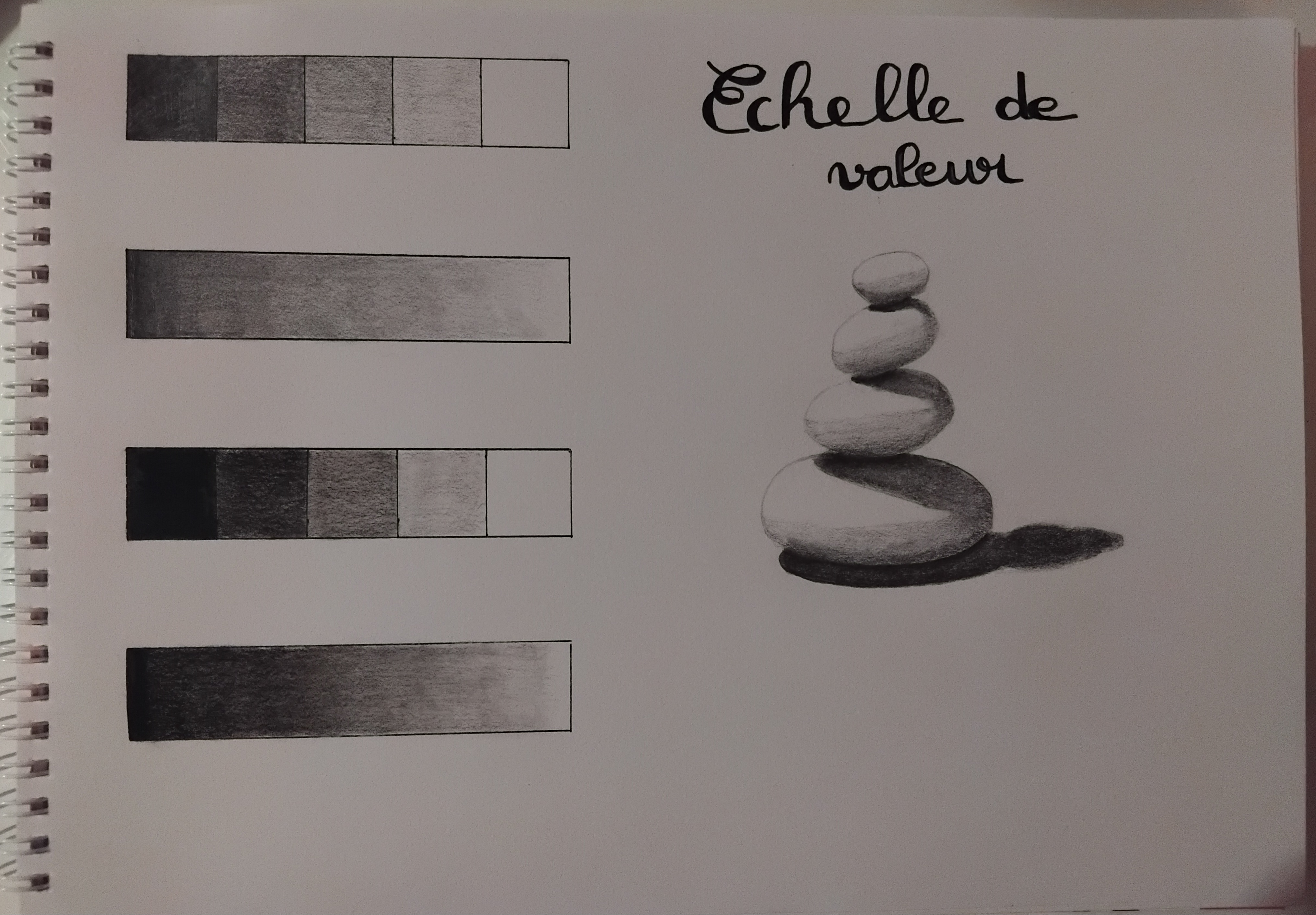 Quelques expérimentations d'échelles de valeur en utilisant différentes techniques. Les 4 premiers au crayon et le dernier à l'encre avec des petits points.