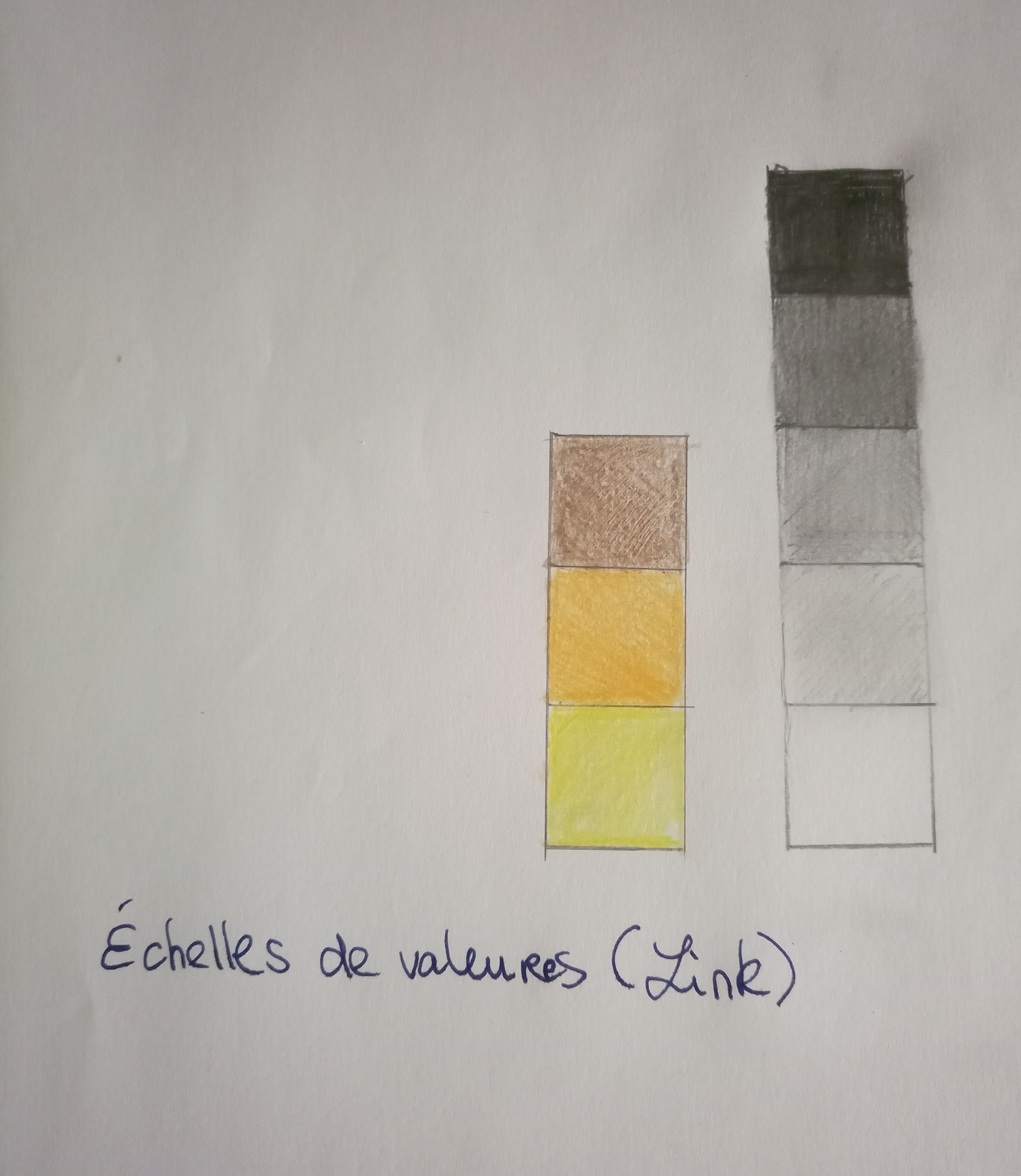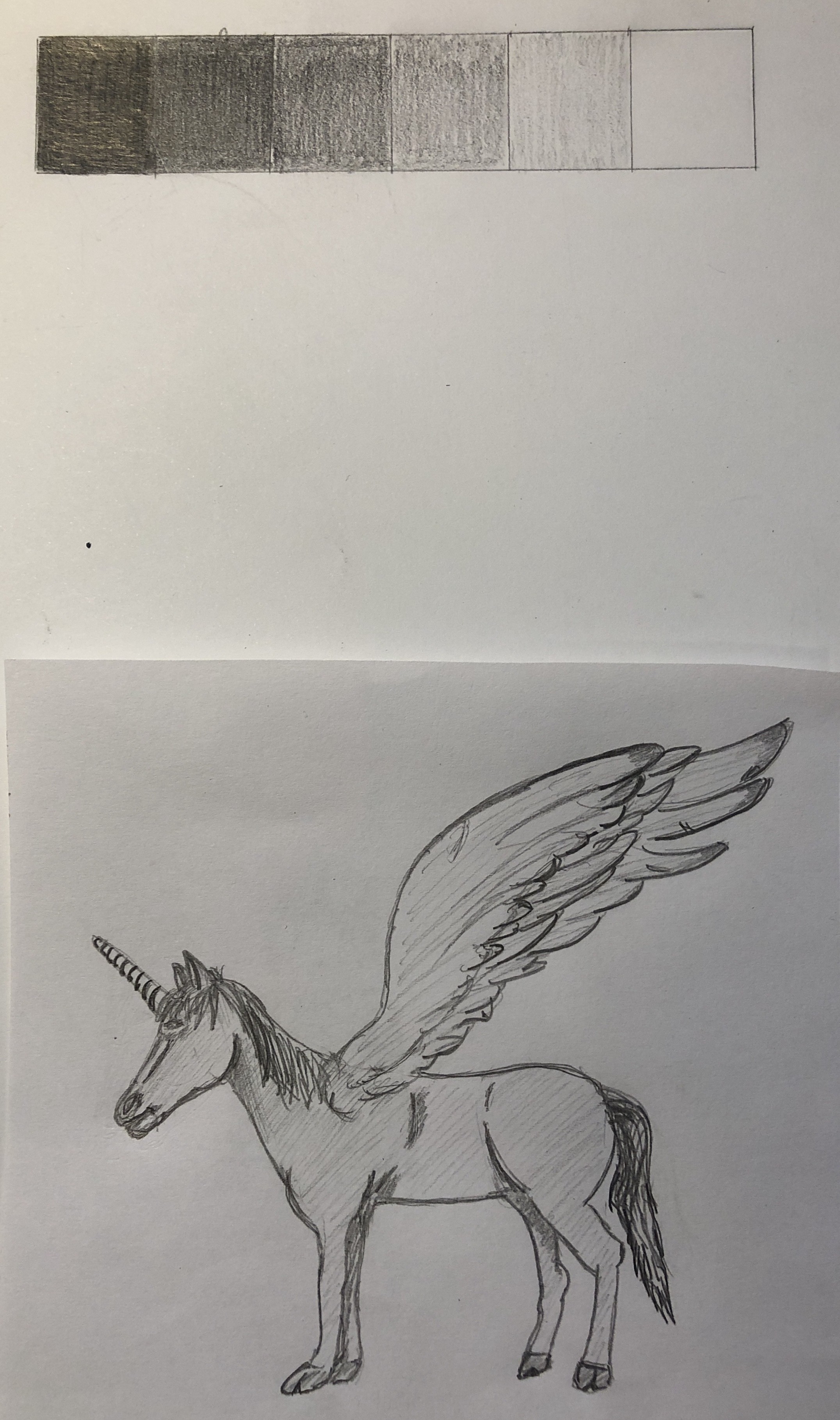 Voici mon échelle de valeurs ainsi que 2 dessins. La licorne c'était pour m'amuser et j'en ai profité pour mettre un peu de valeur dedans ;-)
