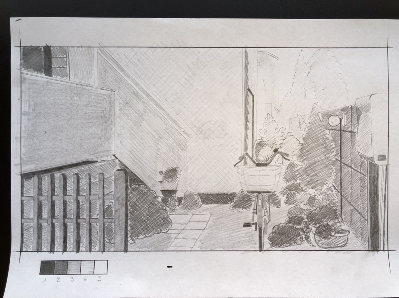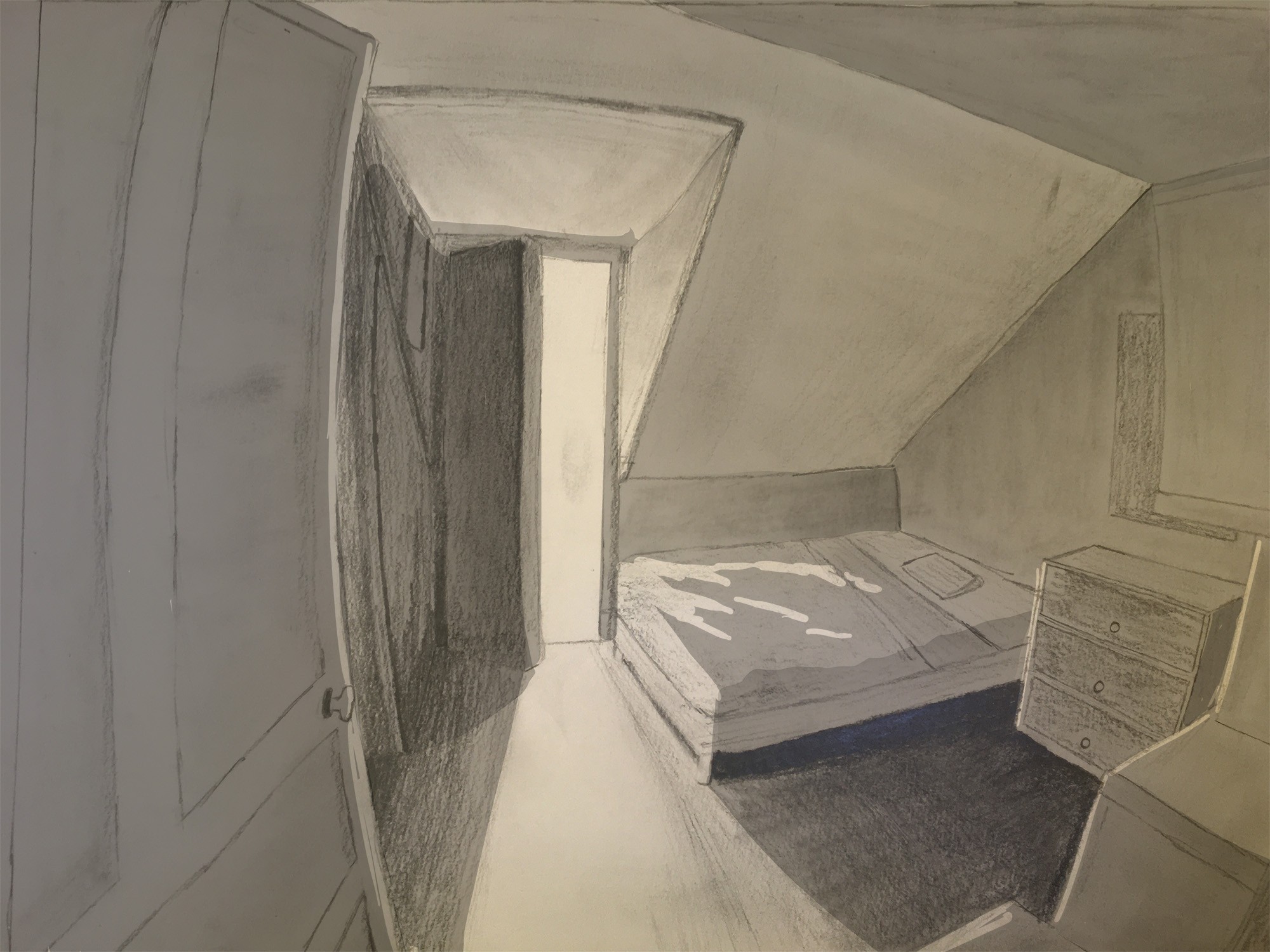 Je te joins une correction sur des valeurs pour donner du volume et plus d'éclat à la lumière qui filtre par la porte. Et pour ça, il nous faut du contraste, si tout est clair, on n'a pas l'impression que la chambre est sombre et donc, on ne comprend pas l'ombre ultra forte sous le lit.