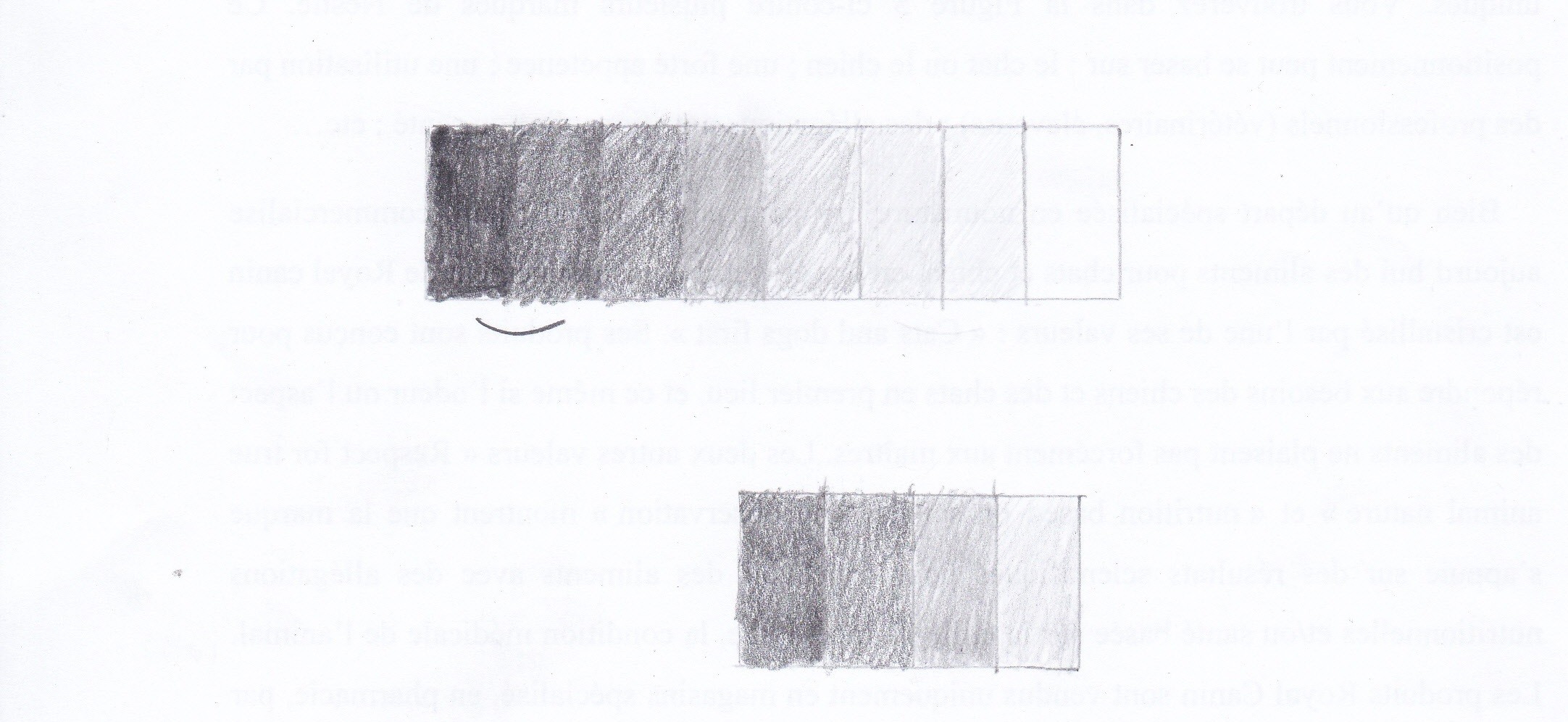 J'ai fait deux échelles de valeurs, la plus longue avec des crayons 6B, HB et 8H. Est-ce que l'échelle marche bien ou est-ce qu'il faudrait la faire entièrement avec un seul type de crayon pour obtenir une meilleur cohérence des gris?