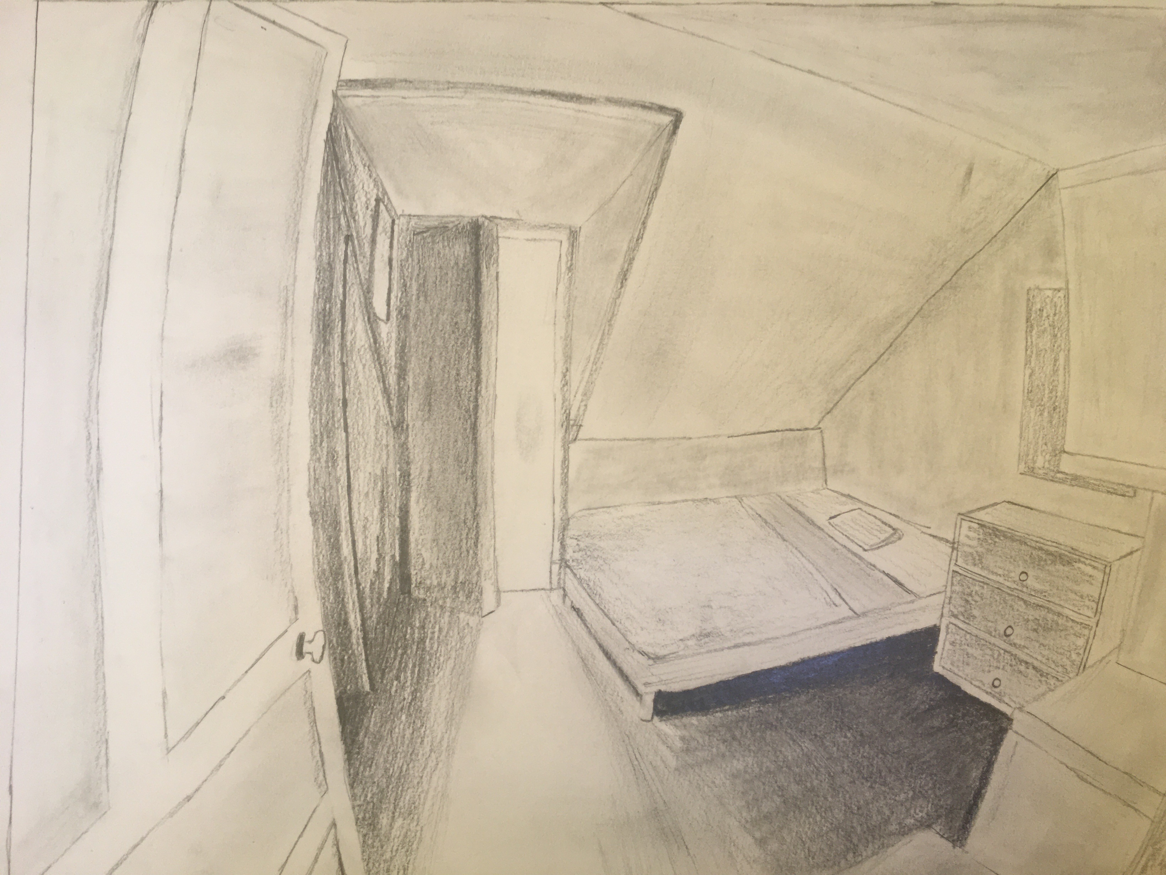 Je dirais que ça manque pas mal de relief et que tu as un rendu un peu brouillon à cause de l'estompage notamment (on voit des zones plus sombres, plus claires, les coups de doigts. Ca manque un peu de finesse disons. Et je vois aux tiroirs de la commode que tu ne remplis pas forcément les zones entièrement ce qui contribue à cet aspect un peu brouillon. Pourquoi ces tiroirs ne sont-ils pas estompés d'ailleurs ? Il faudrait normalement suivre la même logique partout ^^