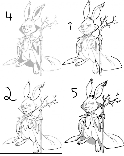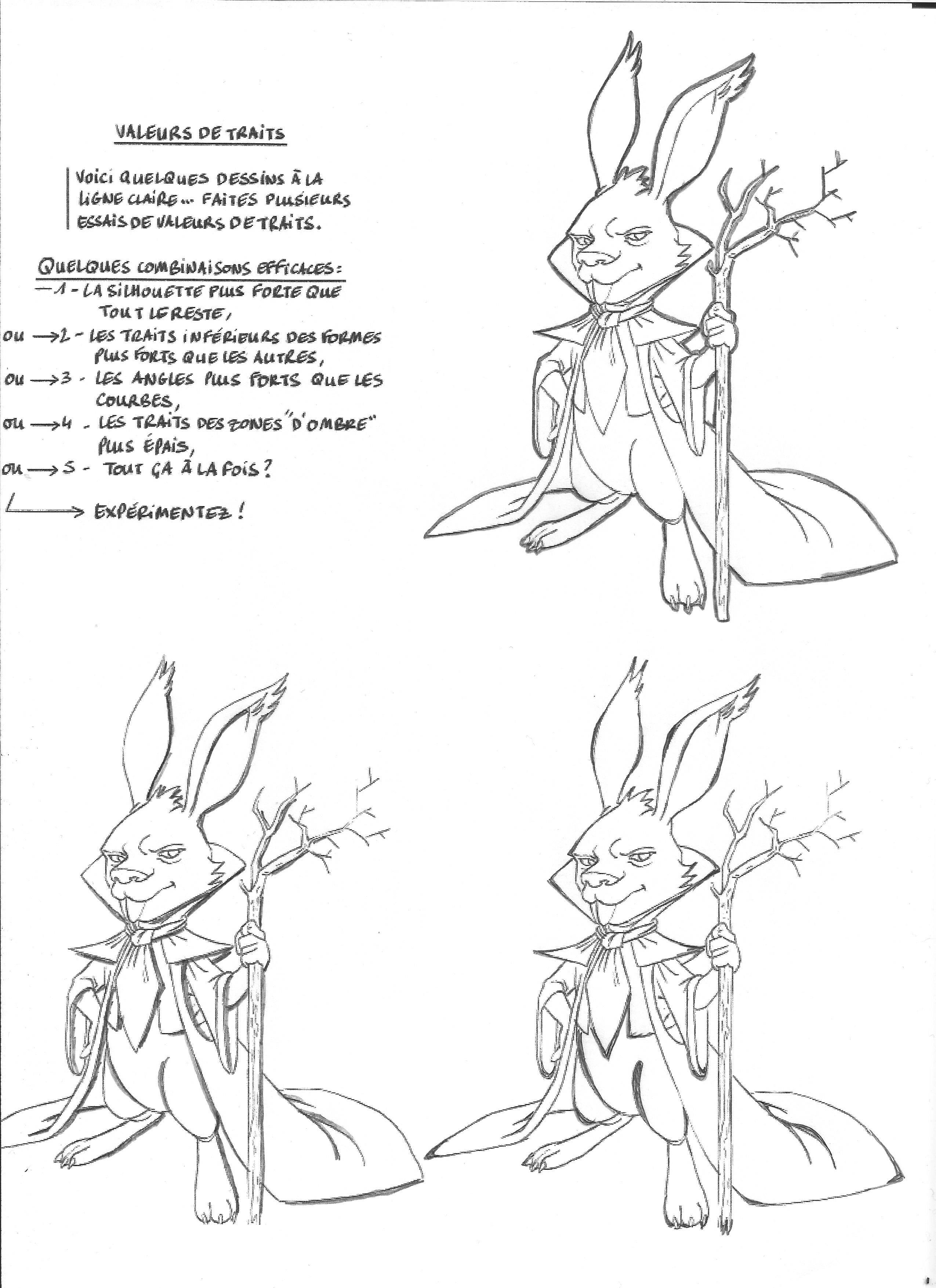 7) Pourquoi pas, mais c'est un peu étrange pour un personnage. Il y a des plans sur un paysage, c'est grand, mais ton personnage est plutôt sur un seul plan, donc c'est un peu bizarre d'exagérer tes distances avec les épaisseurs de traits pour ton lapin. Un personnage avec une pose en contreplongée on pourrait faire plus épais ce qui est le plus proche de nous, un personnage qui donne un coup de poing vers nous on peut aussi mettre en valeur ça en épaississant progressivement. Donc il y de l'idée, mais c'est à utiliser dans une autre situation ^^