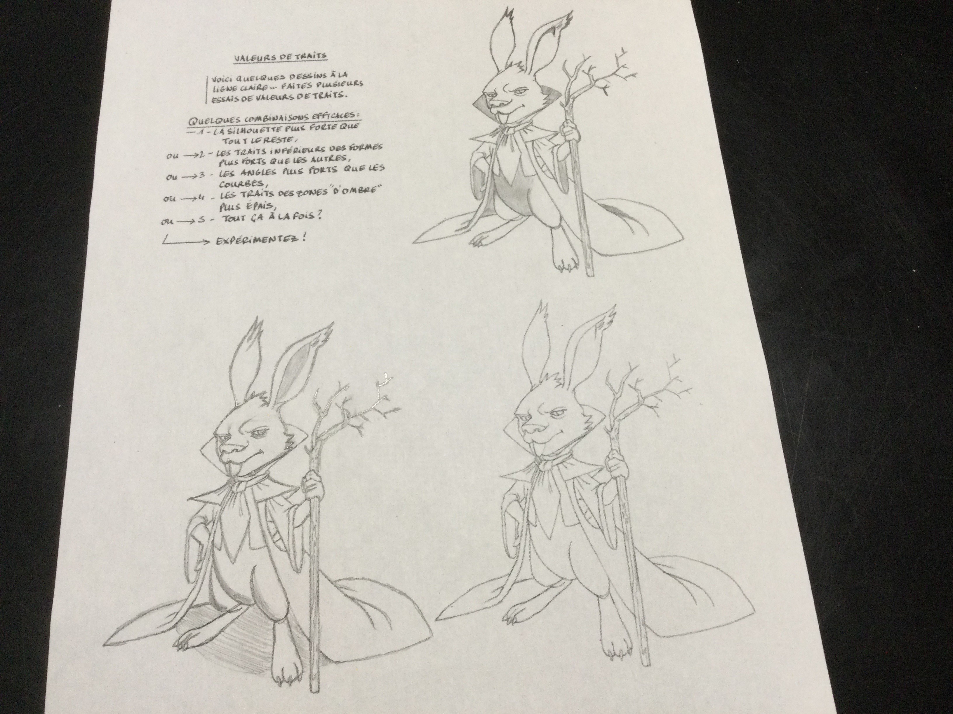 Je ne comprends pas trop sur quelles consignes tu t'es basé pour tes lapins. Quand tu utilises une consigne pour changer des valeurs de trait il faut que ce soit homogène, donc que le même code soi appliqué partout, là pour tes deux lapins travaillés tu as fait quelques zones coloriées mais tu n'as pas travaillé les traits qui doivent être épaissis selon les consignes. Sur ton lapin en bas à droite j'ai l'impression que tu as essayé de faire des ombres sur les pattes du lapin, mais c'est un peu trop épais pour des valeurs de trait (c'est plus une zone d'ombre qu'un trait épaissi) et tu n'as pas appliqué ton code partout. Repars en suivant bien les consignes, un lapin ou tu épaissis sa silhouette extérieure, puis un où les traits sont plus épais du côté de l'ombre, un où ce sont les angles qui sont épaissis… Dis moi si tu as des questions et tu peux aussi regarder la vidéo de correction si tu ne comprends pas quelque chose. Bon courage ;)
