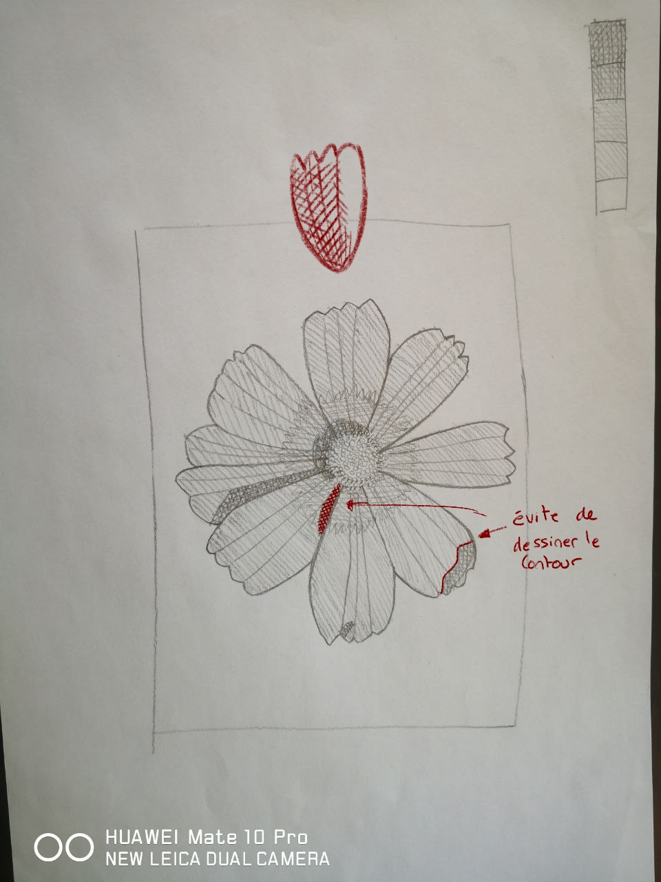 Salut EstelleGM, content que tu aies retrouvé le temps de prendre les crayons! C'est chouette, et c'était pas facile comme choix de sujet pour les hachures une fleur! Fais attention de ne pas hachurer tout du long non plus, laisse quelques partie neutre pour garder des zones plus claires, et également fais attention aux parties sombres. Ne ferme pas ta zone de hachures.