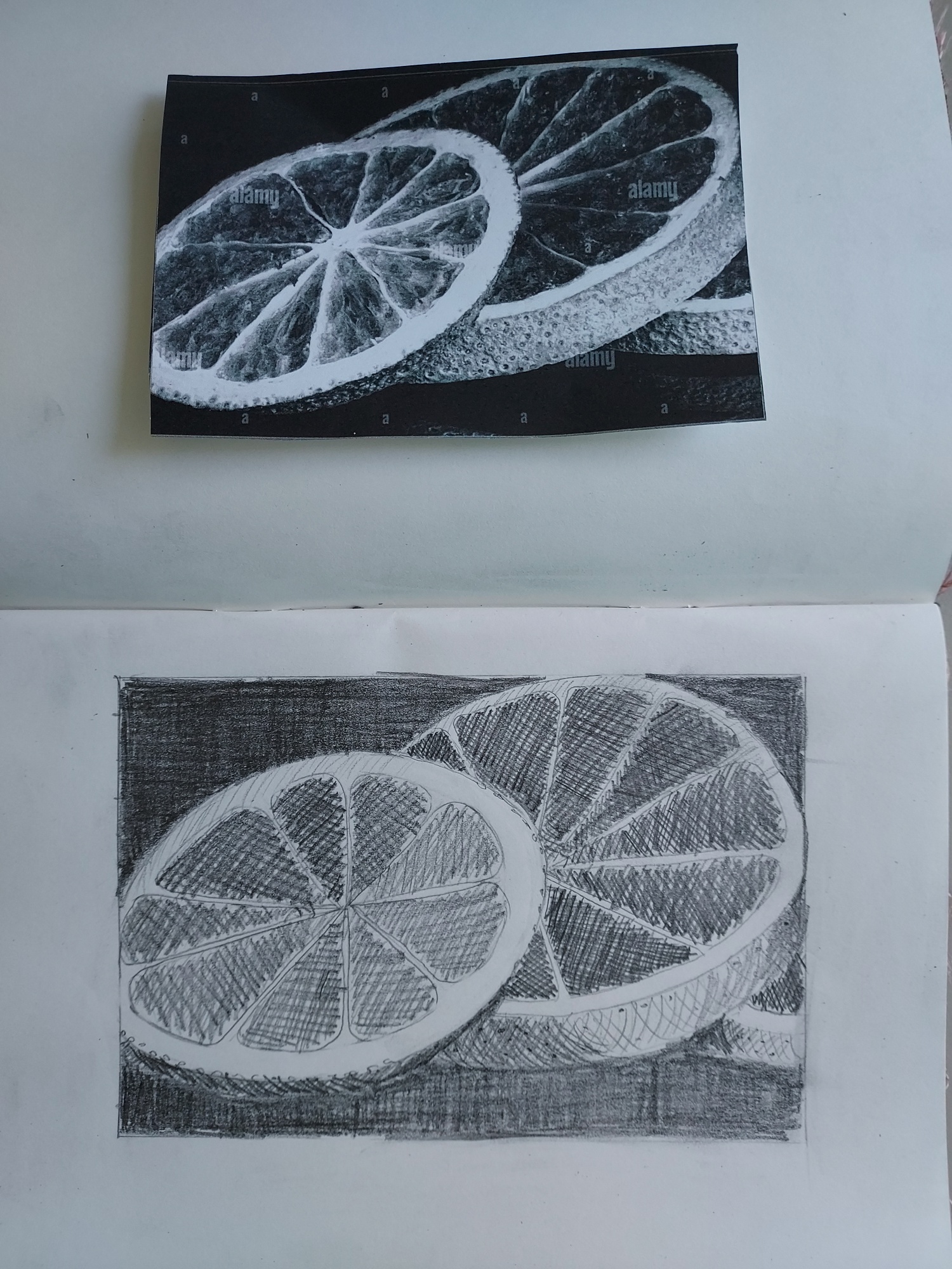 Salut Cartoon, tu n'as choisi le modèle le plus simple pour le travail des hachures! Il y a beaucoup de variation de ton dans la pulpe du fruit, pas évident à retranscrire en hachures... Mais c'est du bon boulot. Essaie de faire un travail de hachure en suivant les formes et les courbes de ton sujet sur ce genre de modèle (par exemple en faisant tes hachures en suivant le sens de la pulpe...)