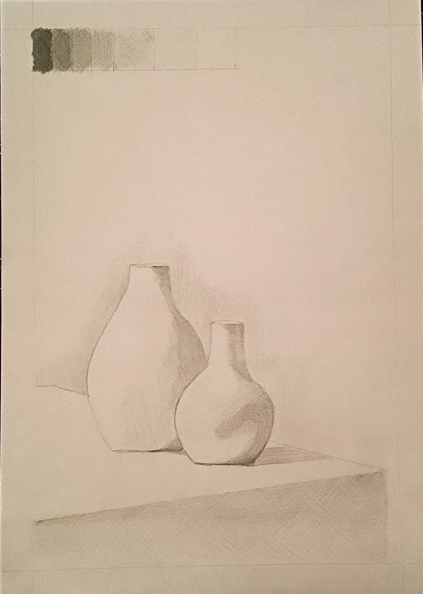 Il y a plein de façon de varier les contrastes en hachures, tu peux multiplier le nombres de croisillons (les différents angles que tu choisiras de hachurer), épaissir ton trait également, rapprocher ou écarter tes lignes hachurées donnnera un aspect plus ou moins sombre aussi... :)