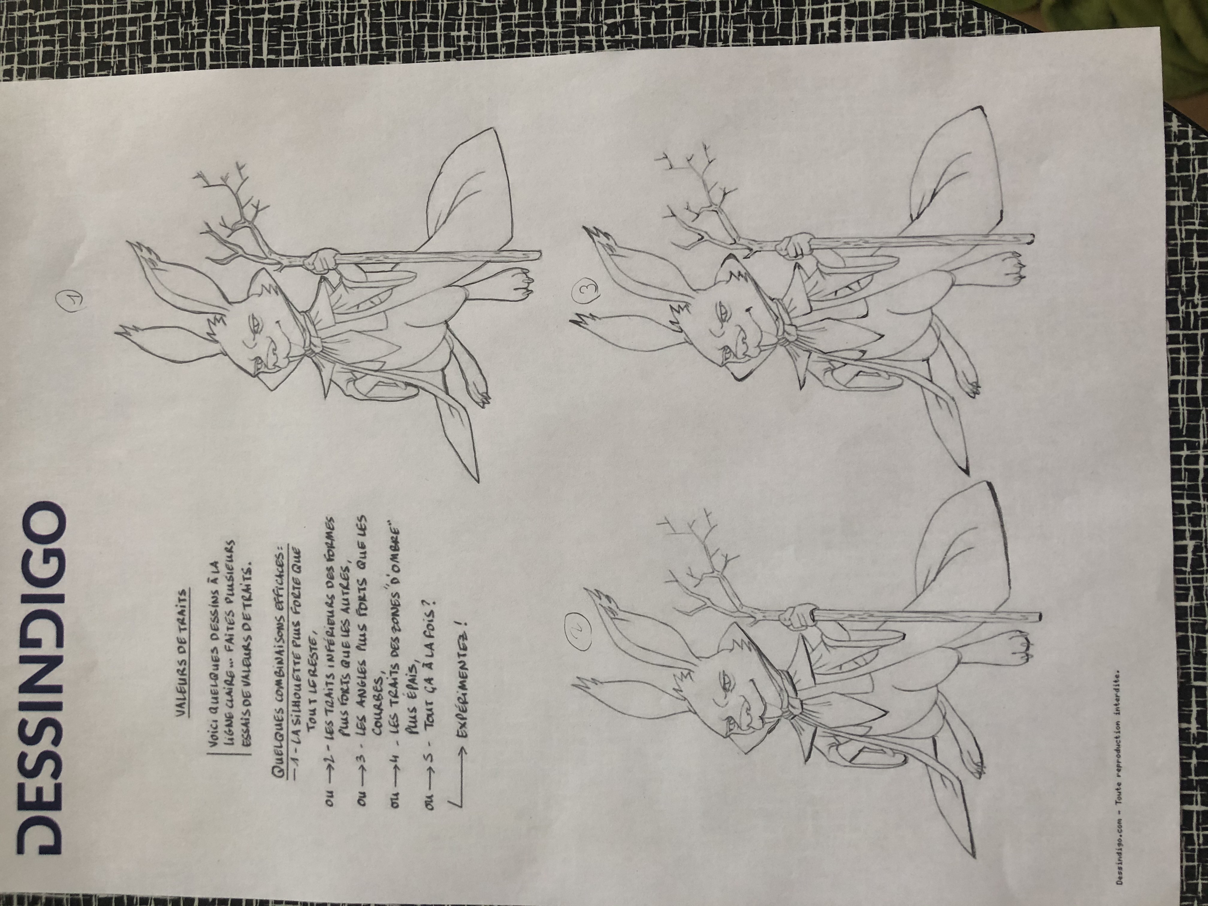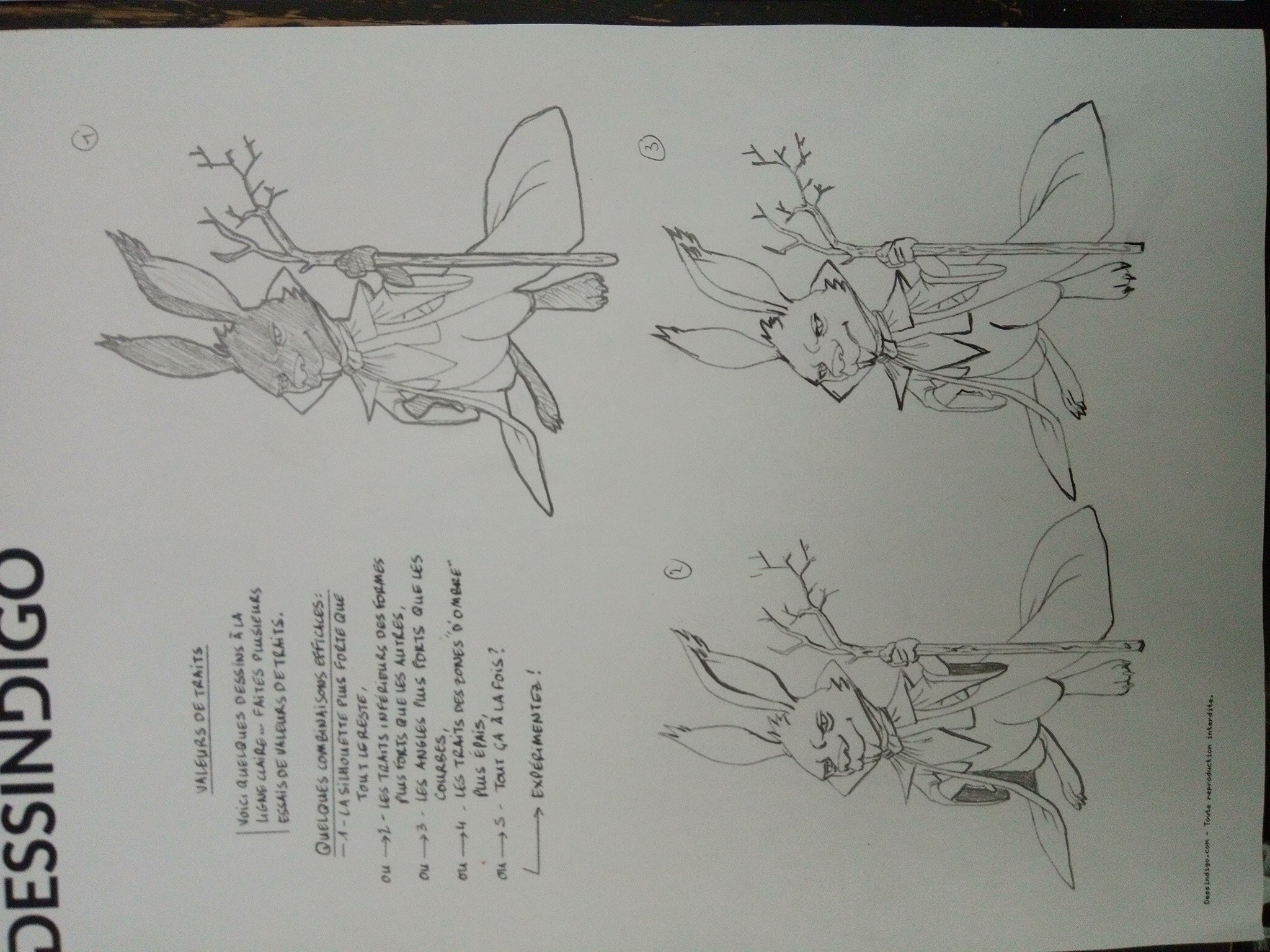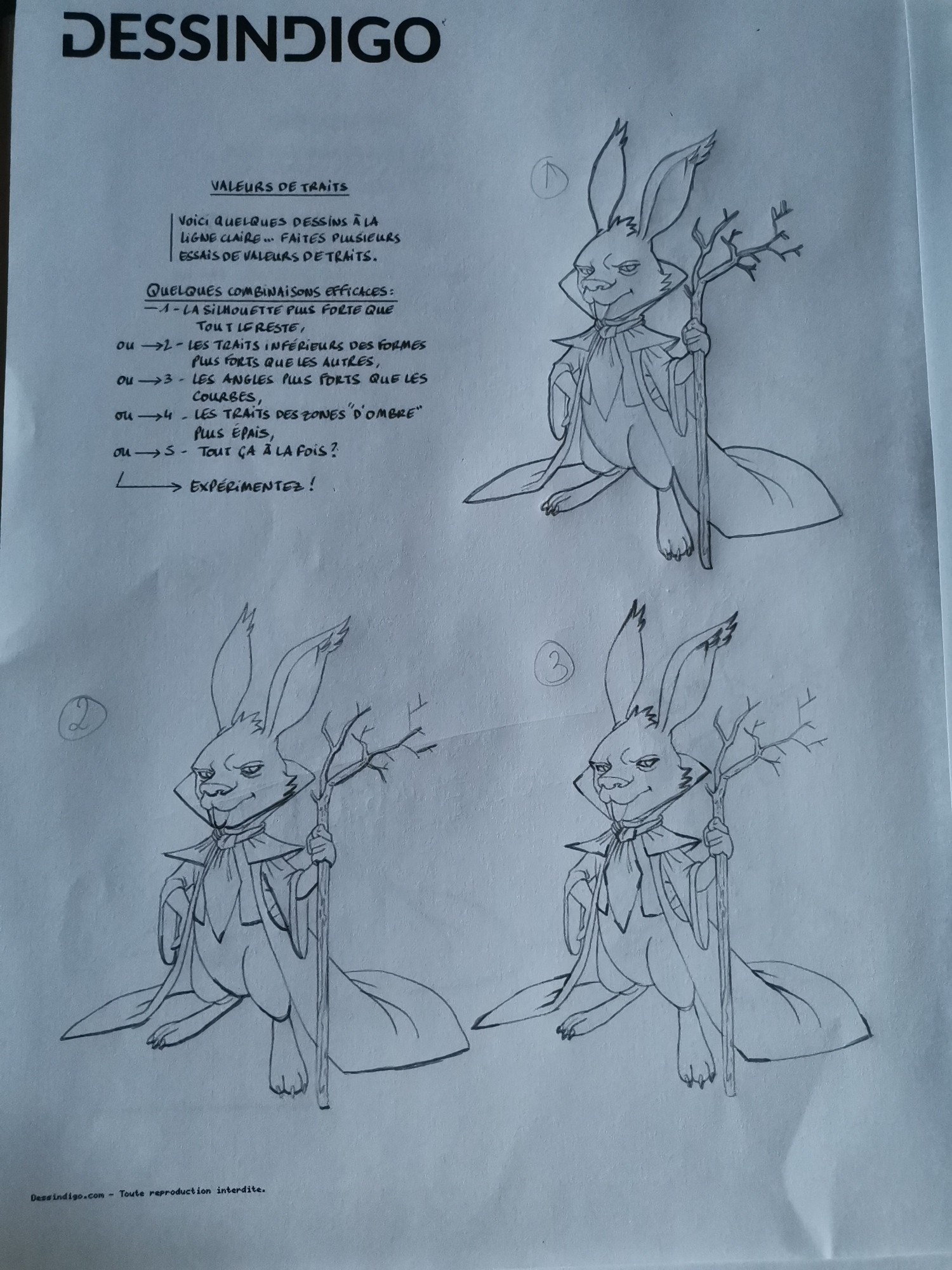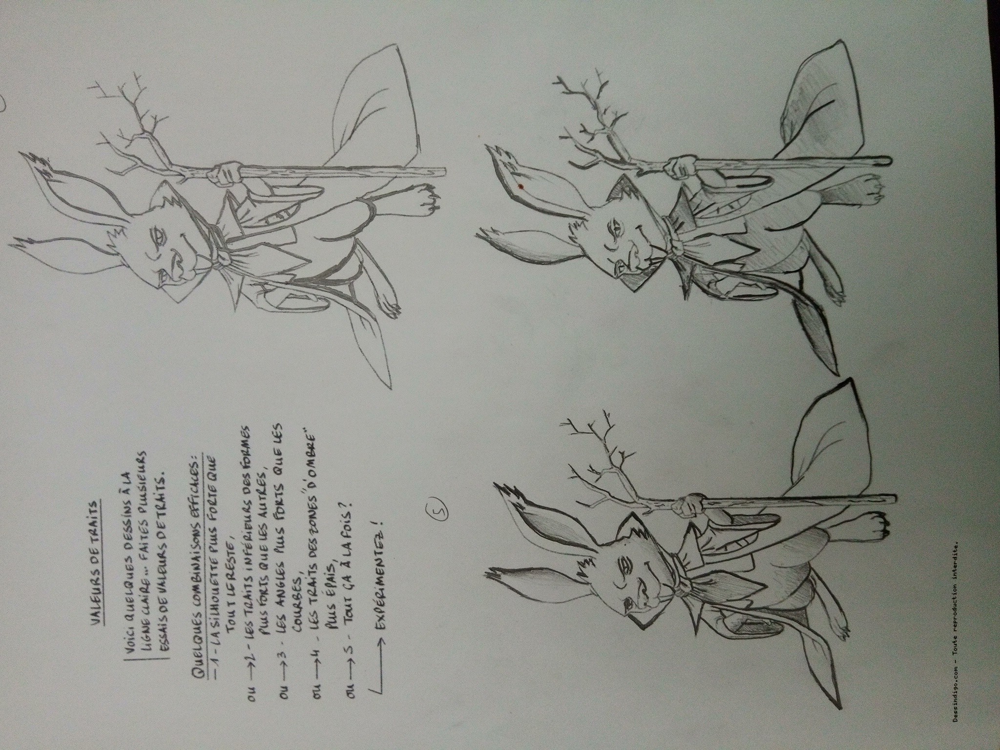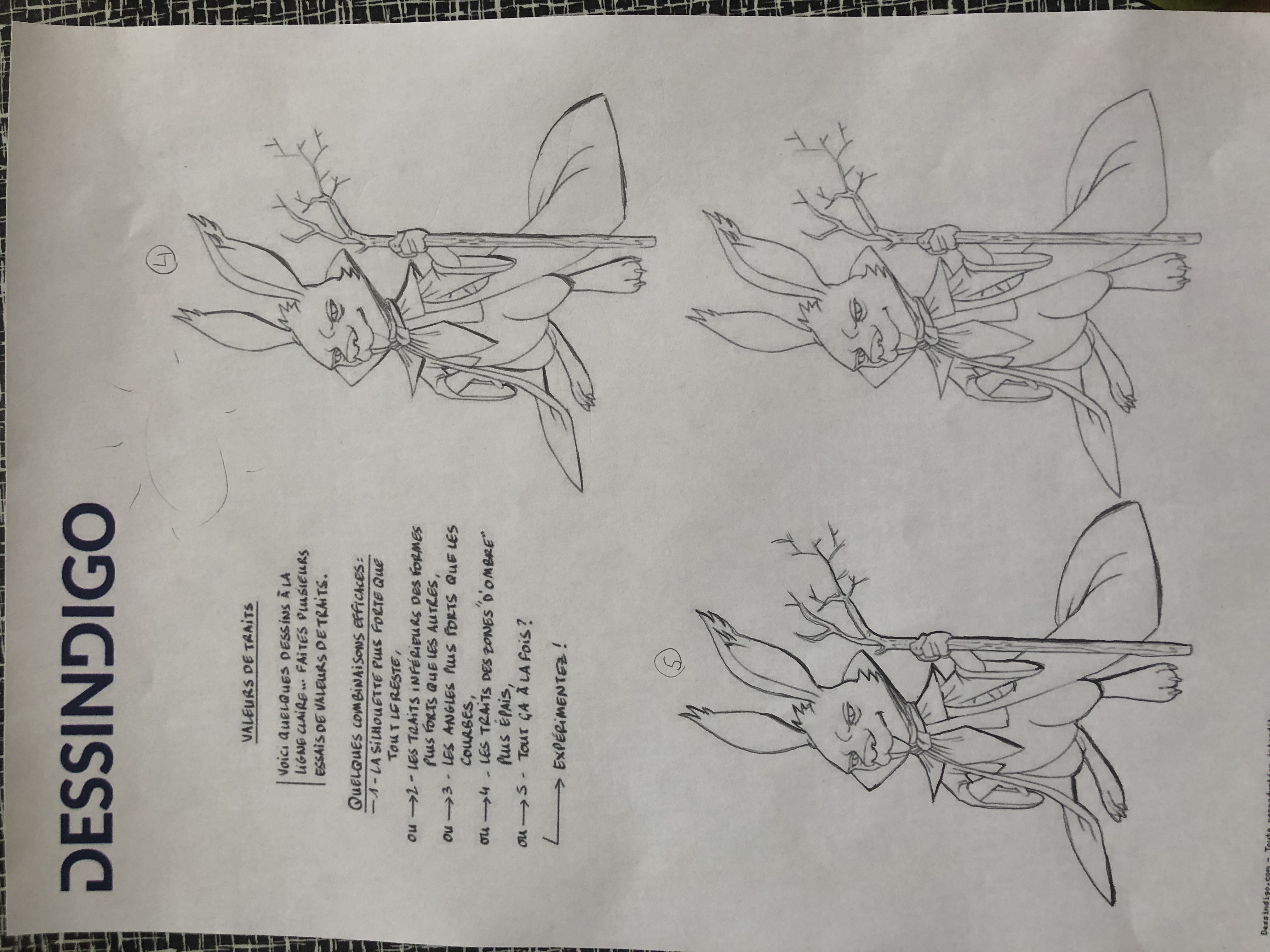 Bonjour, j'ai imprimé les dessins, pas plus grands,et j'ai posé une feuille dessus, j'ai bien respecté les traits parce que ce n'est pas mon dessin mais je crois qu'on pourrait s'amuser plus librement sur les nôtres hors exercice, partir d'un croquis d'un gribouillage réussi et essayer plein de façons de le traiter.
