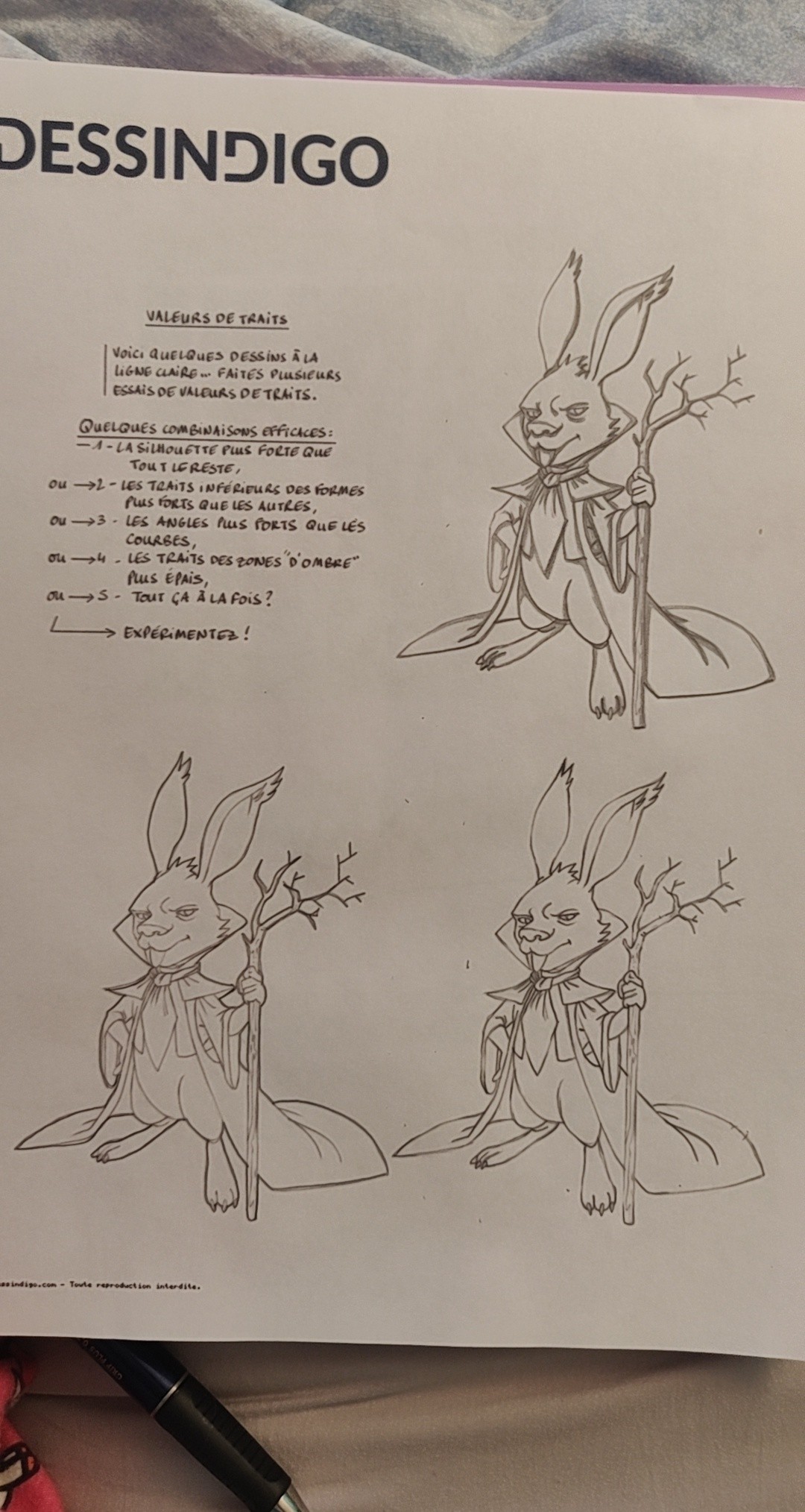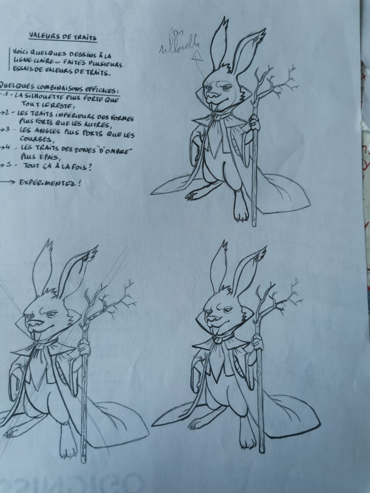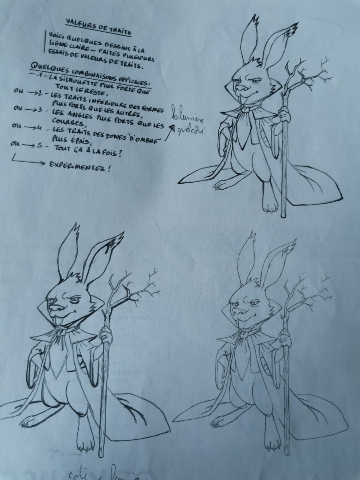 C'est du super travail tout ça ! Rien à dire sur ceux de la silhouette et des angles ^^ Celui des ombres est aussi très bien, je remarque que tu as choisi d'aller aus delà de juste épaissir les traits dans l'ombre, tu as fait des vraies ombres, un peu dans l'idée de l'exemple de Mike Mignola qui était dans le cours (même si lui il fait des zones d'ombre encore plus grandes). ça fonctionne très bien aussi :) Juste, en partant dans cette idée j'aurais noirci l'intérieur de la cape (la partie en bas pas autour de la tête), ça ferait une ombre cohérente. En tous cas bravo je valide :)