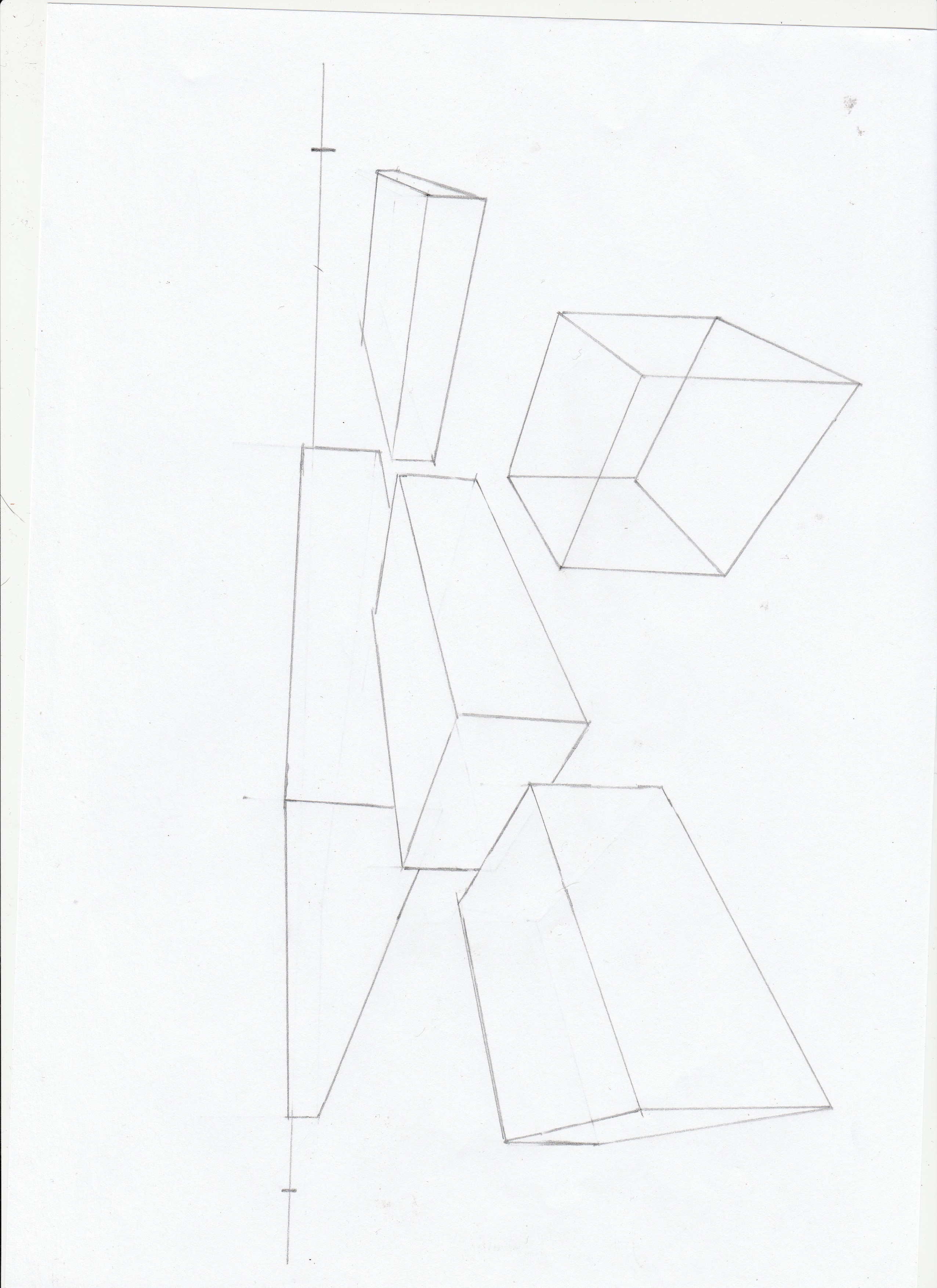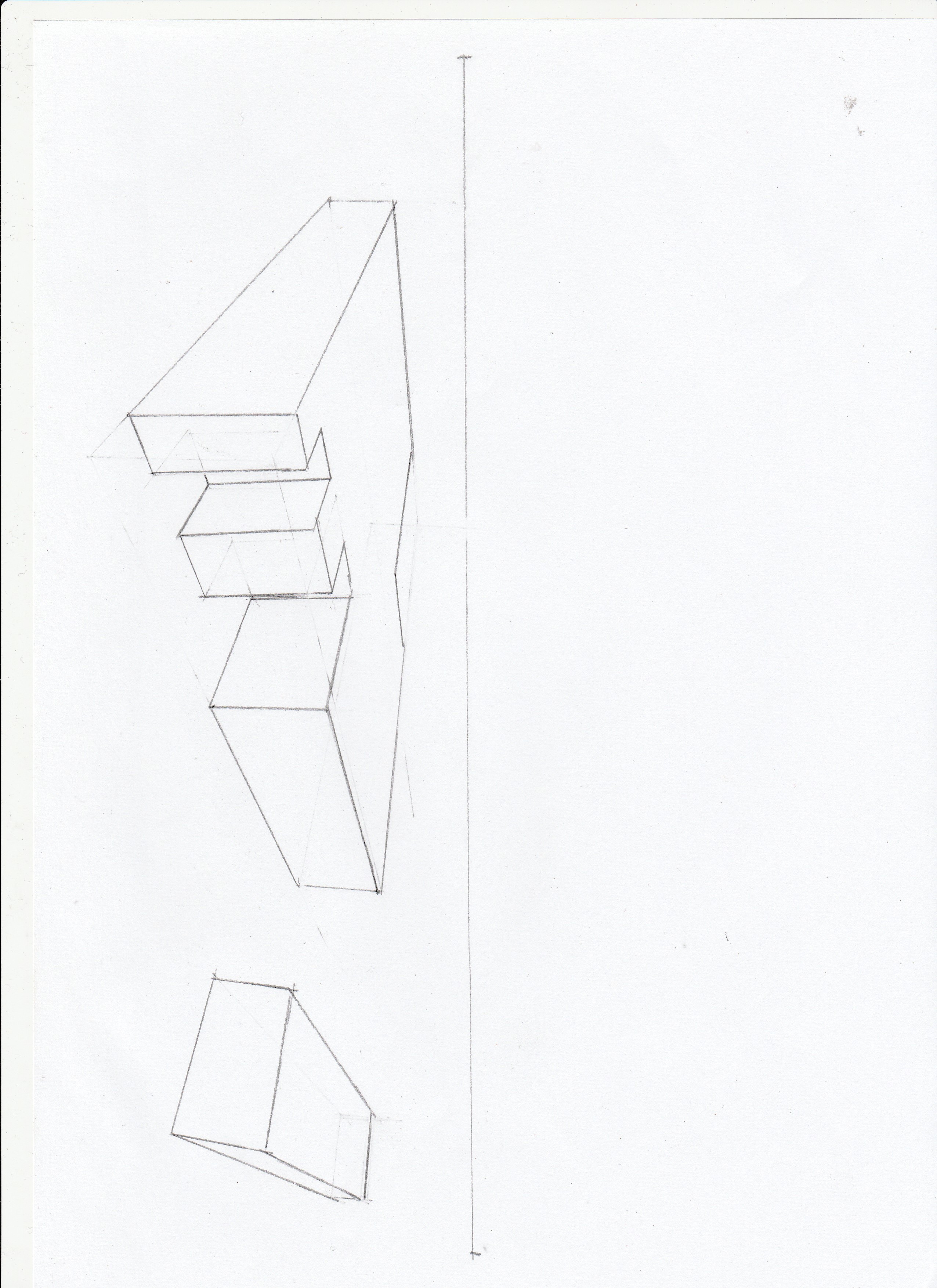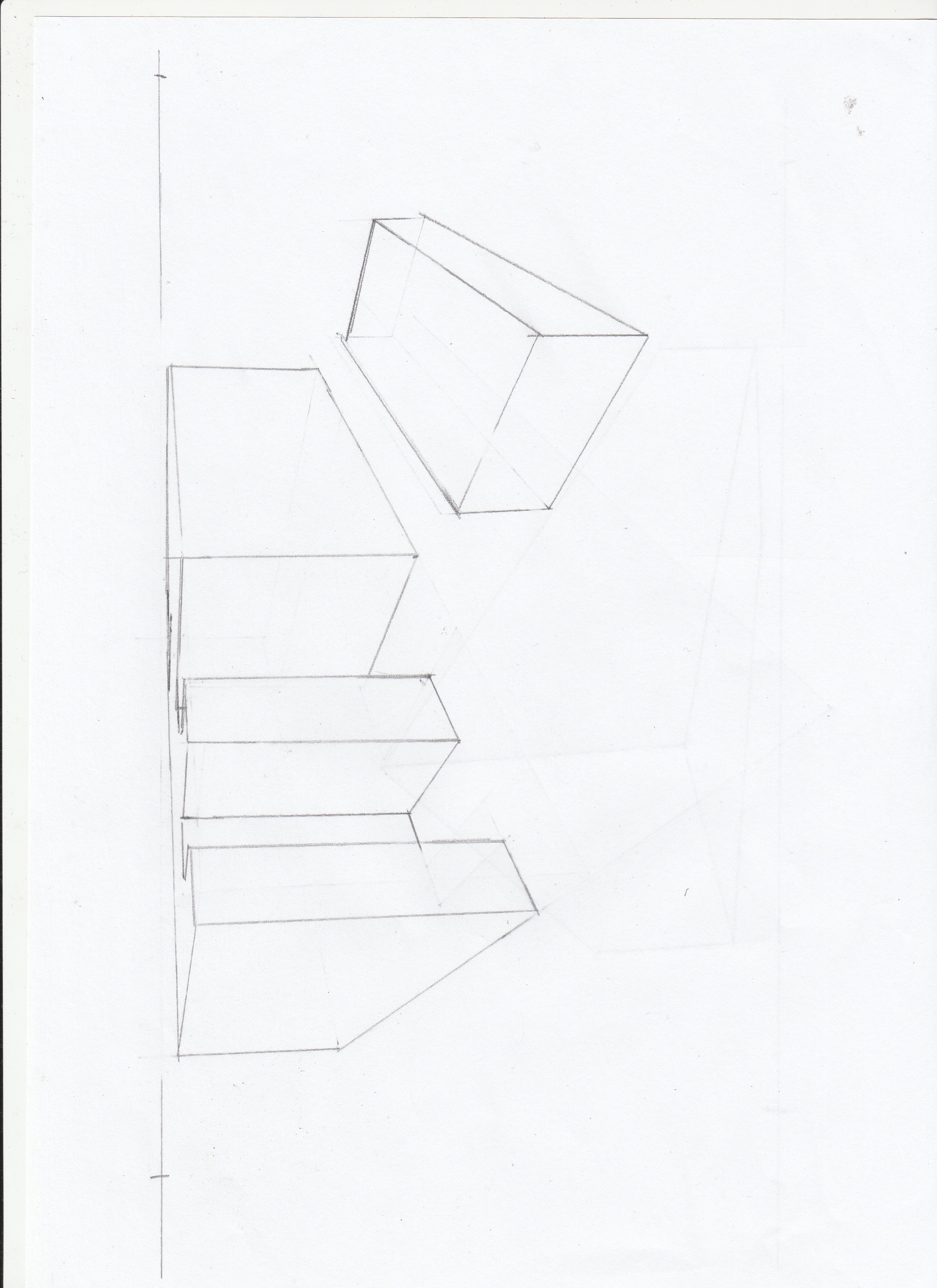 Necesitaría un punto de fuga si necesitara hacer ciertos detalles dependiendo de la pendiente (ventanas, por ejemplo) y, en este caso, espontáneamente, asustaría las líneas en la parte superior e inferior de los cubos para encontrar su intersección y, por lo tanto, el punto de fuga utilizado: 3
