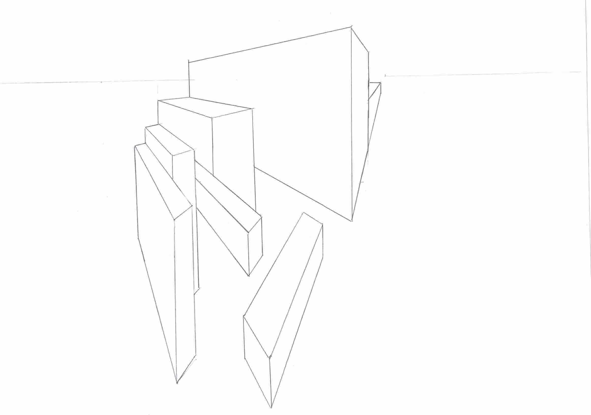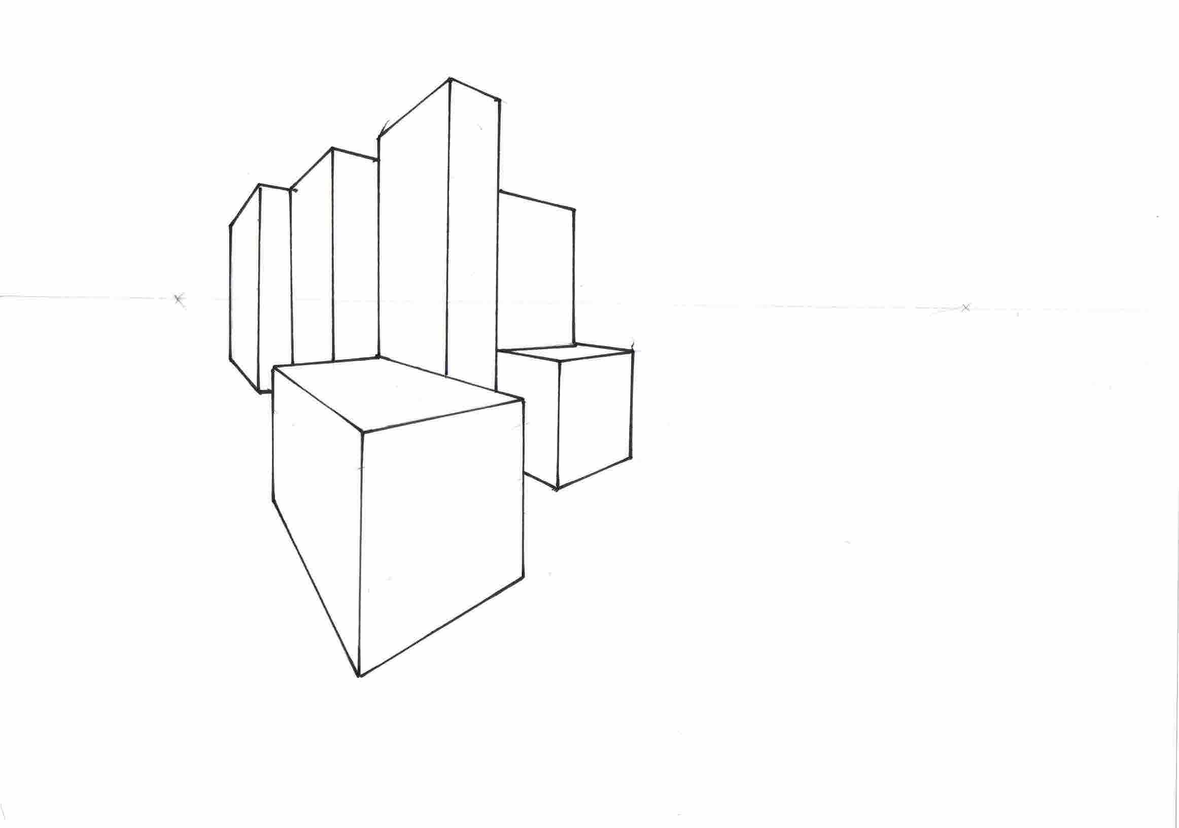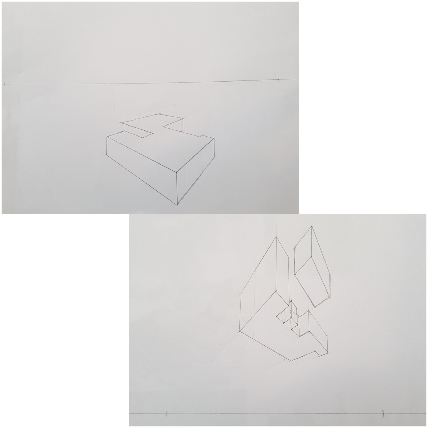 Voici mes deux essais pour les perspective à deux points de fuite. Comme j'ai choisi des dimensions de part et d'autre de la ligne d'horizon, j'ai fait l'arrière des forme en "transparence". Merci du retour ;)