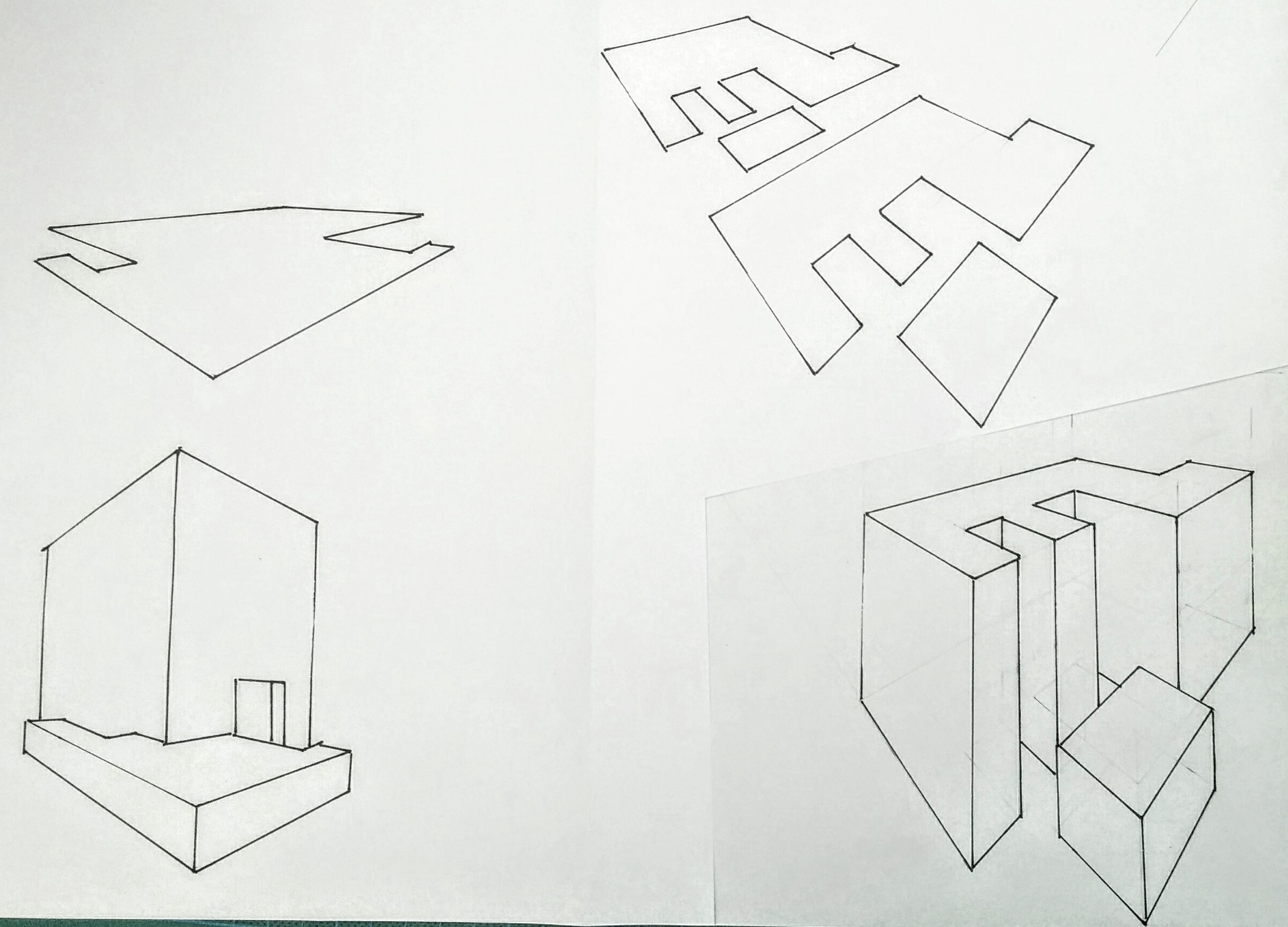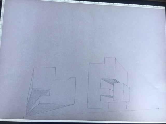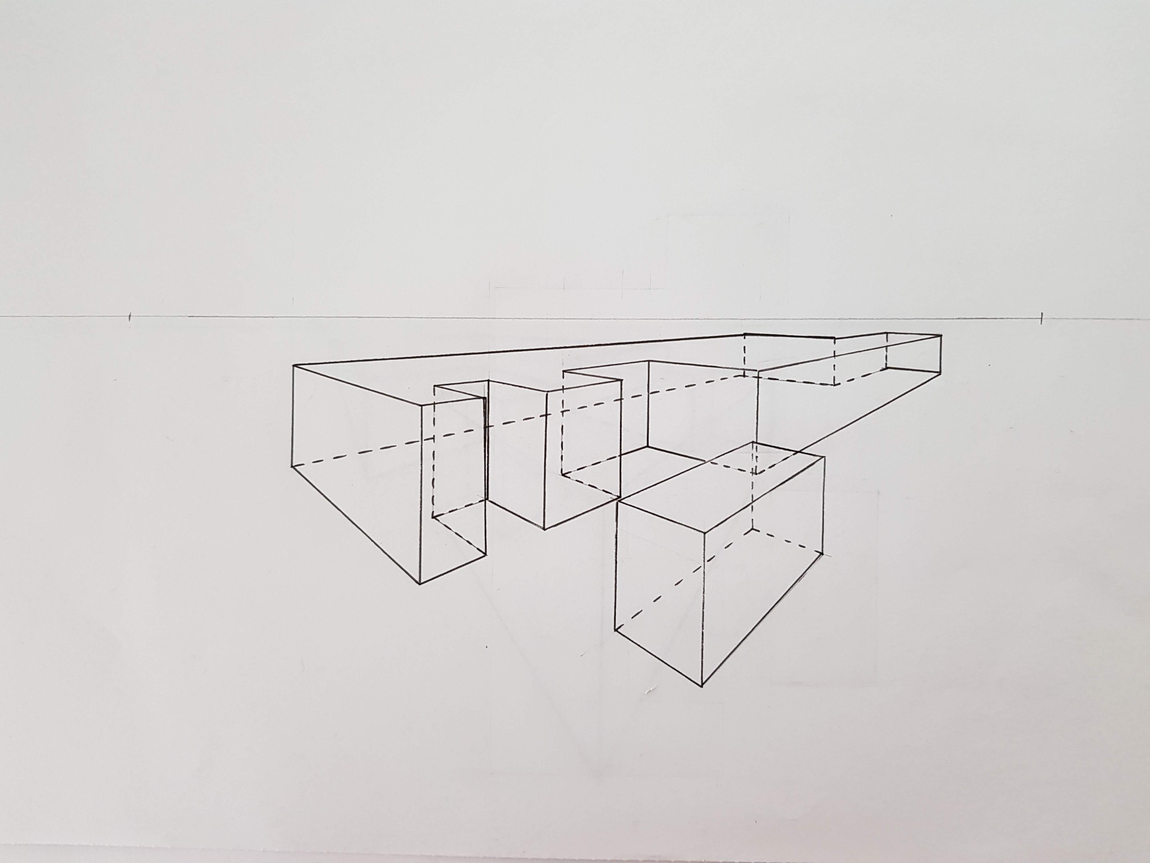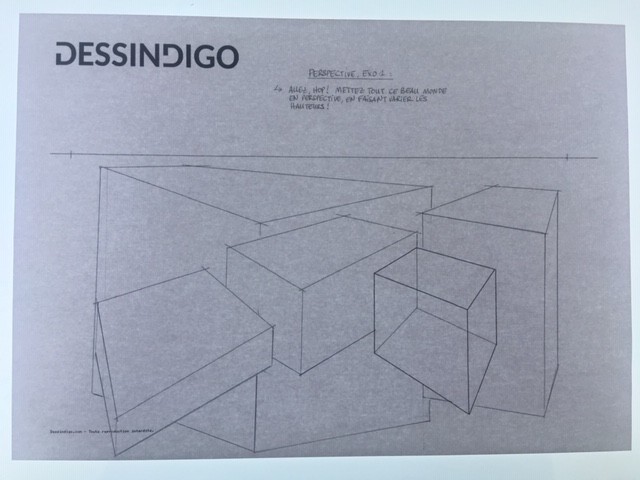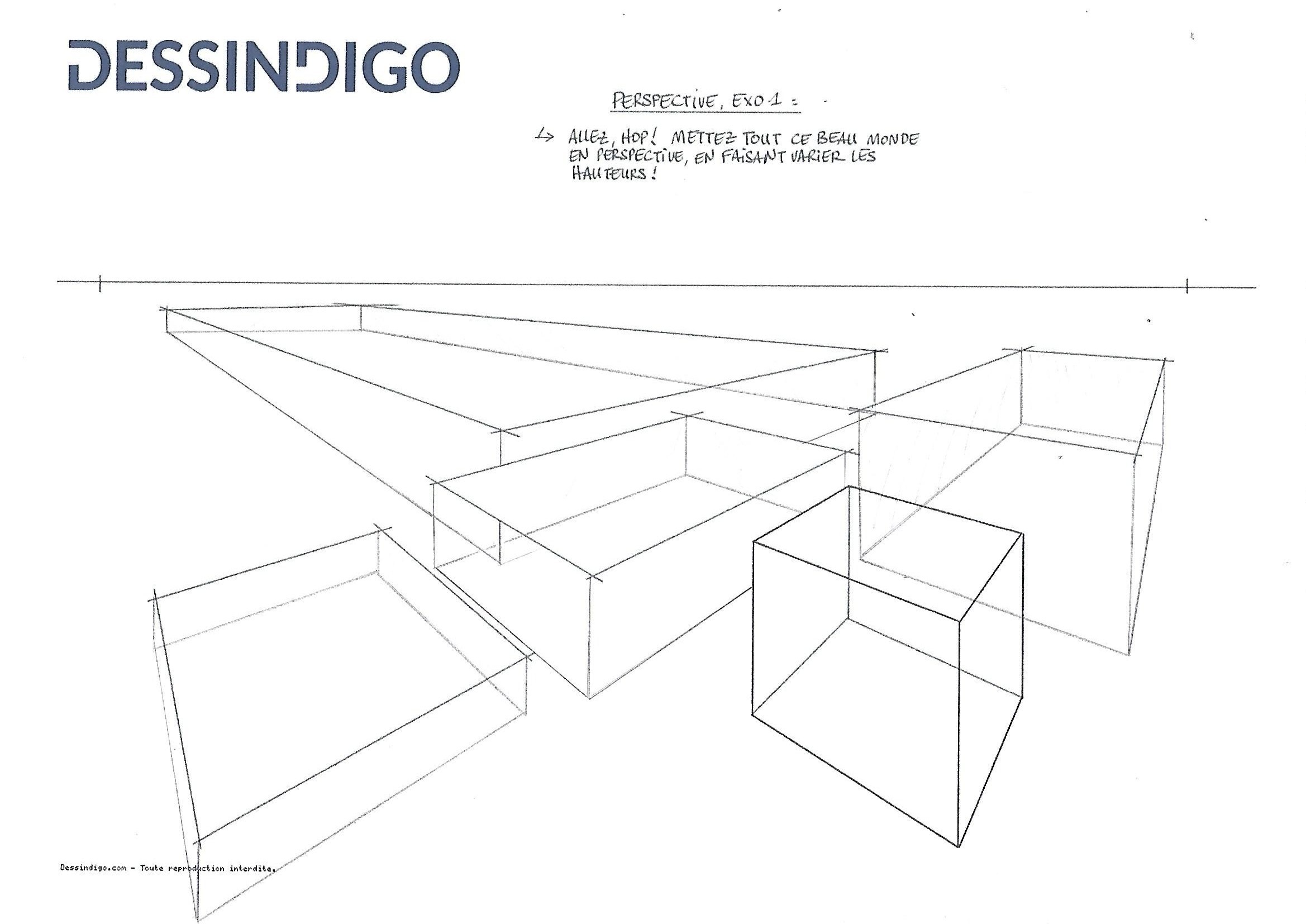 C'est la même "erreur" si on peut dire. En fait, indépendamment l'une de l'autre, tes deux formes sur chaque exo sont justes, car tu as fait pour chacune une perspective à 1 point de fuite (un seul point de fuite déforme ton objet), et chaque objet a son propre point de fuite, ce qui peut arriver s'ils ne sont pas alignés (quand on fait une pièce un peu en bordel par exemple, tous les éléments qui ne sont pas parallèles ou perpendiculaires entre eux, auront leur(s) propre(s) point(s) de fuite. Sauf qu'ici, les faces avant de tes objets sont bel et bien parallèles. Et c'est là tout le problème du coup je te fais un petit récap de ce qui change à mesure qu'on ajoute des points de fuite et tu vas pouvoir refaire les exercices (n'hésite pas à revisionner les vidéos de cours sur le sujet au besoin ou poser des question si tu bloques).