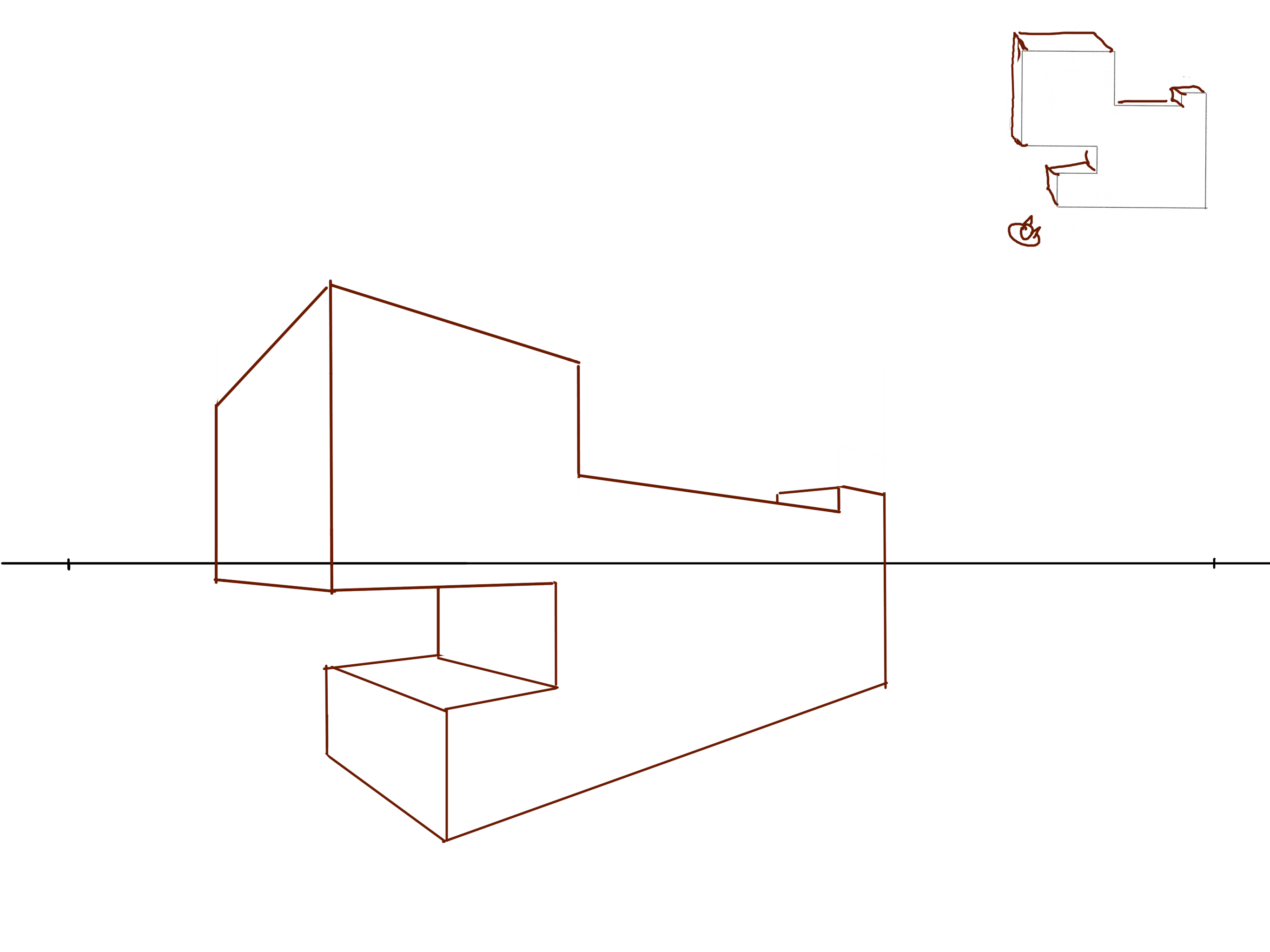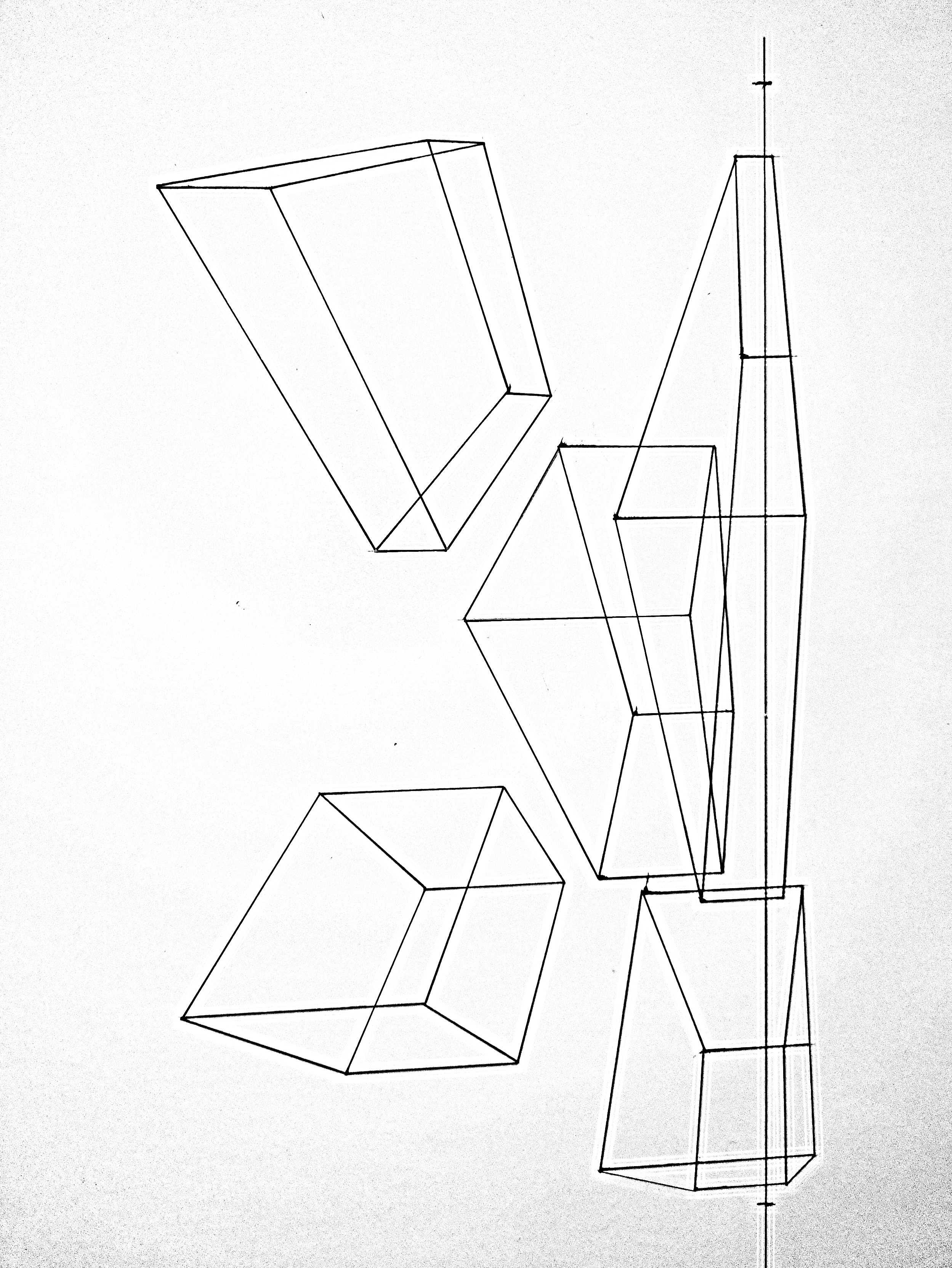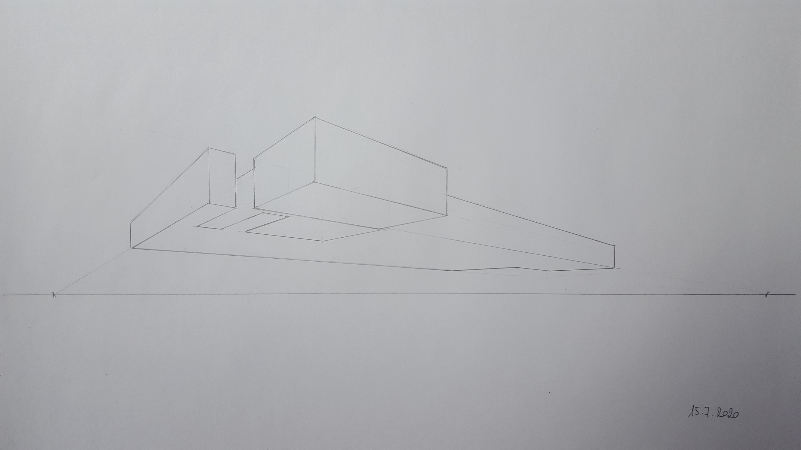 También tiene un ligero desplazamiento desde su punto de fuga a la izquierda, y la E de la forma izquierda no está alineada en todas partes (no he corregido este defecto en la alineación, solo problemas de perspectiva). Te hago hacer tu forma básica siguiendo bien tus puntos de vuelo, luego subes todas tus verticales y vuelves a disparar tus líneas a los puntos de vuelo.