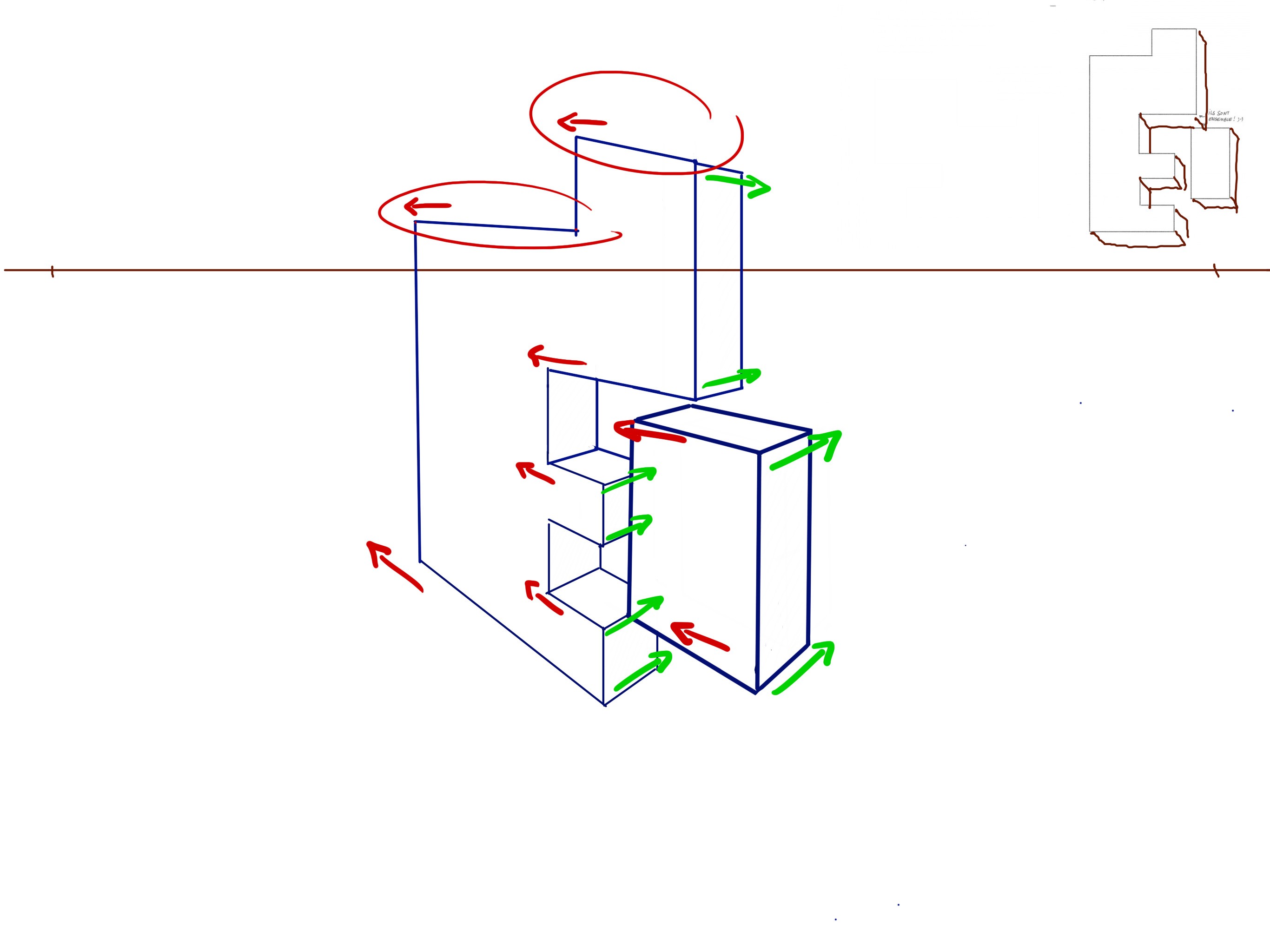 Le 3 : Là c'est un souci de compréhension car c'est une perspective impossible que tu me montres. Tu ne peux pas voir à la fois la face droite et gauche d'un objet relativement rectangulaire.