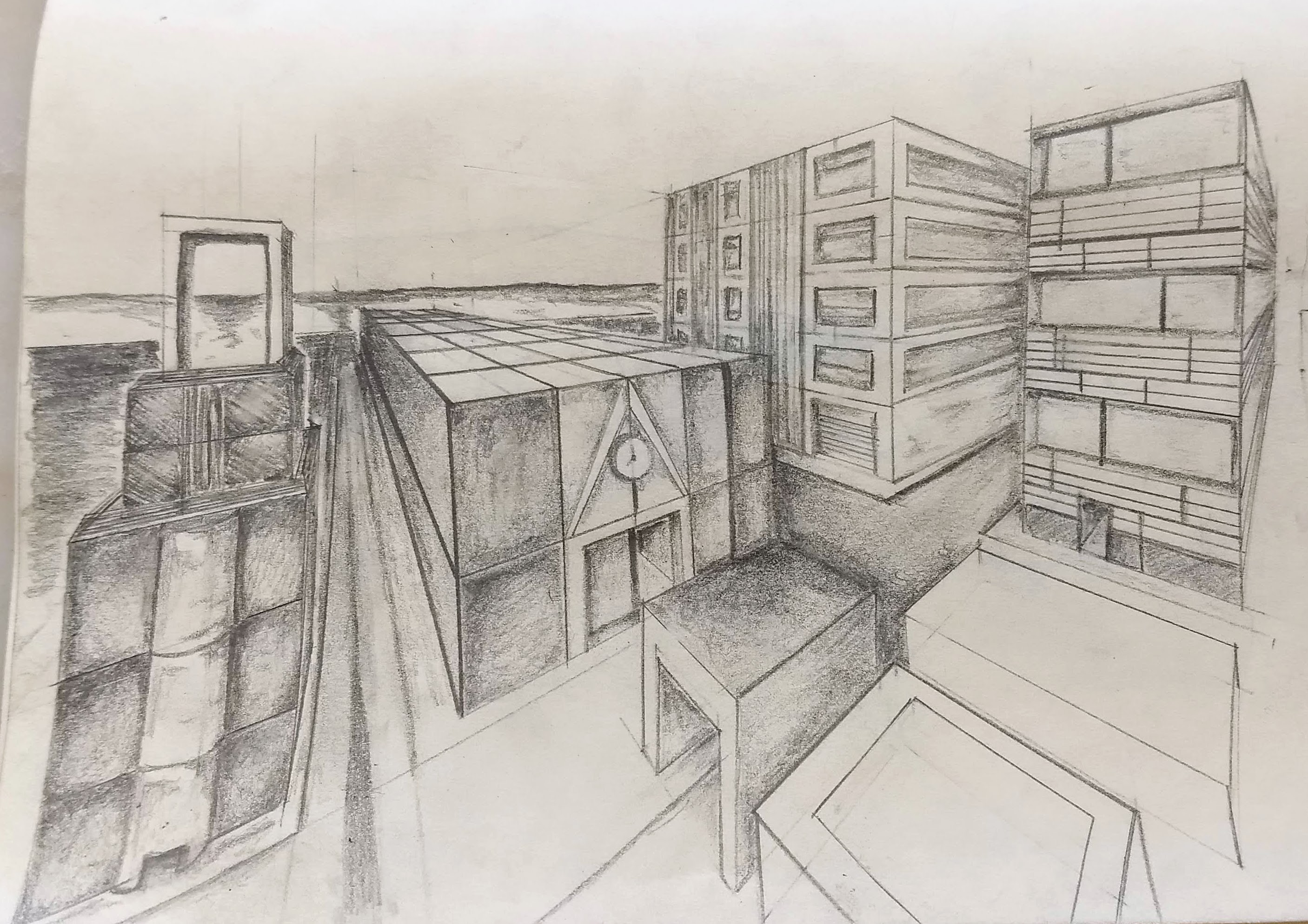 En terme de perspective on est bon :D Tu as pas mal géré les valeurs de gris, même si à certains endroits (le sol sur la partie droite par exemple), ça aplatit tout et est un peu moins bien géré (il aurait fallu ne pas mettre d'ombre portée pour que ça marche mieux). Pour les immeubles, tu as un article sur le blog qui pourrait t'intéresser, pour les rendre plus crédible (rédigé par moi en plus hohoho). Là je vois que tu as pris des blocs simples et tu as plaqué à plat des éléments (un peu comme on plaque une texture en 3D sur une forme simple pour donner l'illusion de...). Il aurait fallu creuser les fenêtres, faire ressortir les balcons, etc. Je ne doute pas que tes prochains dessins seront encore plus réussis ;p