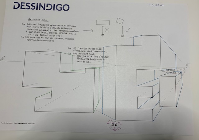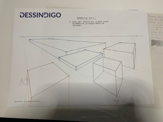 Aquí está el exo 1 en la perspectiva. Hay algunas líneas que se cierran al edificio en la parte inferior izquierda (naranja). Quería un edificio más alto debido a los demás. Pero no estaba muy dónde colocar mi punto de fuga a la izquierda 🤓 Sin embargo, puse meslunettes esta vez 😅. ¿Una opinión (sobre todo)?