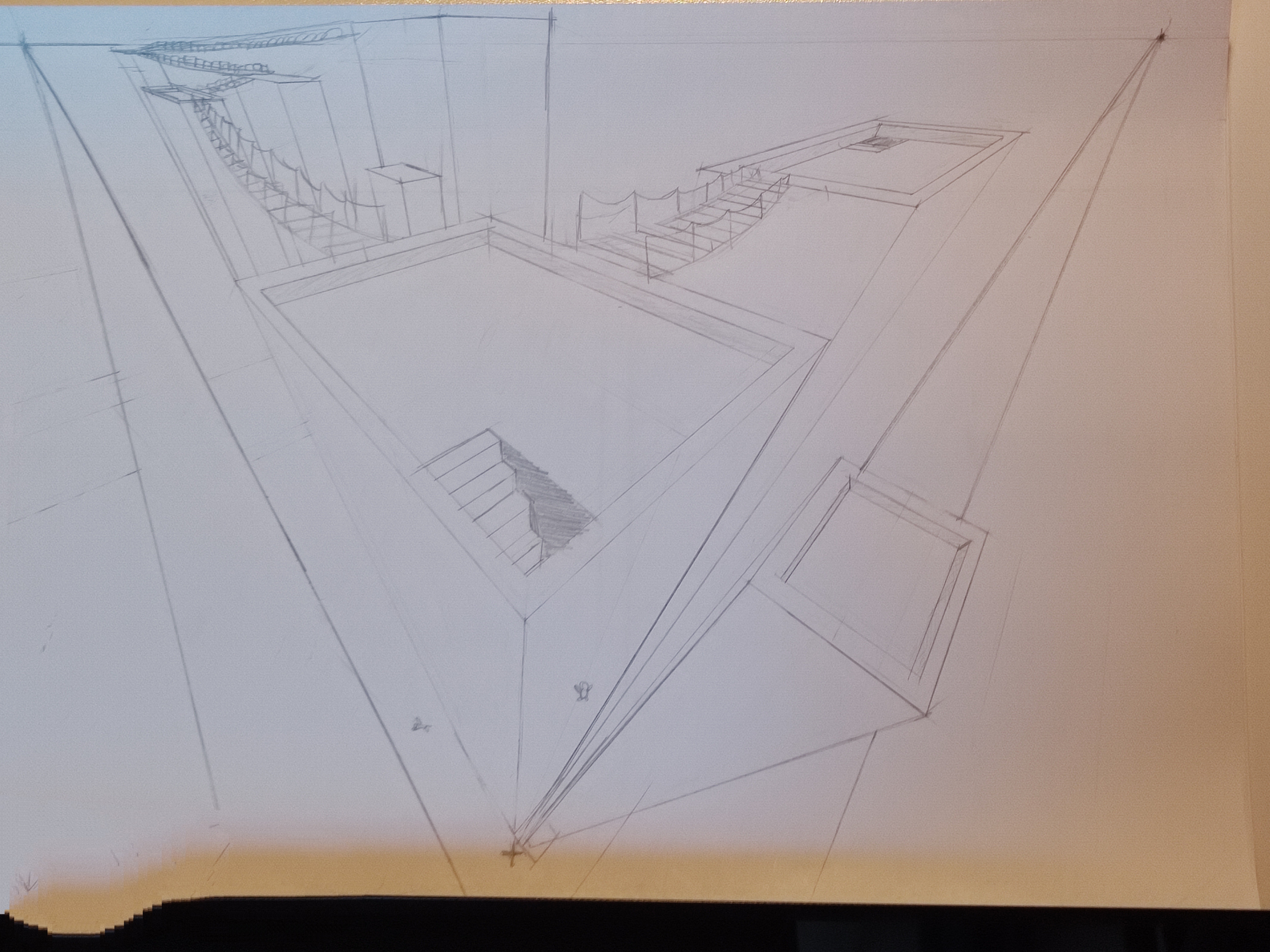 Cela n'a pas de rapport avec les exercices mais j'ai fait un dessin de perspective a 3 points fuite