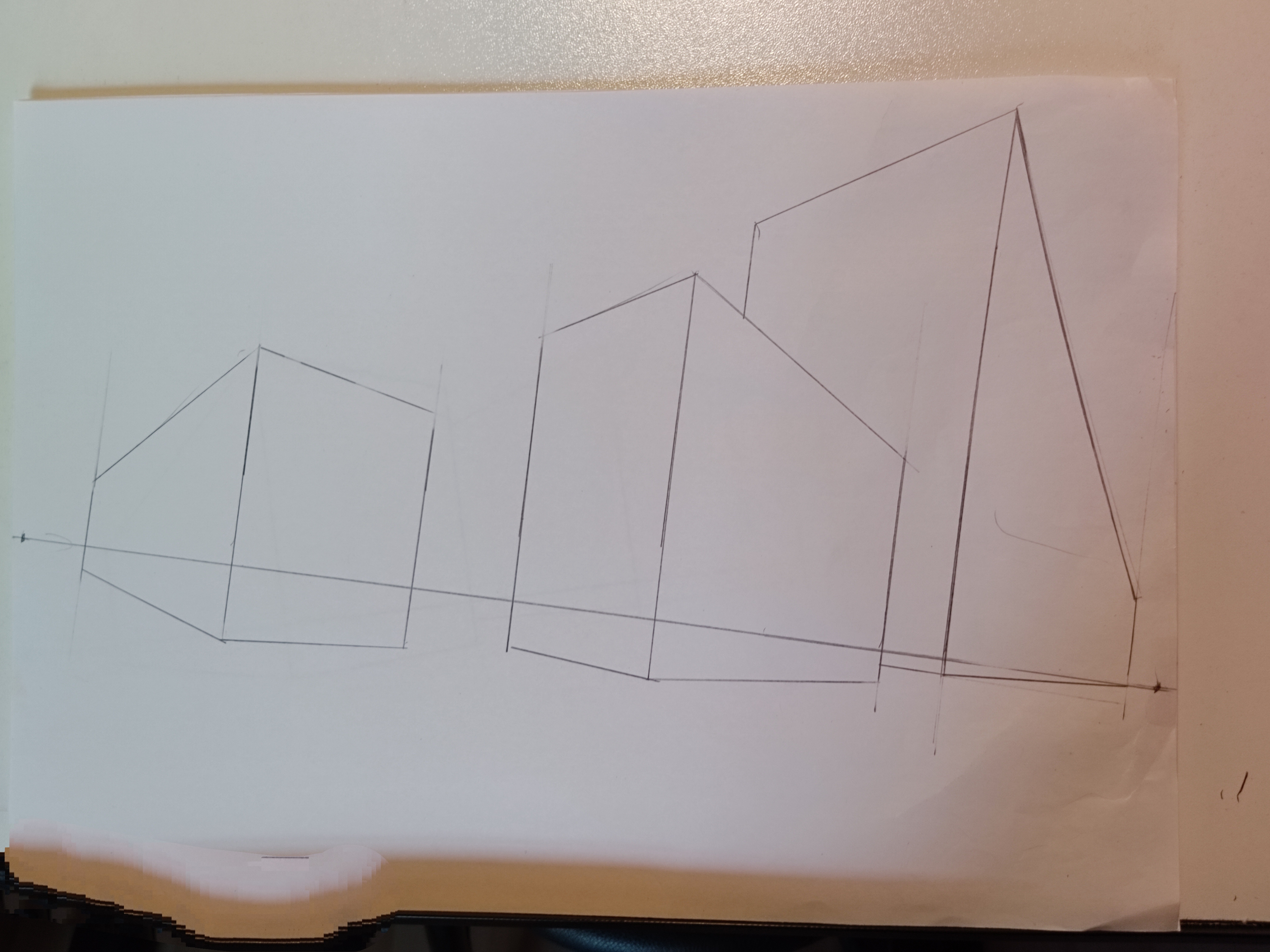 Voici l'exo 1 sur la perspective. Il y a quelques lignes qui me chiffonnen sur le bâtiment en bas à gauche (orange). J'ai voulufaire un bâtiment plus haut par à rapport aux autres. Mais je n'étais pas très sur où placer mon point de fuite sur la gauche 🤓 pourtant j'ai mis meslunettes cette fois 😅. Un avis (sur tout en fait)?