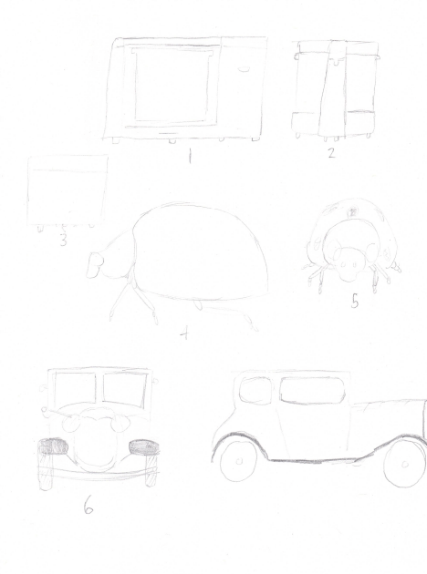 Le robot ménager est pas mal du tout! Le premier cylindre est un poil pas assez large, mais sinon c'est très bien! Fais juste attention à tes traits, il faut qu'ils soient plus droits 😉 La coccinelle est elle aussi très bien, la tête+le cou sont peut être un poil trop grands sur la vue 5! La voiture est cool! Fais juste attention à la symétrie sur ce genre d'objet!