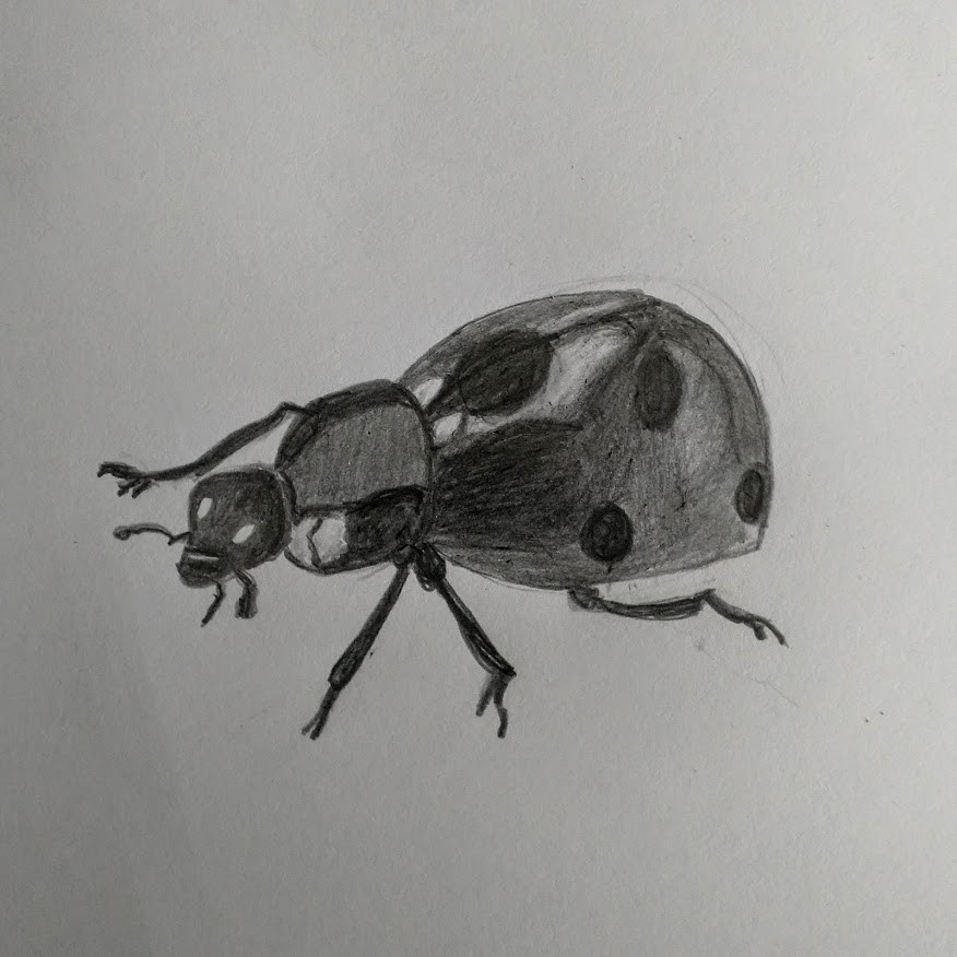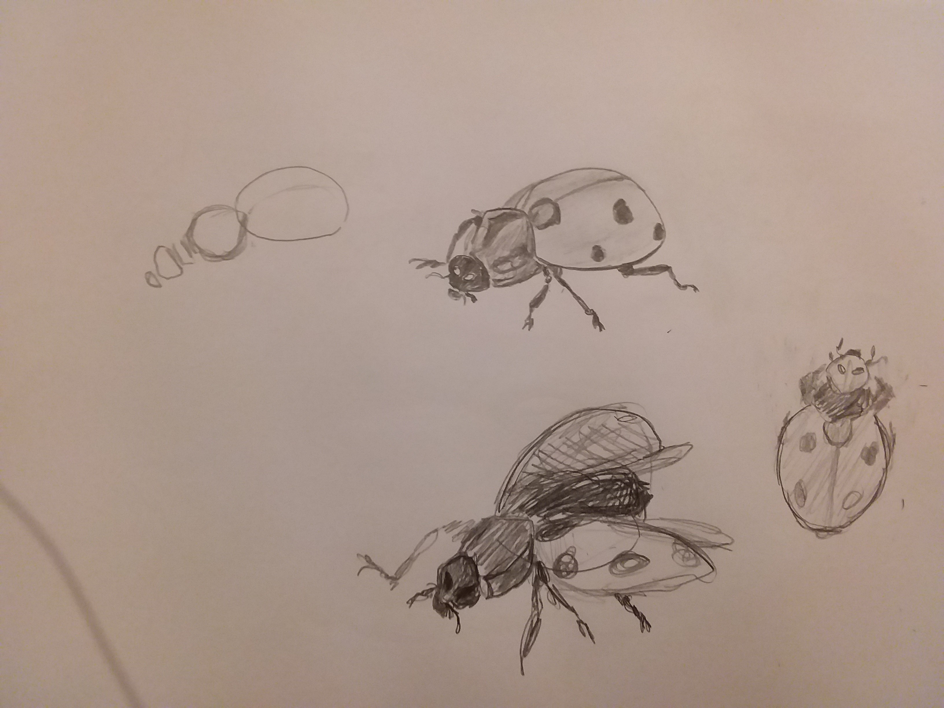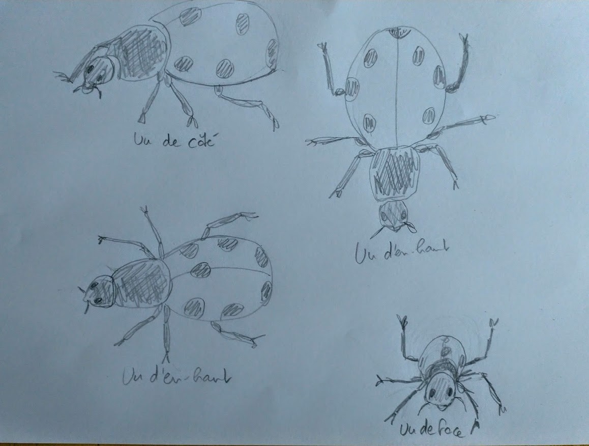 Tout d'abord il va falloir que tu fasses bien attention au cou de la coccinelle, sur la plupart de tes vues il est trop allongé je te conseille de bien re-observer la référence! Pour la vue de face tu as eu deux soucis : les pattes arrières qui se dirigent vers le haut, et son corps est très fin, n'oublie pas que tu dessines une coccinelle qui a donc un corps bombé et volumineux!