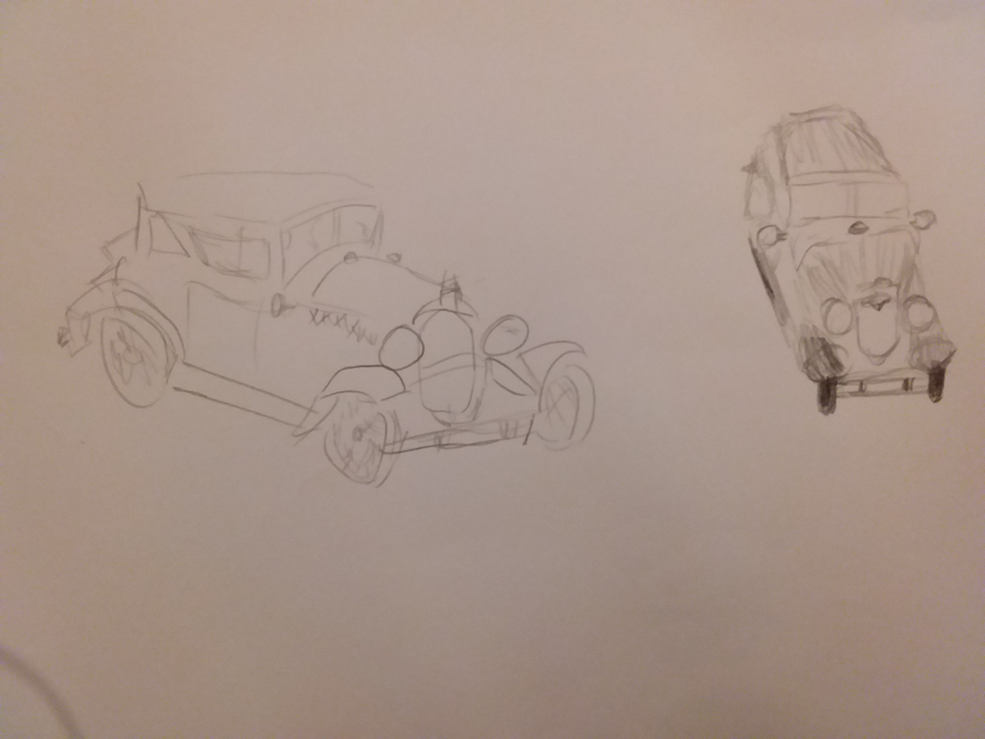 Voilà un premier jet du dessin d'observation de la voiture. Aïe! Ce n'est vraiment pas très concluant.