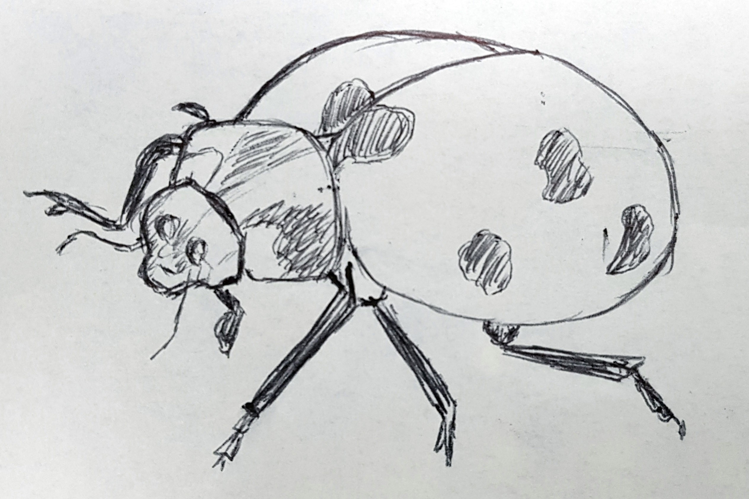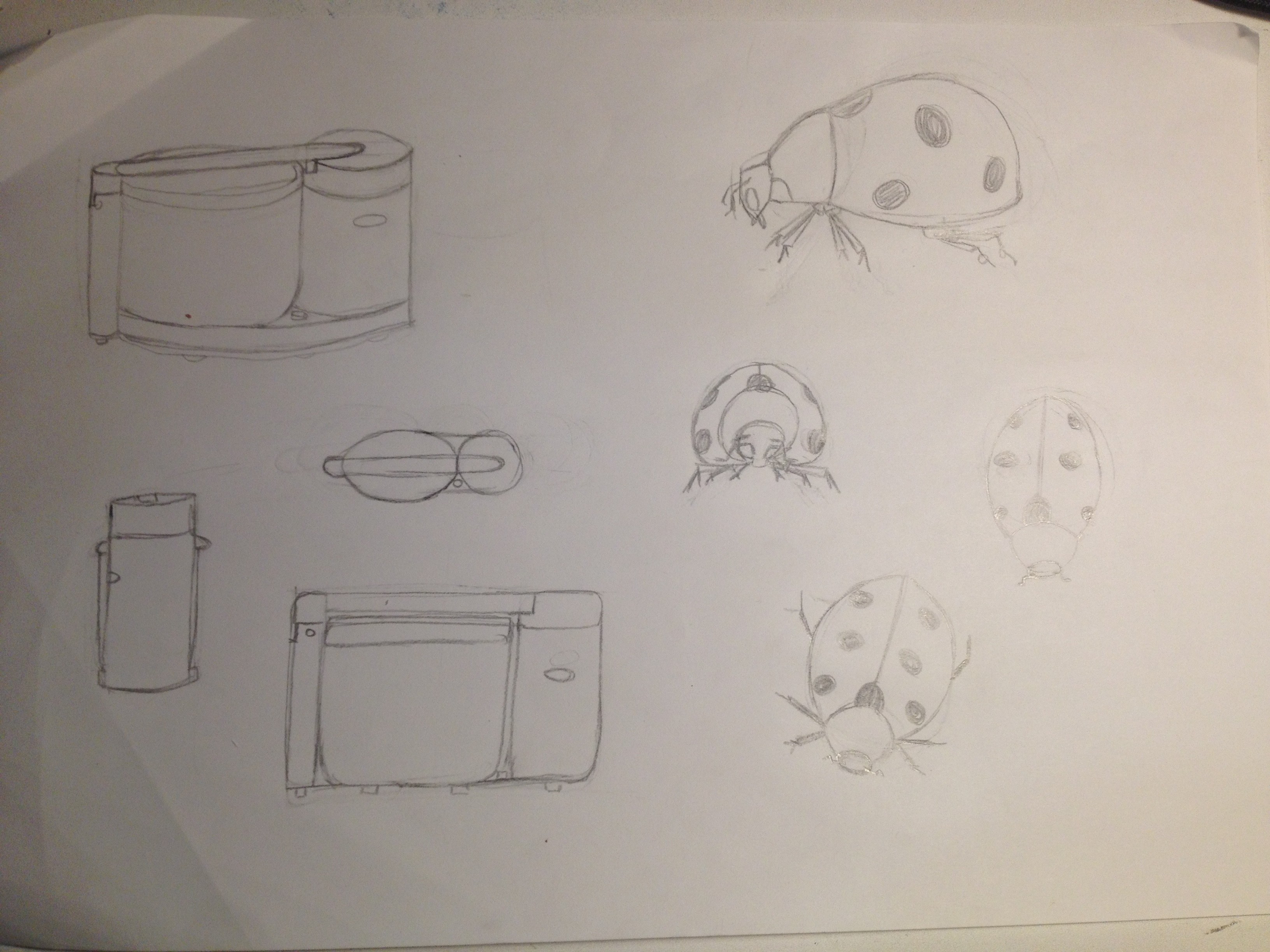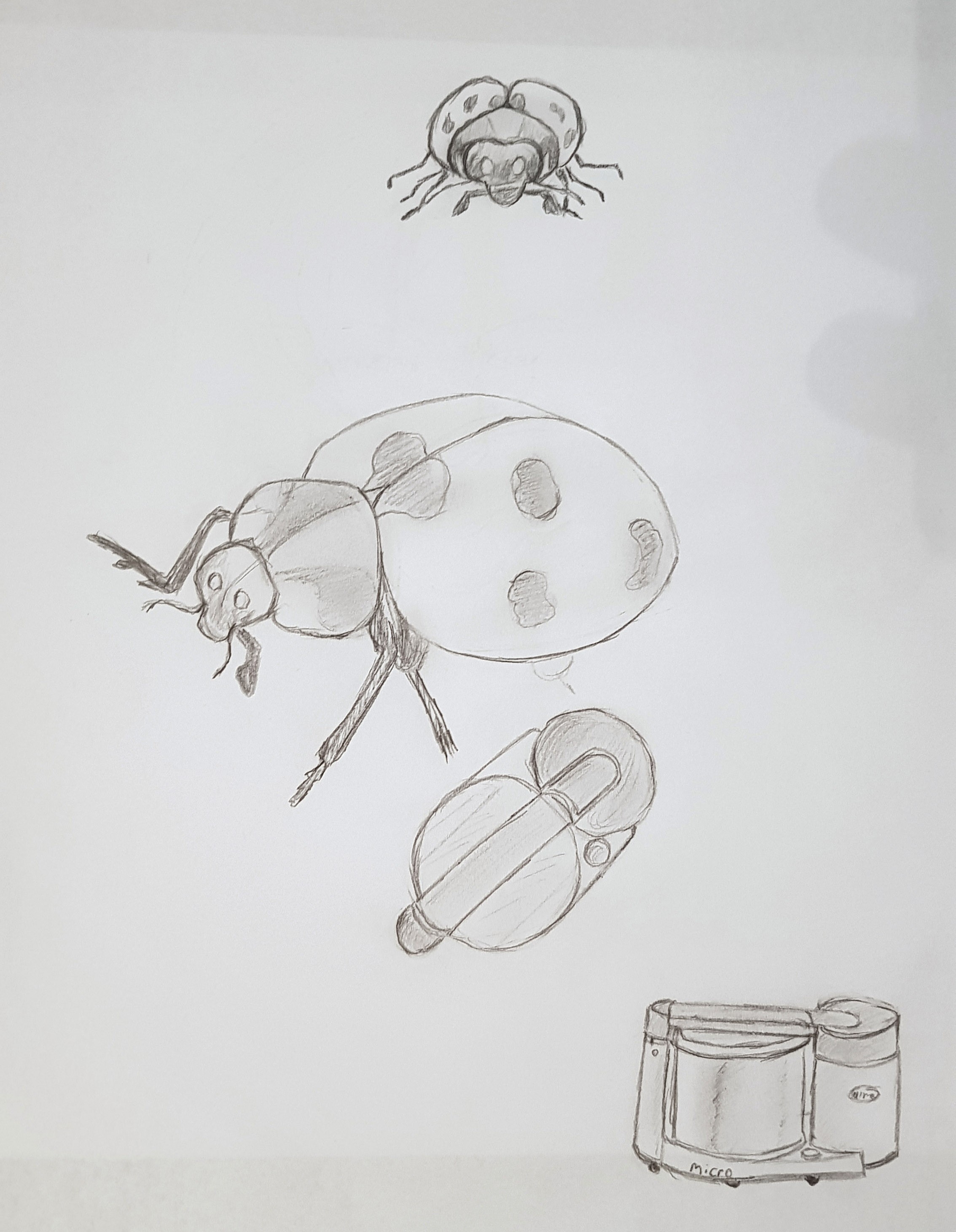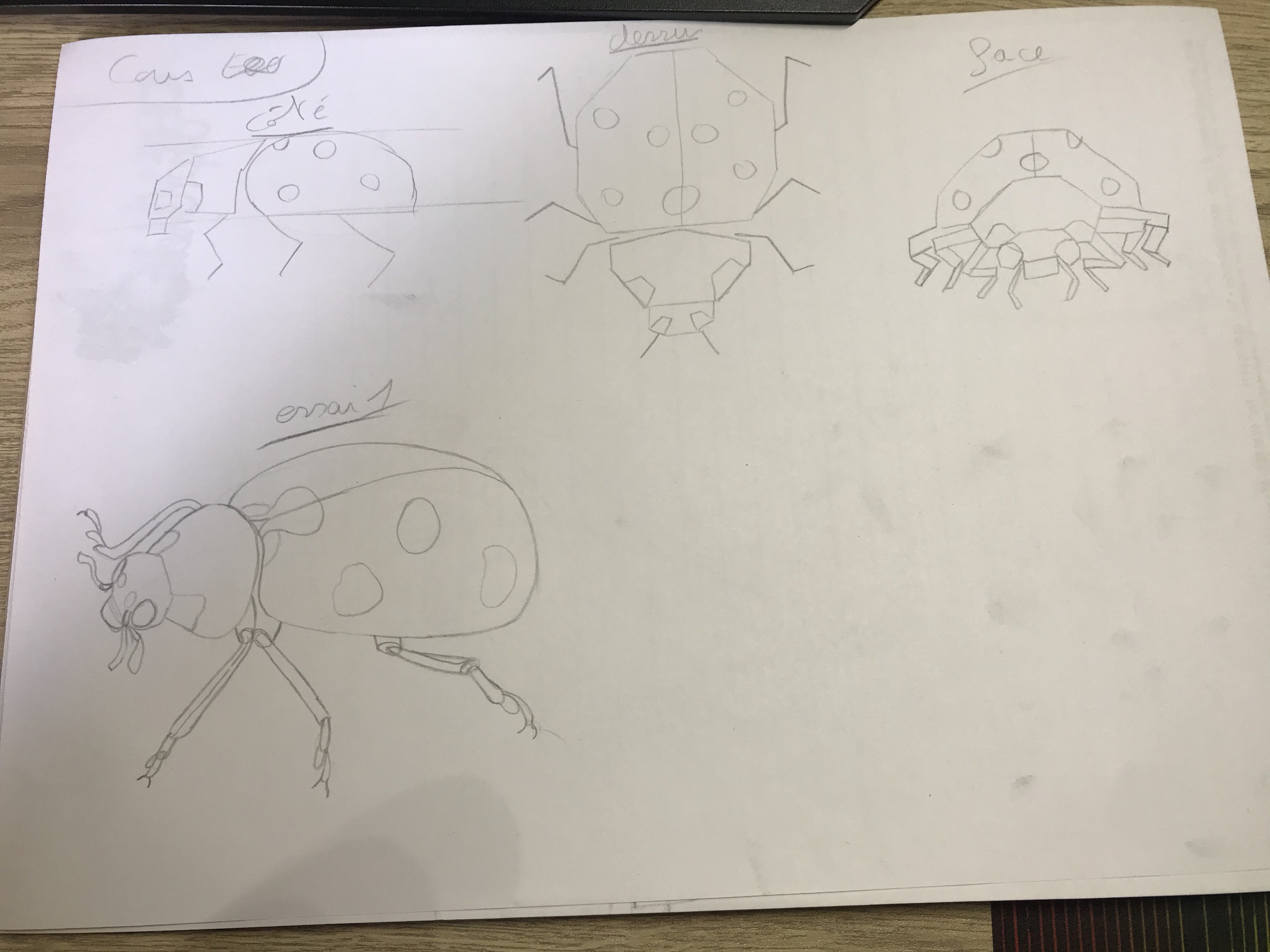 Pour le Robot, je pense avoir bien compris les formes. En ce qui concerne la coccinelle, c'est moins évident. J'ai commencé à dessiner ce que je voyais avant d'essayer de la représenter sous un autre angle.