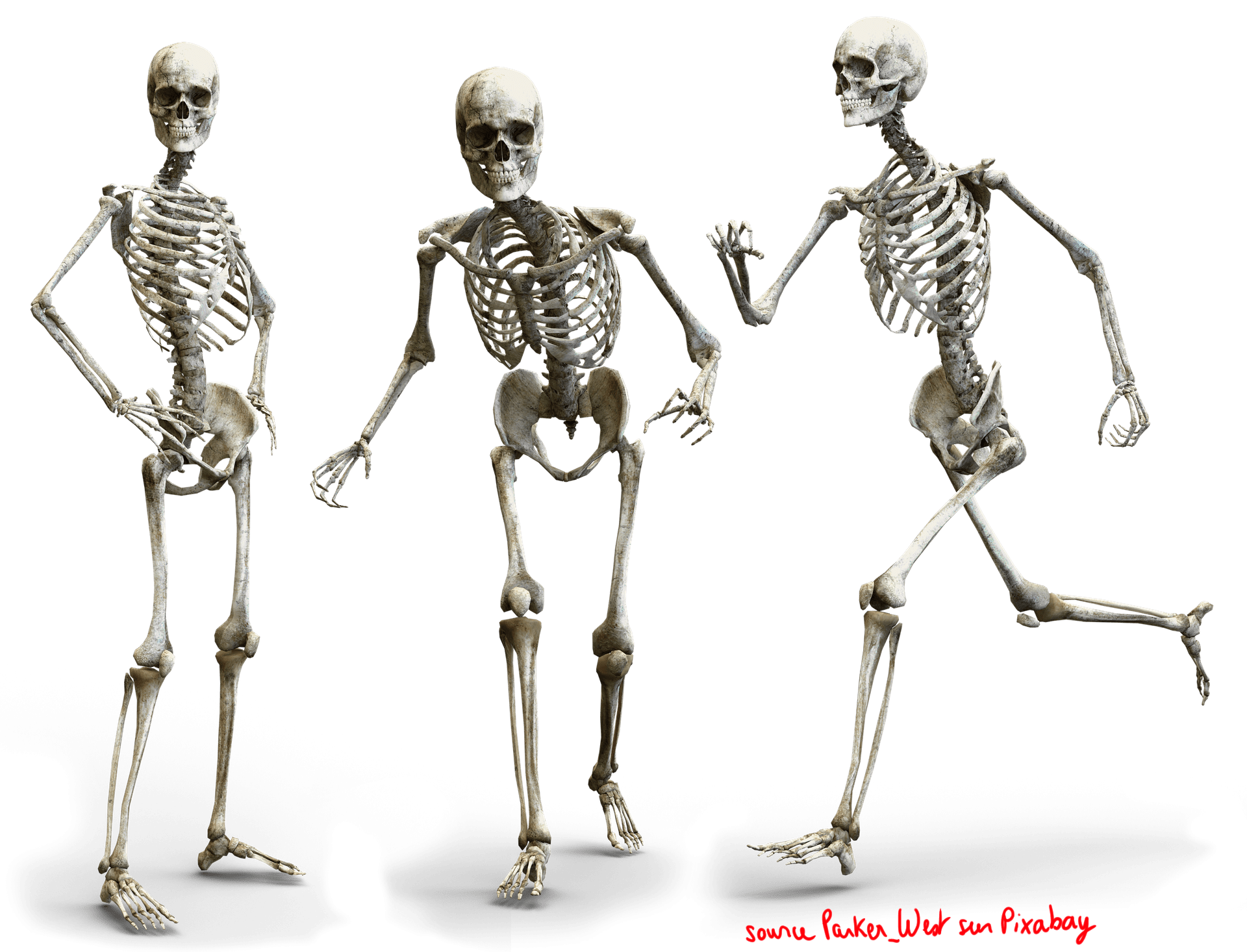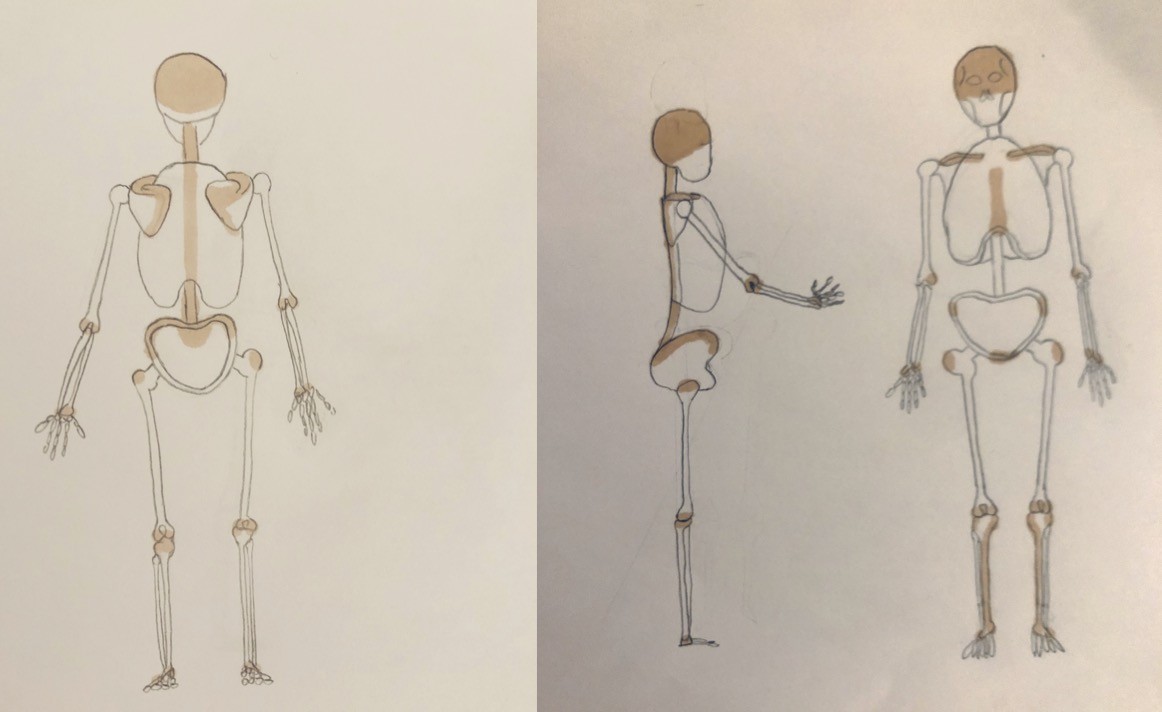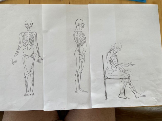 Beau travail sur la structure ! Attention juste à l'oubli des rotules sur la vue de face (ce sont des points de repère des genoux utiles) et pour les vues de profil il manque la continuité de la colonne à l'arrière du bassin (le coccyx) qui permet de bien se visualiser toute la courbure. Bravo en tous cas :)