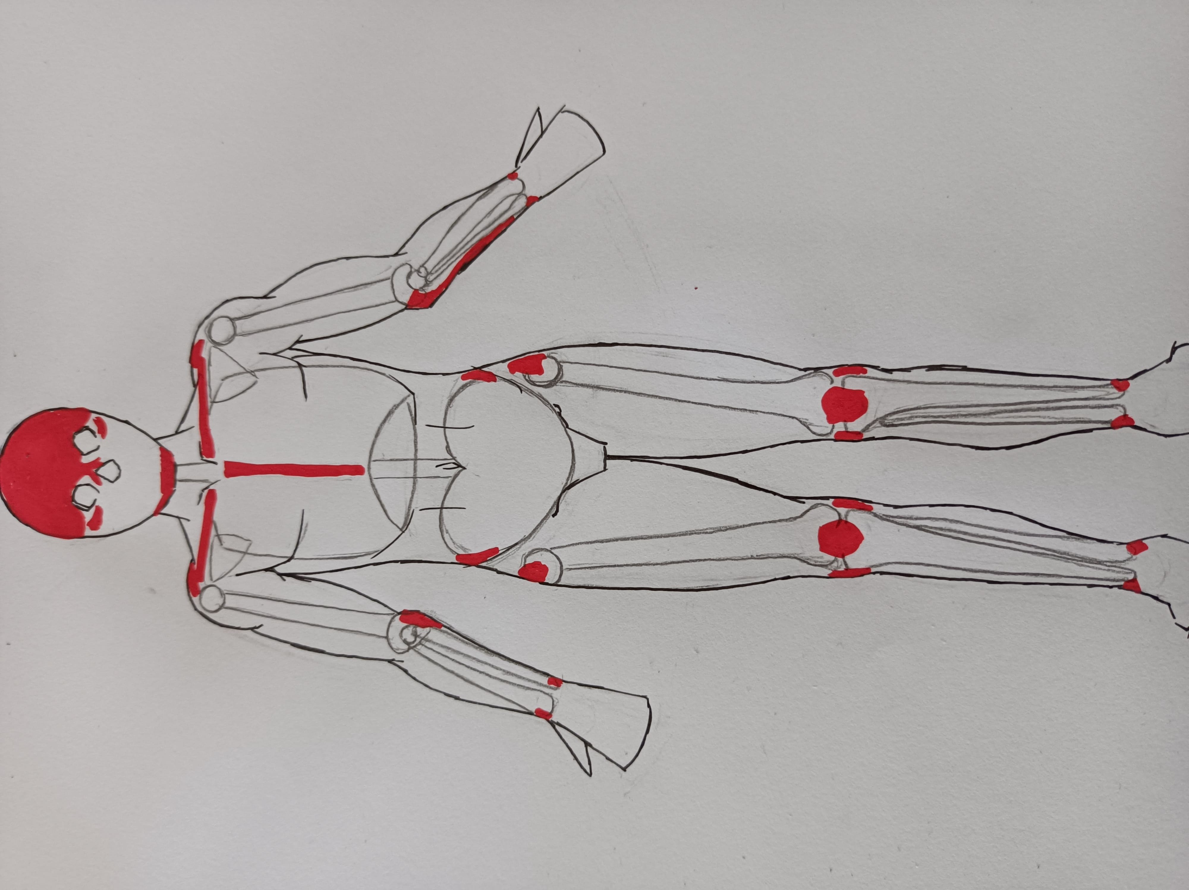 ¡Hola Corto-34! ¡Es bastante bueno! Tenga cuidado con la alineación de los elementos del cuerpo. Además, la caja torácica es demasiado pequeña y los huesos de los muslos que están demasiado redondeados. Además, los huesos de la parte inferior de las piernas deben ser perpendiculares al suelo. De lo contrario está bien construido :)