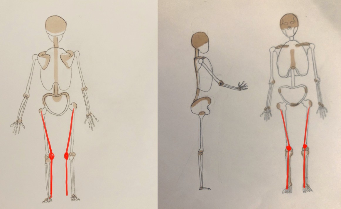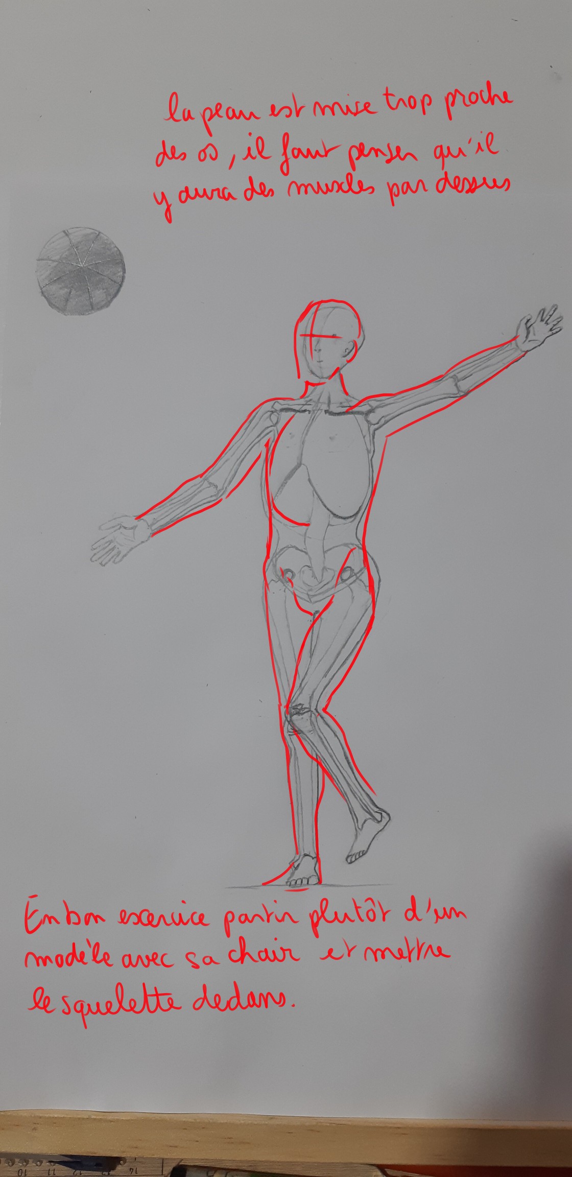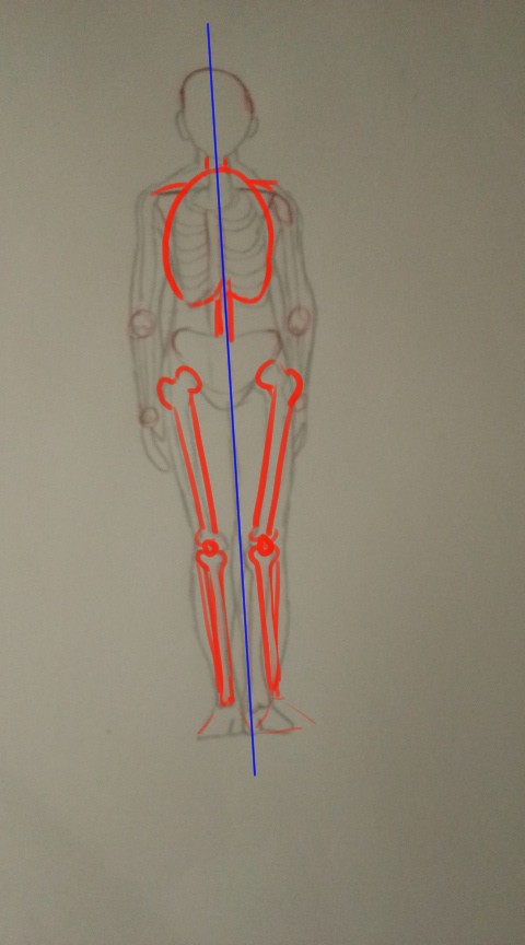 C'est bien compris :) Attention juste aux os des jambes. On a les hanches plus large que l'écartement de nos pieds quand on se tient droit. Ce qui fait que les os des cuisses rentrent vers l'intérieur, et ce sont les os de bas des jambes qui sont perpendiculaires au sol. J'ai mis des indications sur le dessin ^^