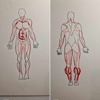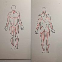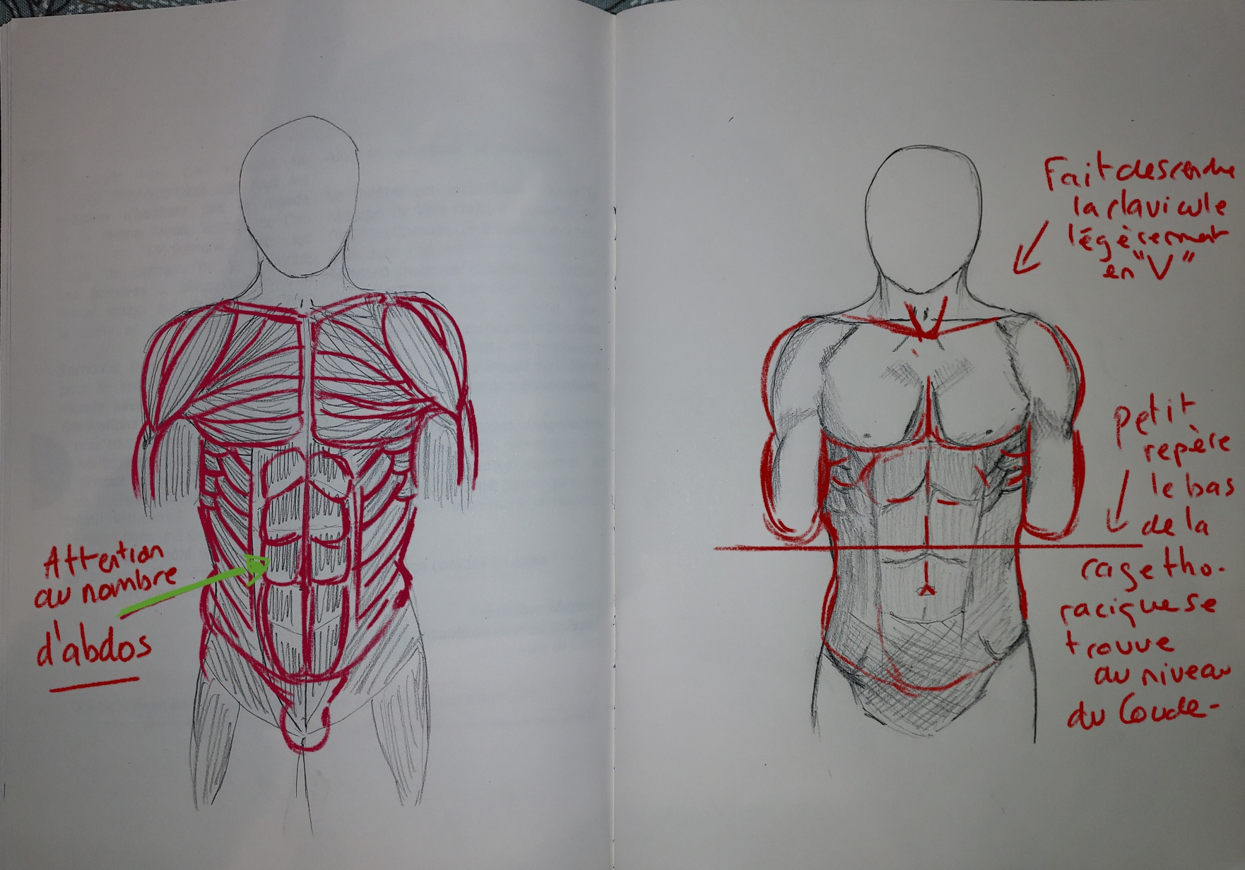 Fait attention au nombre d'abdominaux, sur ton écorché tu en as rajouté une paire ! Le second dessin est très bien aussi, essaie de faire partir la clavicule légérement en "V", et petit repère pour t'aider dans tes proportions: le bas de la cage thoracique correspond au niveau des coudes 😀