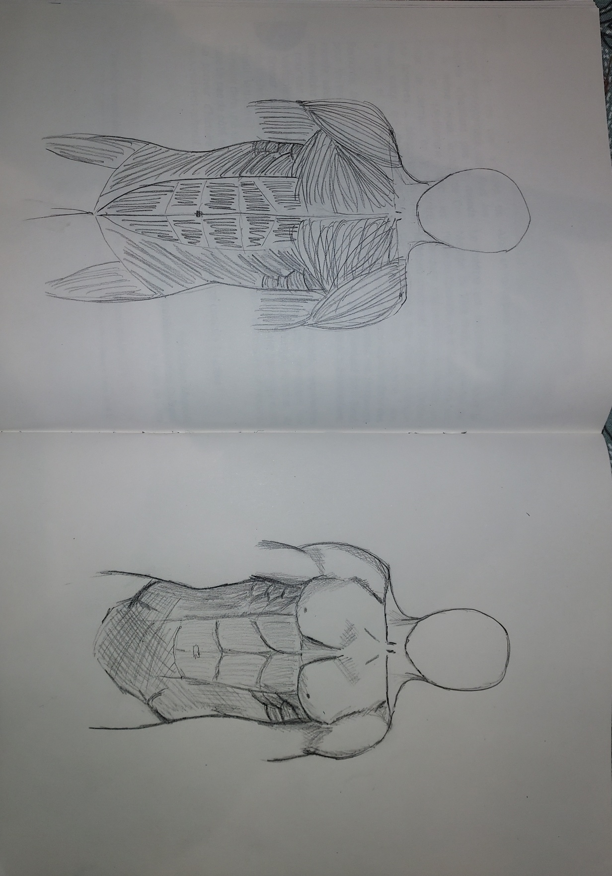 Presta atención a la cantidad de abdominales, en tu piel has agregado un par. El segundo dibujo también es muy bueno, trate de hacer que la clavícula se vaya en "V" y un pequeño punto de referencia para ayudarlo en sus proporciones: el fondo de la caja torre de costilla corresponde al nivel de los codos 😀