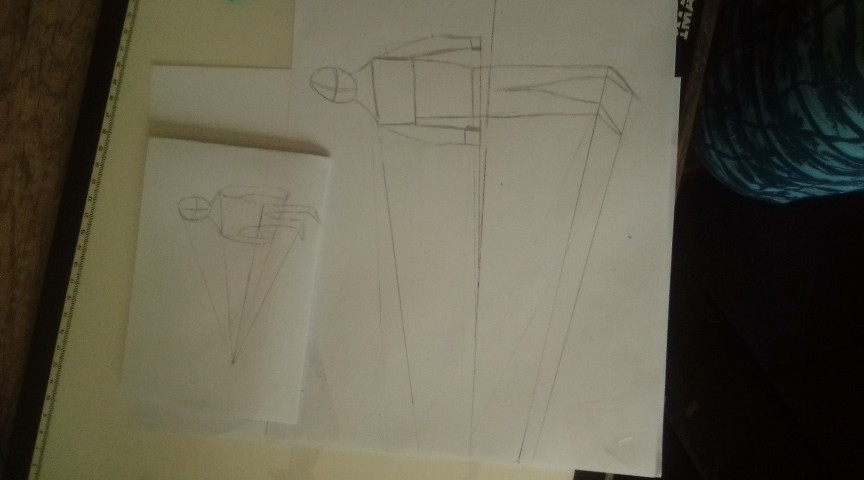 Tu t'en es bien sorti pour l'inclinaison des éléments dans la perspective MAIS ton personnage a l'air d'être un panneau en bois en forme d'humain, il n'a pas de volume ! Il ne faut penser boîtes et essayer de synthétiser le corps en plein de formes de boîtes :)