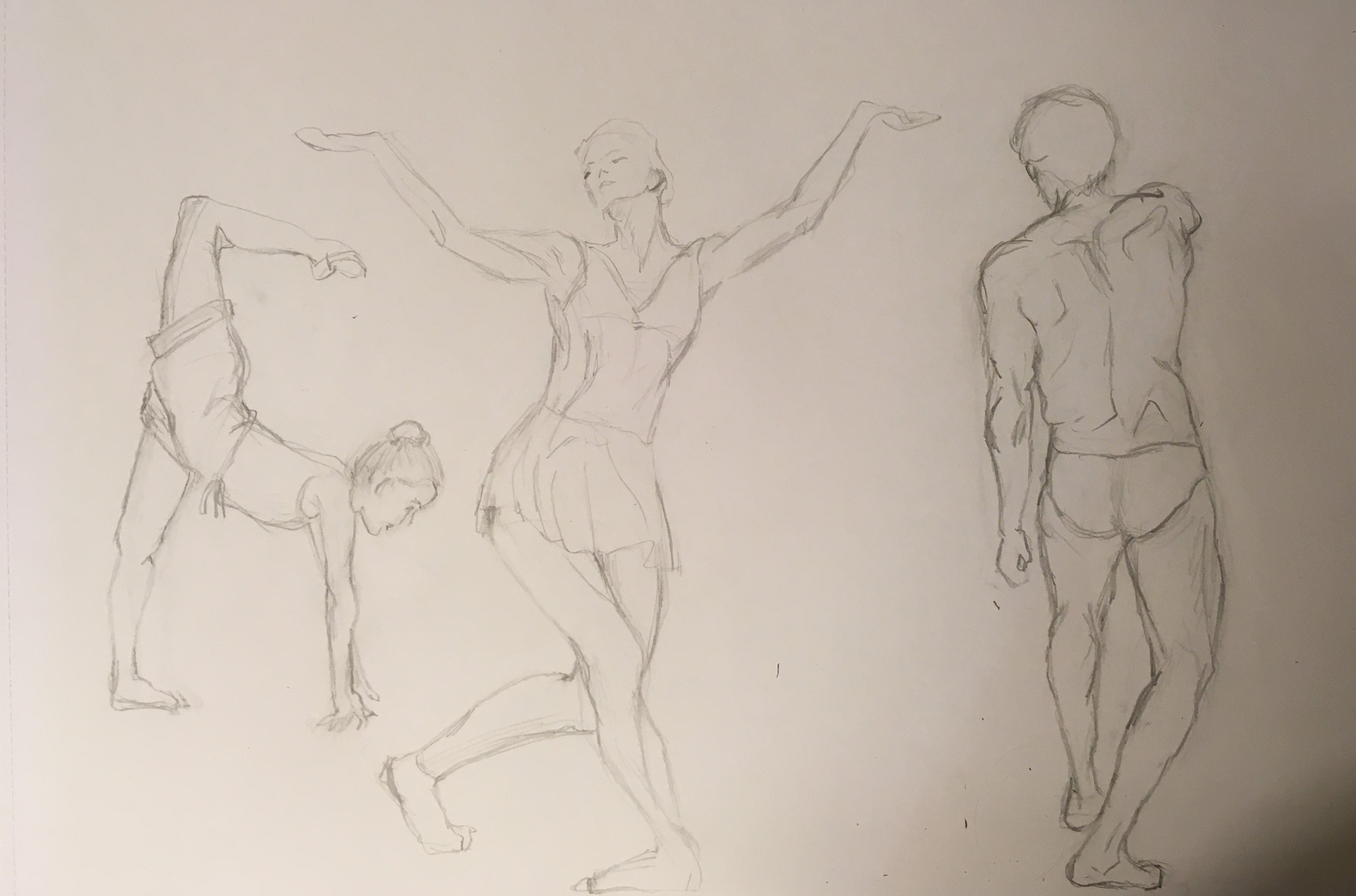 Très bon exercice de prendre des poses en référence :) ça me semble très bien ! Ce n'est pas question de proportions mais le pied de la jambe qui part vers la droite de la dame au milieu me semble tordu, on dirait qu'il part un peu violemment dans le sens inverse du genou. Après, je n'ai pas le modèle ! Beau travail en tous cas !