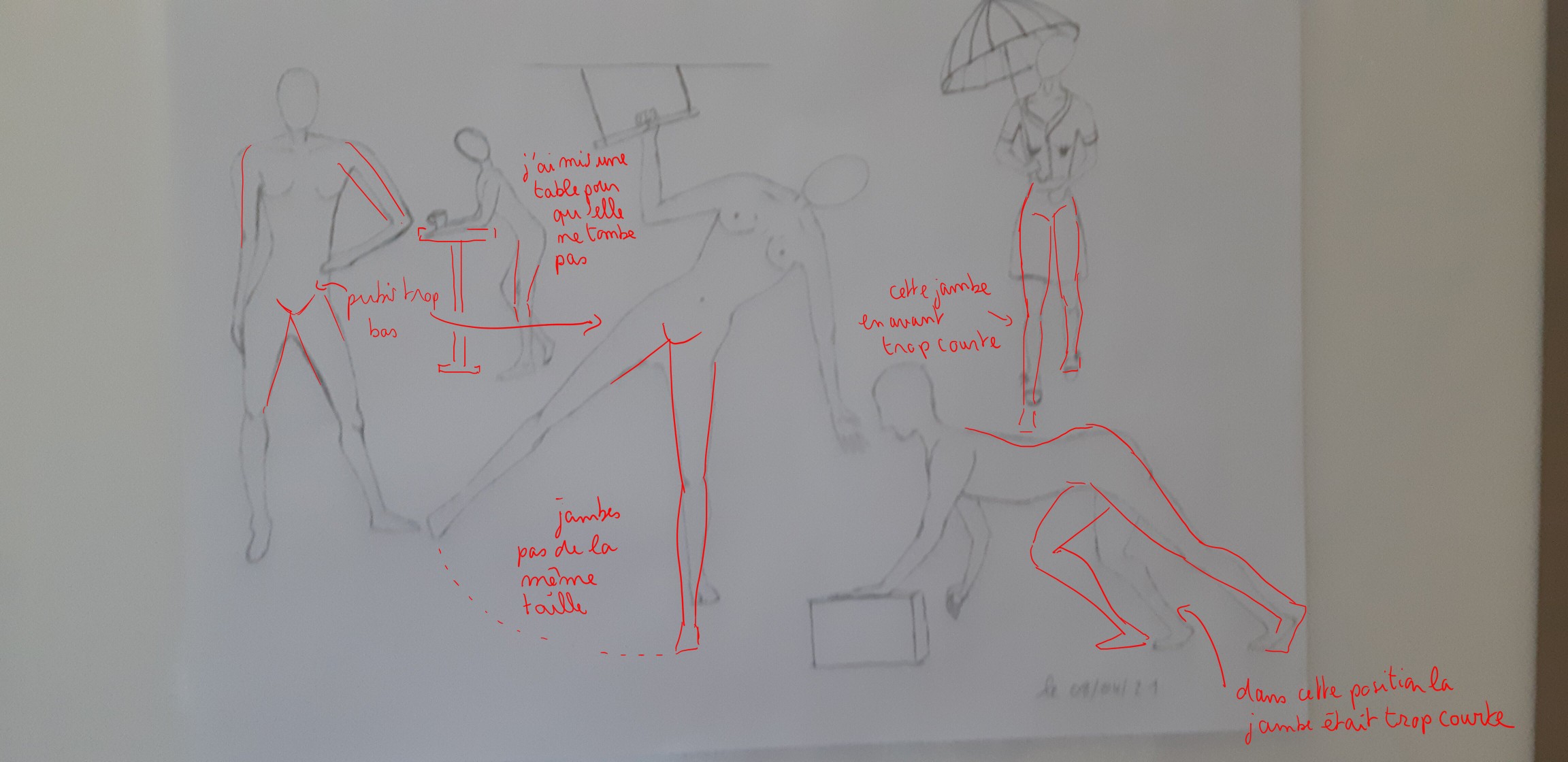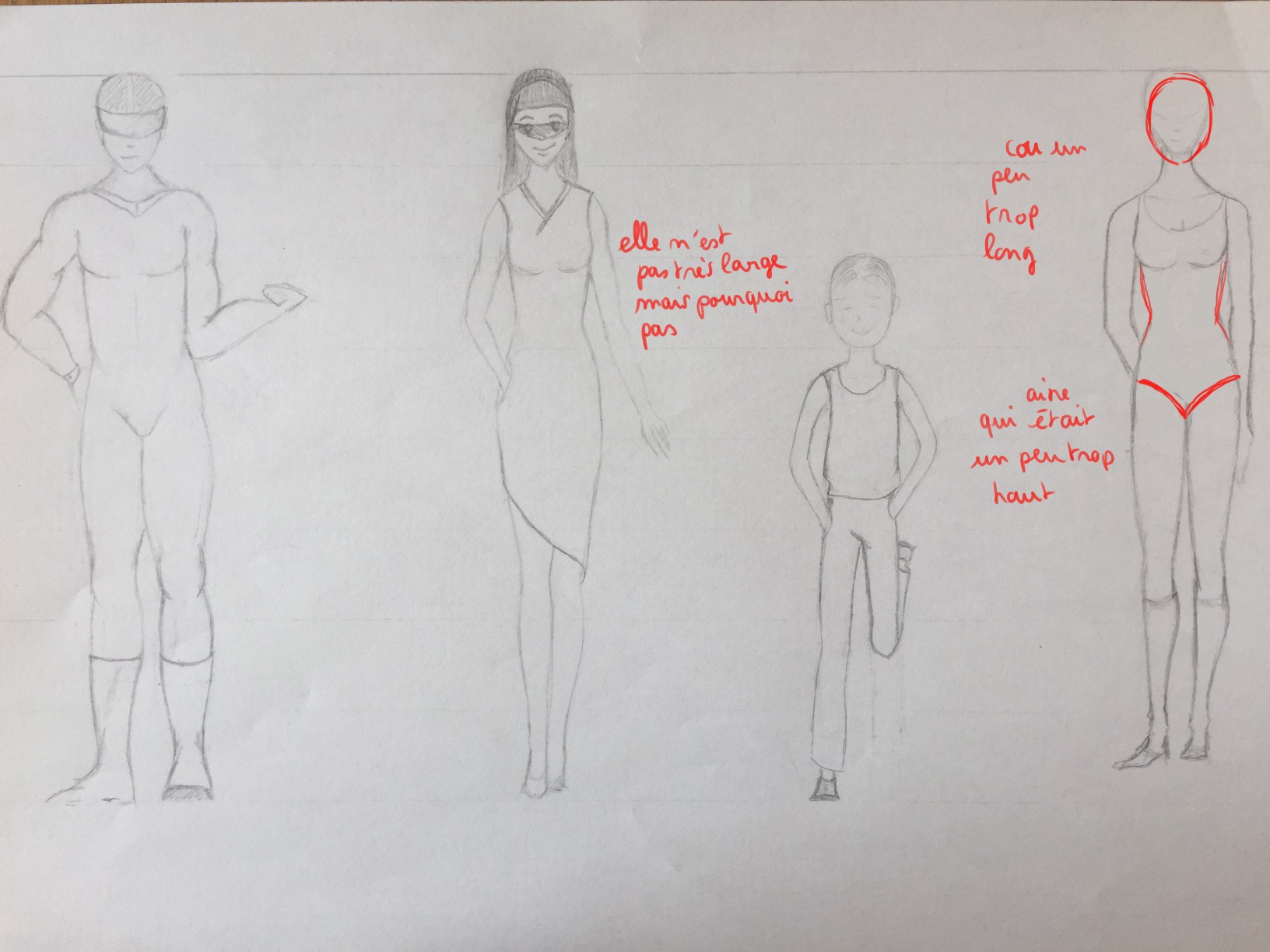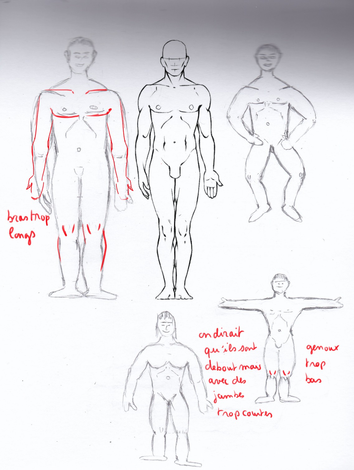 Et oui pas facile, surtout en prenant des poses compliquées ! Commencer par une pose droite en premier aiderait peut-être :) Mais c'est du bon travail, j'ai annoté les quelques défauts sur le dessin. Sinon, il ne faut pas se mettre la pression à réussir tous ses traits du premier jet ! Les dessins sont la plupart du temps faits avec un ou plusieurs croquis qu'on réadapte avant de finir par les mettre au propre. A moins de s'appeler Kim Jung Gi (illustrateur coréen dont les démos sont très impressionnantes) et avoir une énorme bibliothèque dans la tête, c'est rare d'avoir un trait juste directement sans construction dessous. L'idée est donc de faire les placements et mesure avec le croquis (qu'on peut n'appuyer que très légèrement), puis mettre au propre par dessus. On peut s'entraîner pour plus de justesse du trait immédiate, notamment en dessinant des poses rapides (avoir des modèles et se donner juste une minute pour dessiner chacun par exemple). ça permet surtout de lâcher le trait et voir l'essentiel d'une pose, même si ça ne sera pas forcément très juste en formes et proportions au départ.