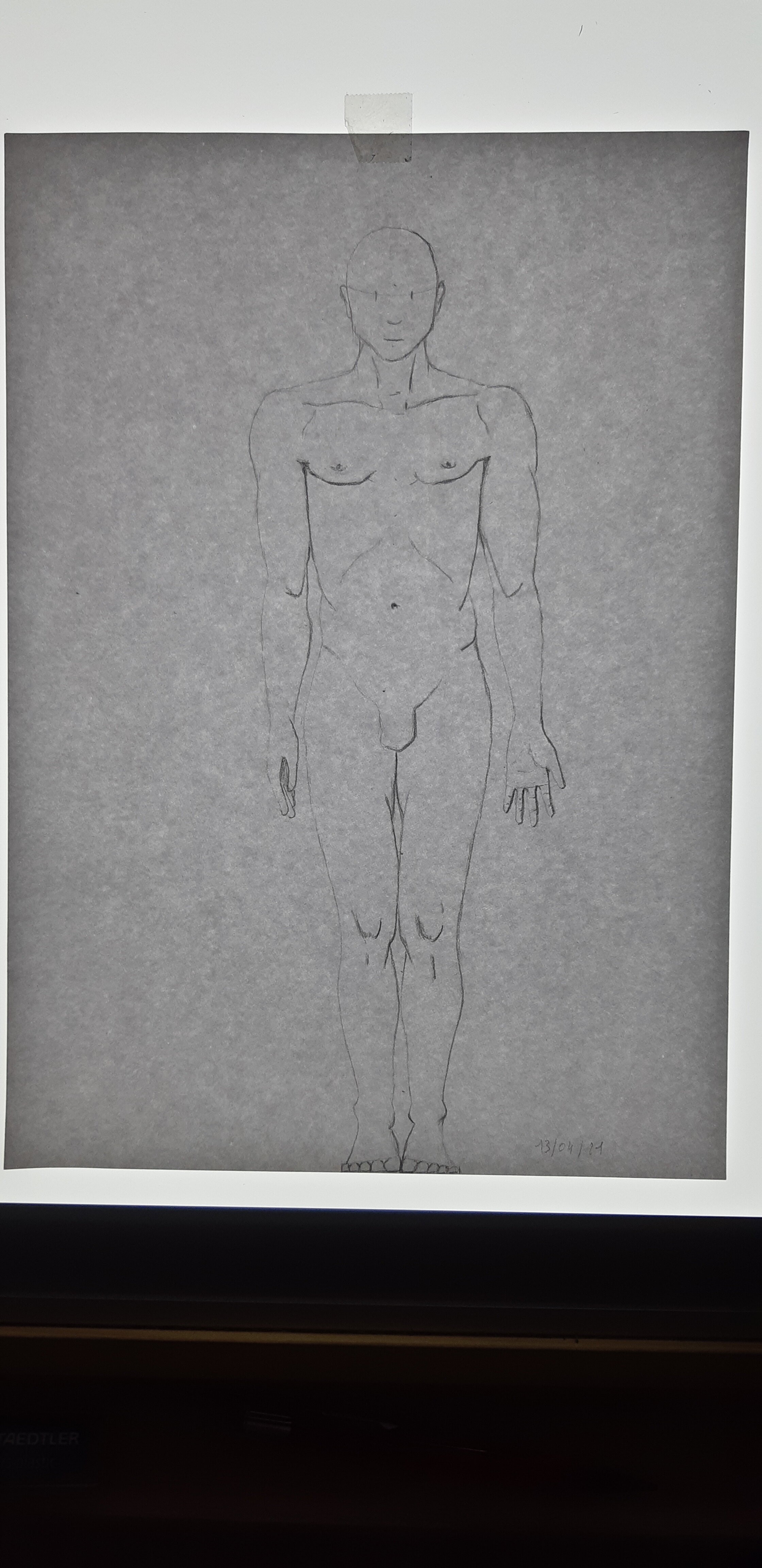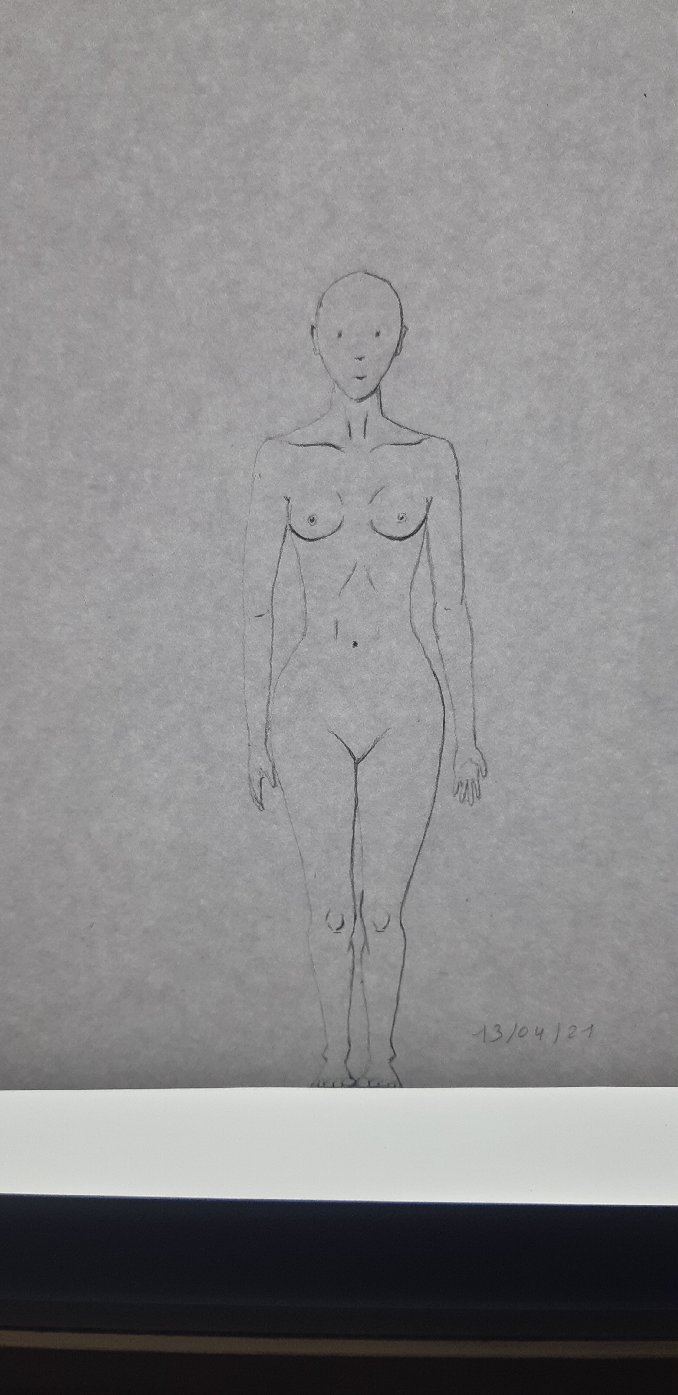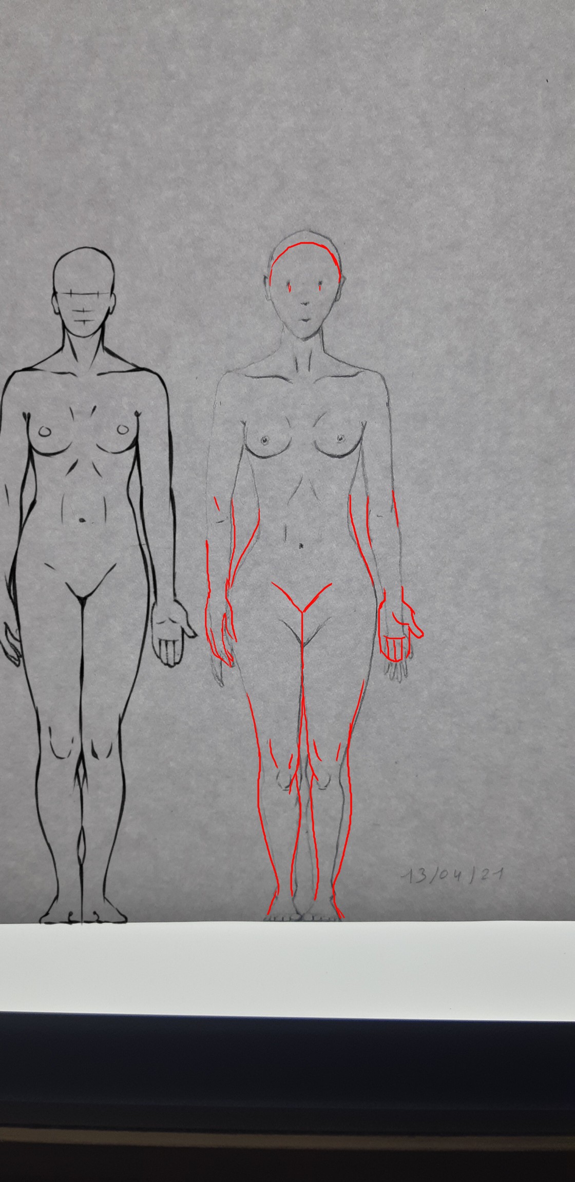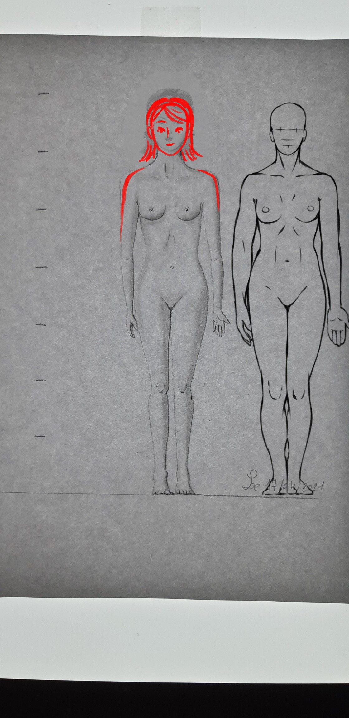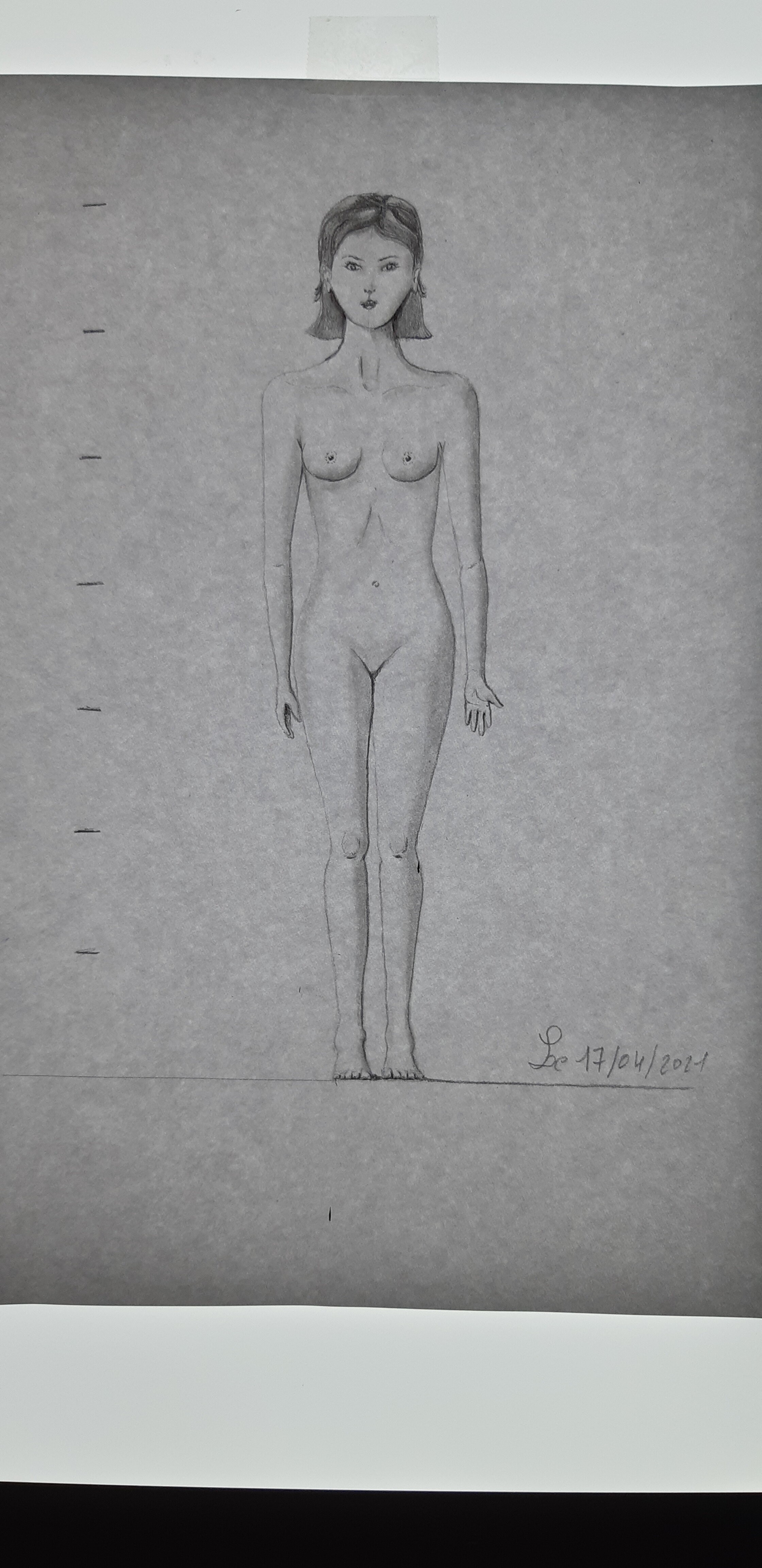 Reelabro a la mujer en mente a 7 nuevamente y envías el dibujo nuevamente. De hecho, este es 6.75 y no 7 cabezas como quería. Esto me hace darme cuenta de que incluso un 0.25, es muy importante y no tengo los ojos en este dibujo durante 2 días, veo que tiene un problema en términos de piernas.