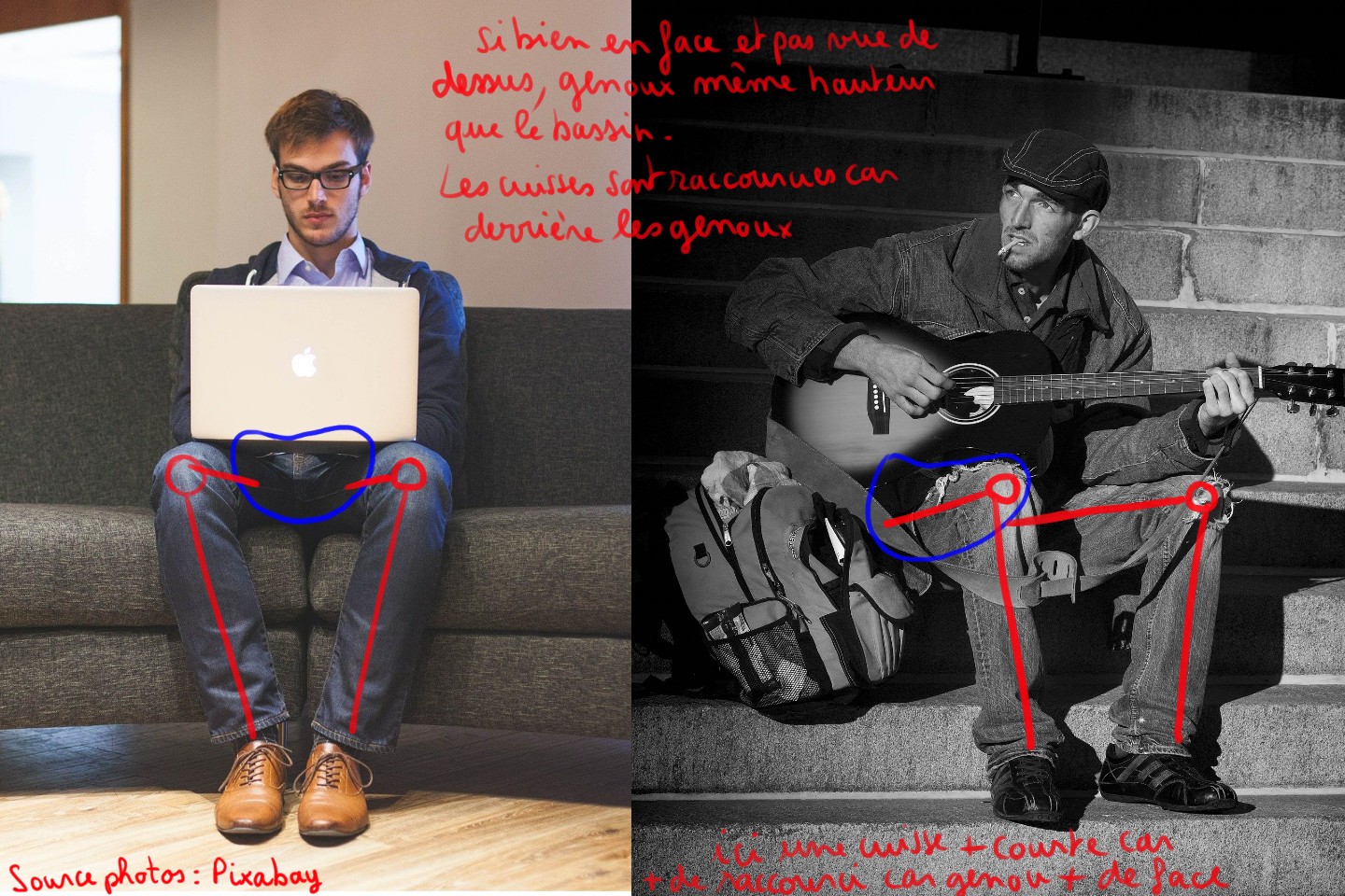 Plutôt bien pour les proportions de l'homme debout, attention juste aux bras trop longs. Pour l'assise les genoux devraient se placer plus haut, ce qui raccourcit les cuisses car les genoux se mettent devant. Sinon ça ferait comme si on était vue de dessus. Je montre sur des photos pour mieux visualiser ^^