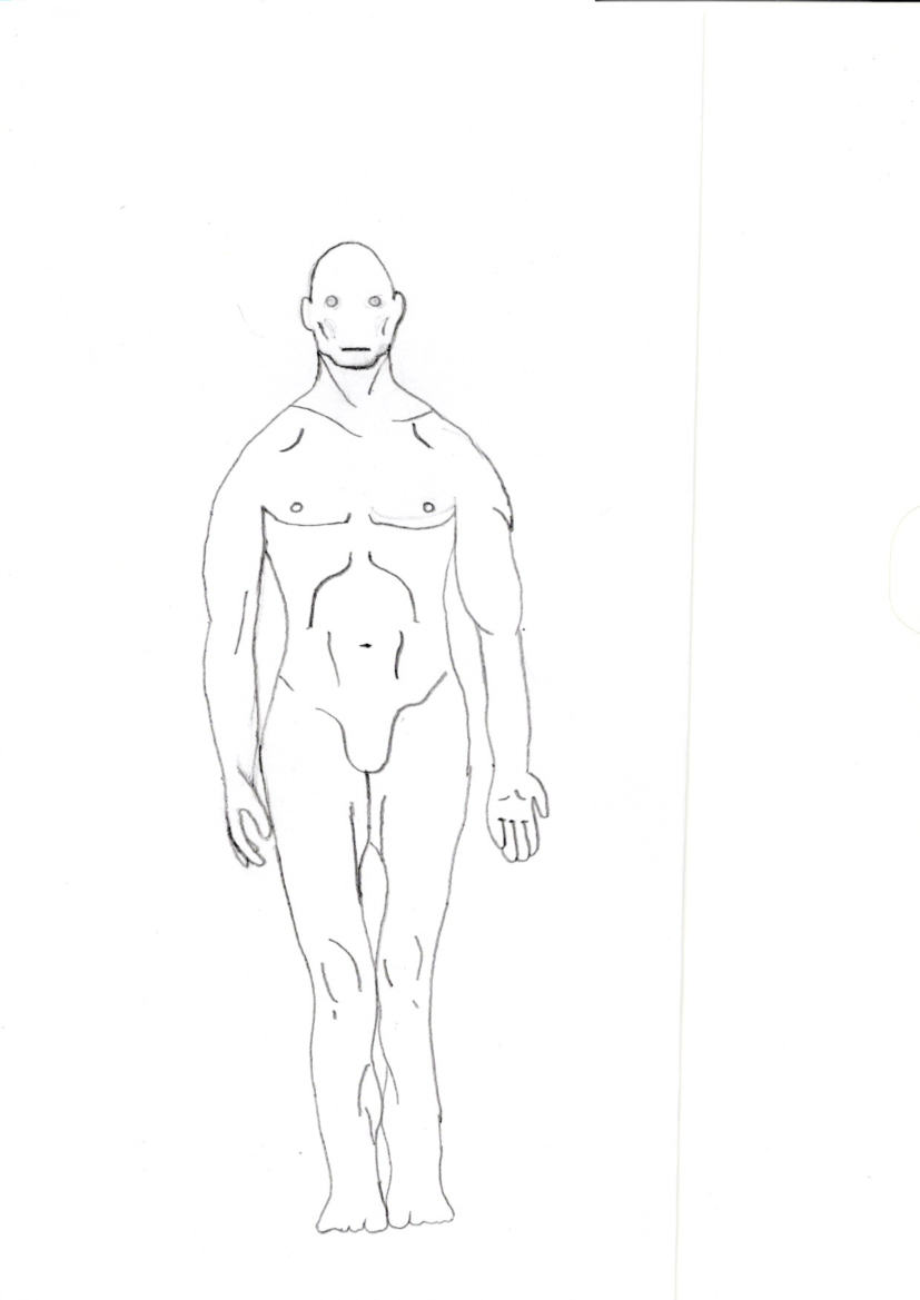 Pour le reste il y a des choses légèrement mal placées (le cou et la tête donc, mais également les genoux : trop bas, les coudes : trop haut). Des traits en trop au niveau du ventre.