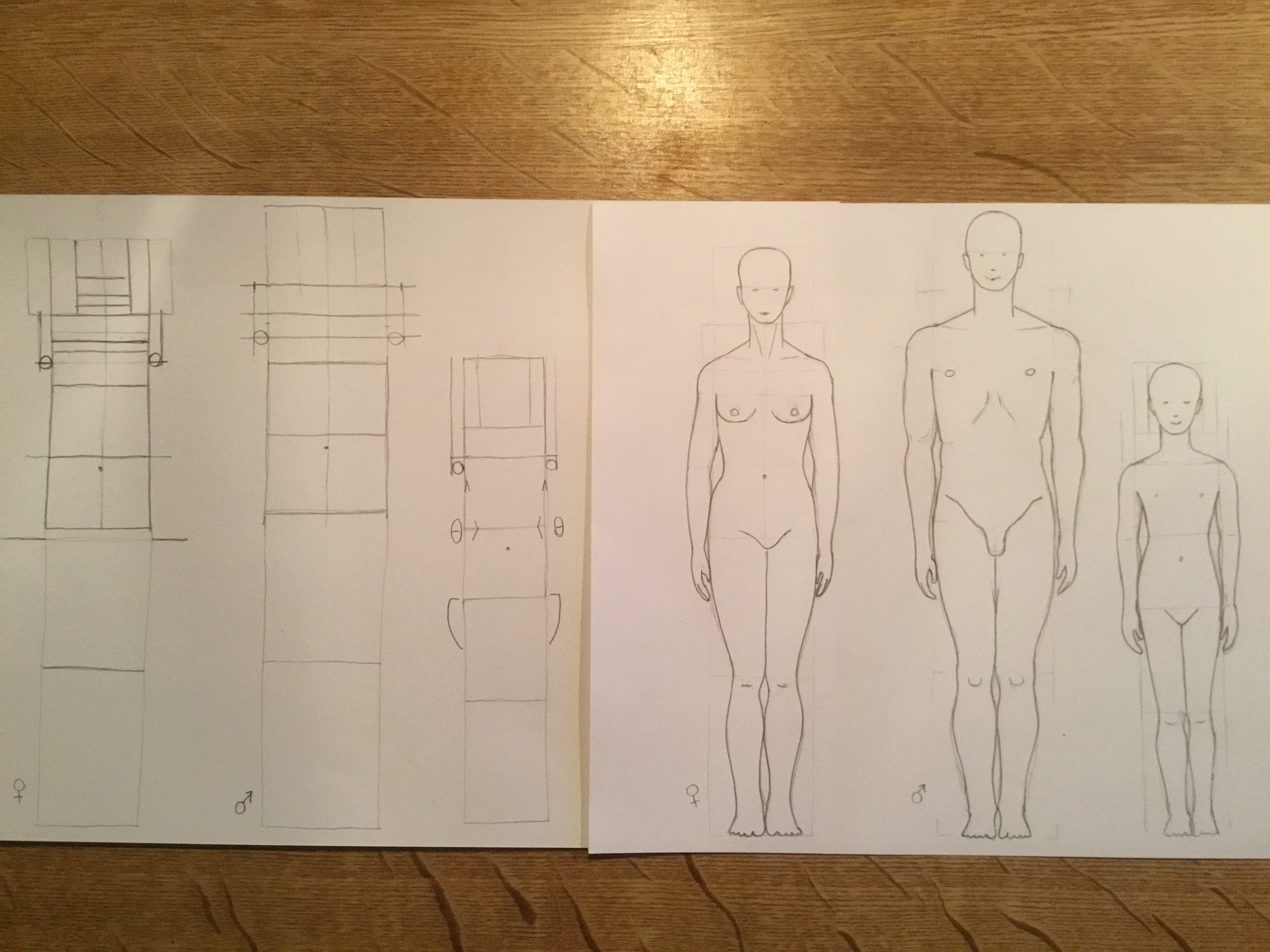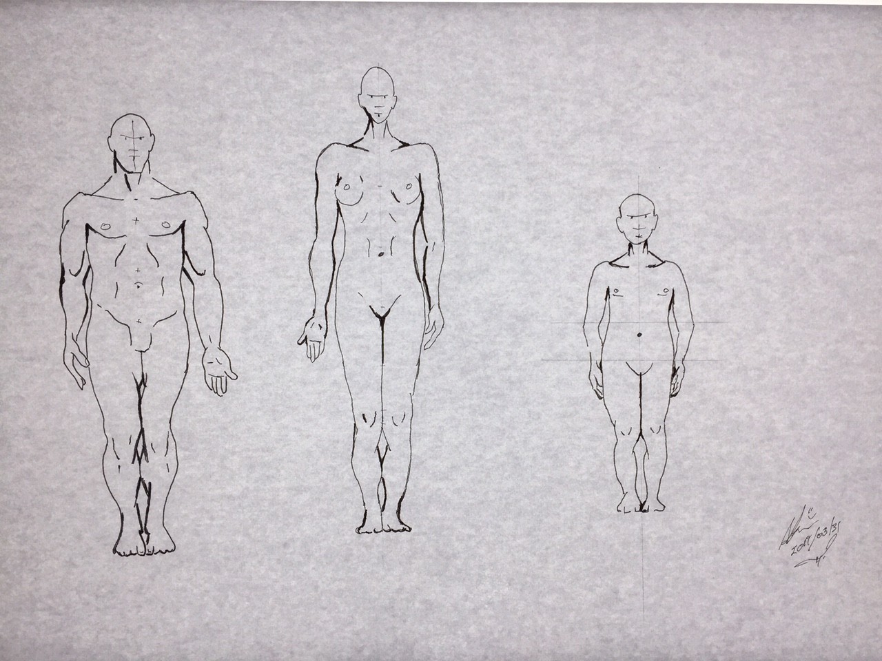 Bon, voici un résultat du débutant. J’ai dessiné ces canons séparément et les ai retracés sur cette feuille au stylo à encre. Plusieurs essaient pour définir les traits de la tête et mon manque d’expérience n’a pas su définir adéquatement les proportions du canon masculin, mais tout de même j’en suis satisfait. Il y a quelques erreurs sur les proportions du coté gauche à droite ou vis versa, mais tout de même on peut aisément le définir comme un caractère masculin.