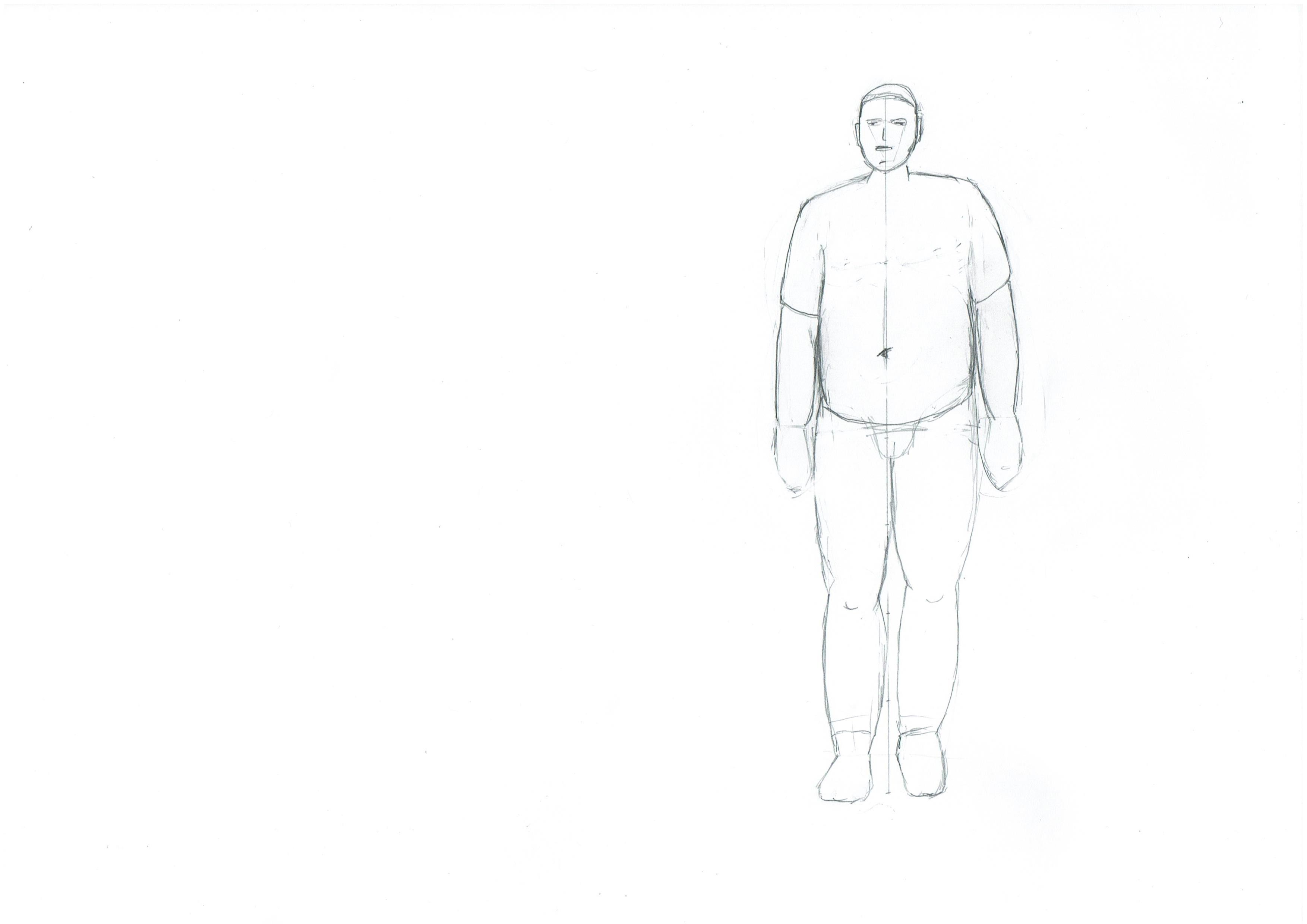 J'avoue que la Perspective c'est beaucoup plus relaxant que les proportions humaine, je me suis malgre tout lance dans le defi et voici mon 1er essai pour un homme avec de l'embonpoint. Malgre un effort a respecter les canons, il a une petite tete non ?!