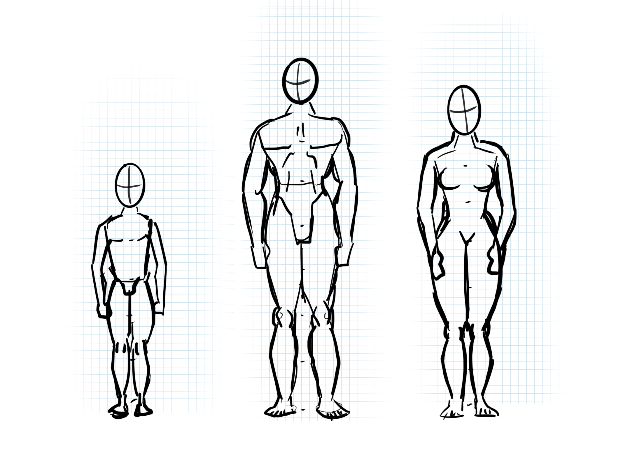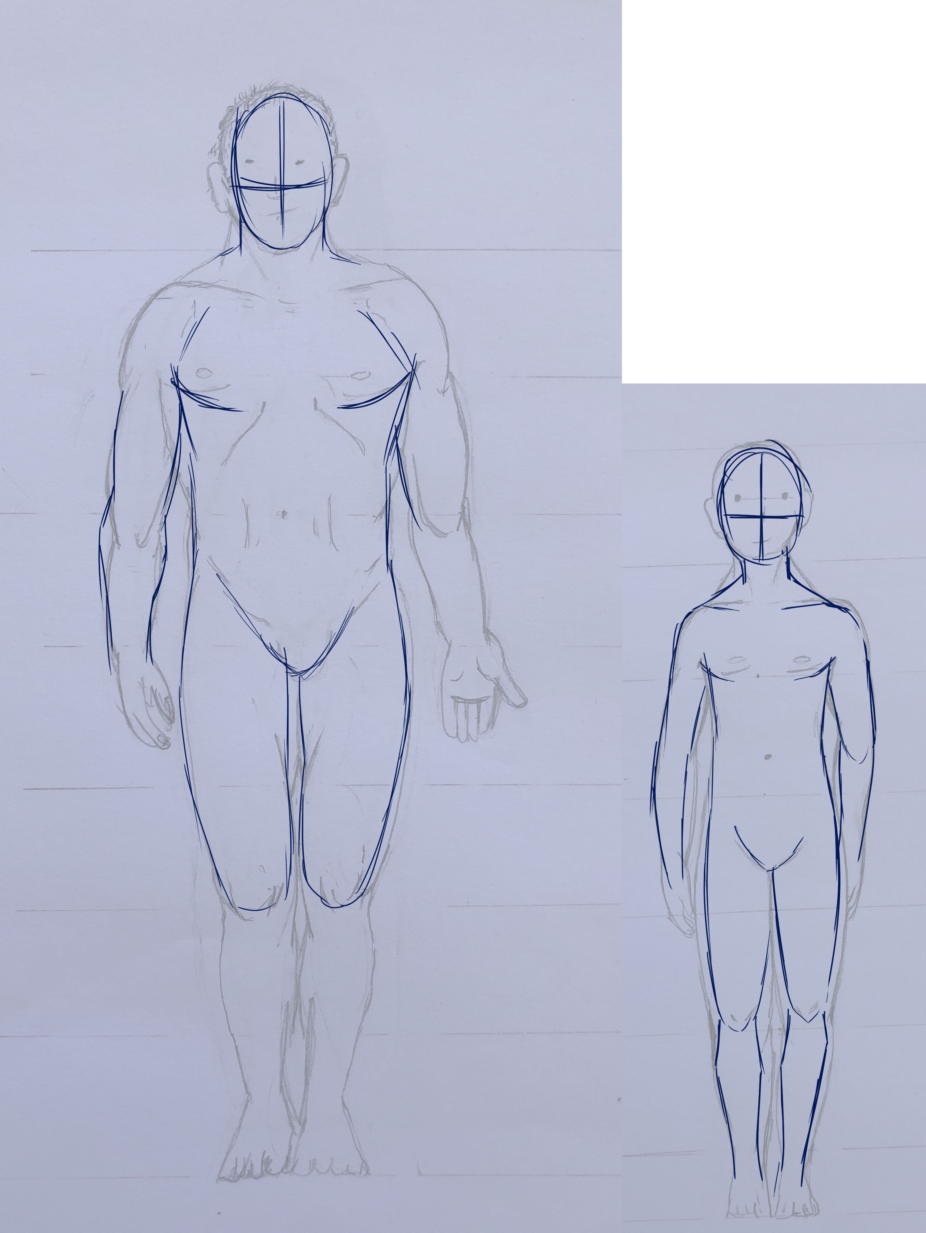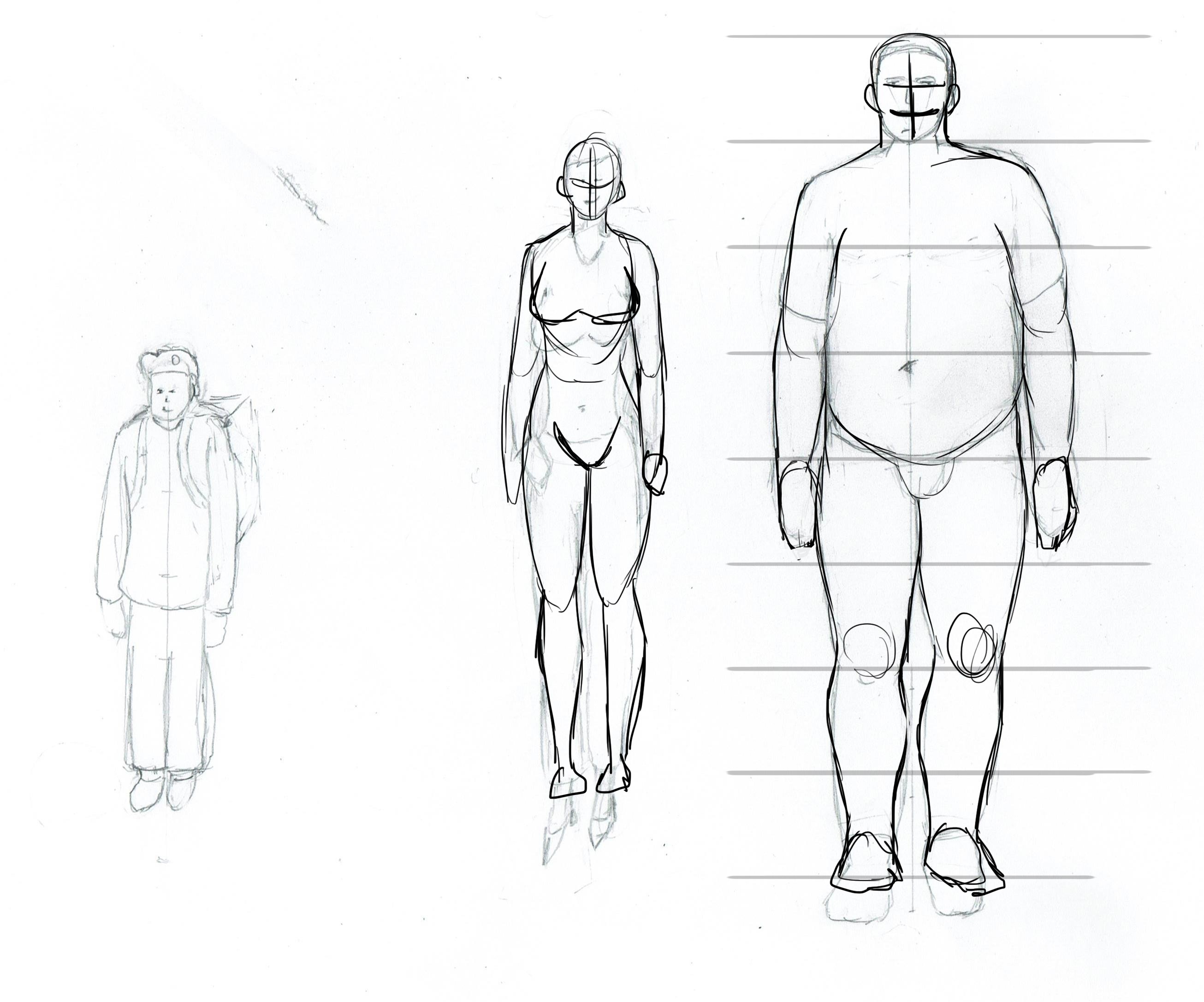 Hey c'est pas mal quand même. Oui, je te confirme tes personnages ont de petites têtes. L'homme est pas mal en soi, même si le fait qu'il soit en dehors du canon ne me permet pas de savoir si tu as compris la structure sous-jacente. Les bras sont un poil courts (les mains dépliées arrivent normalement entre le premier tiers et la moitié de la cuisse, ici on est un chouille trop haut pour l'homme). N'hésite pas à épaissir son cou. Les hommes ont souvent un cou quasiment aussi large que leur visage, encore plus lorsqu'ils sont enrobés ^^ Attention à la ligne des épaules, ici elles sont en biais. Il est un poil trop long, pas grand-chose, mais tu verras, je t'ai joint une petite correction ^^