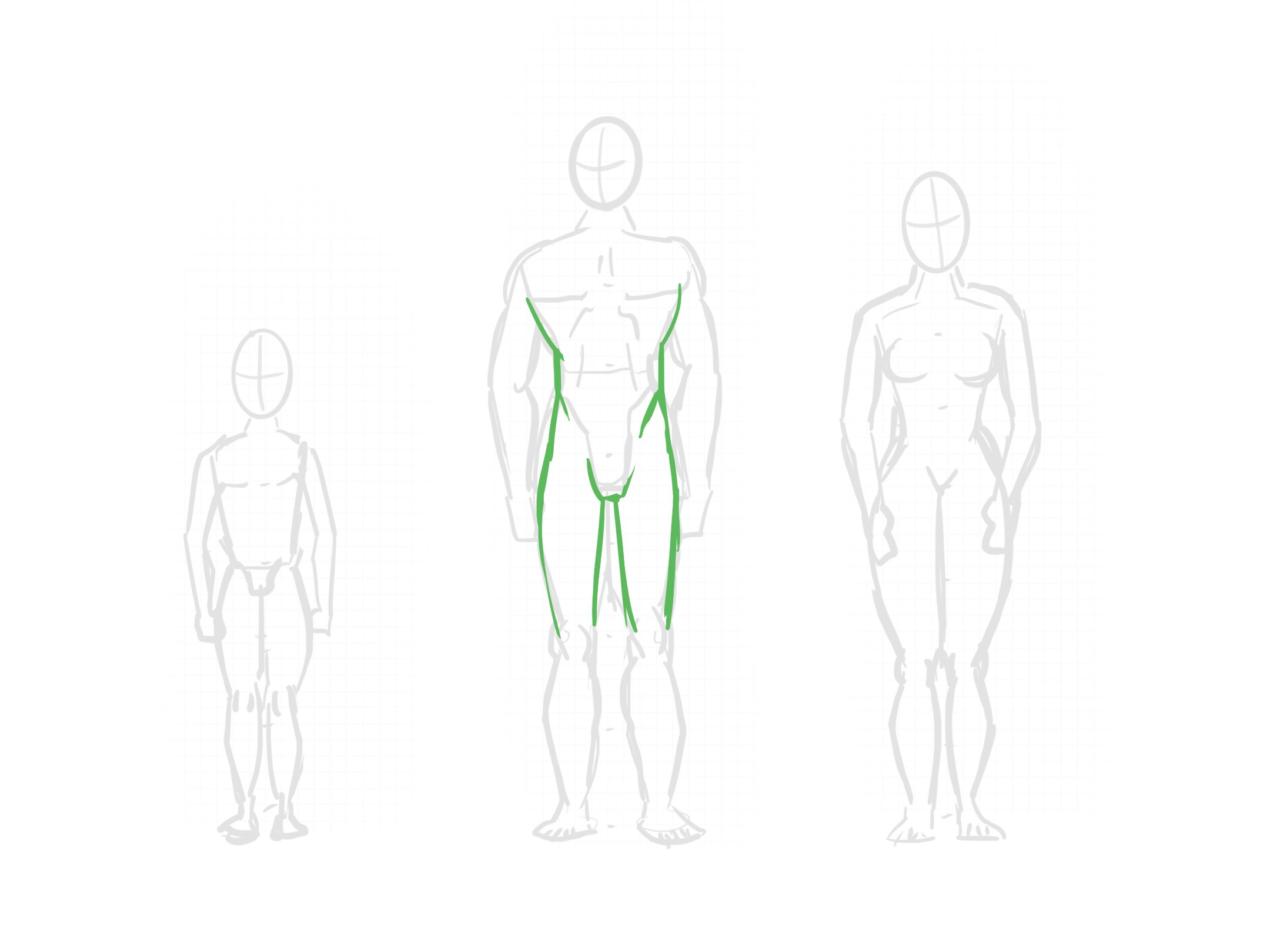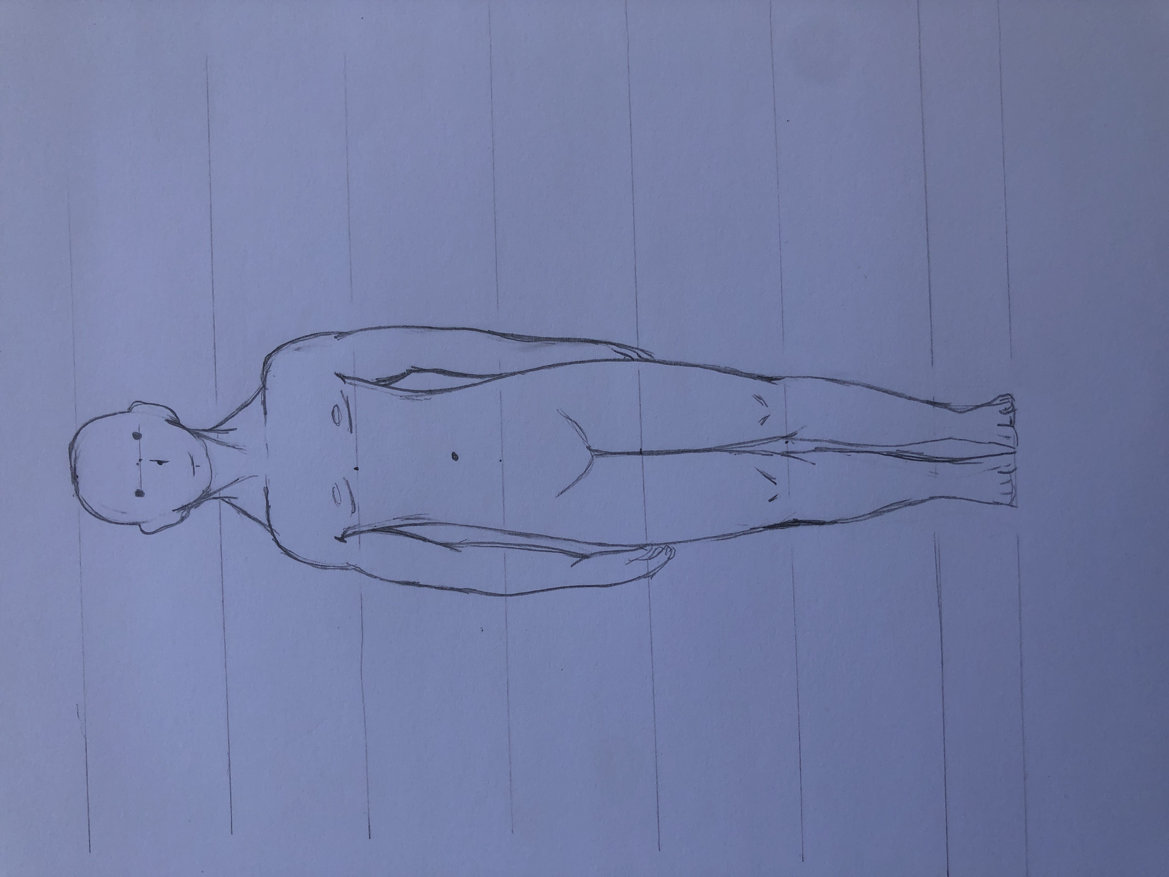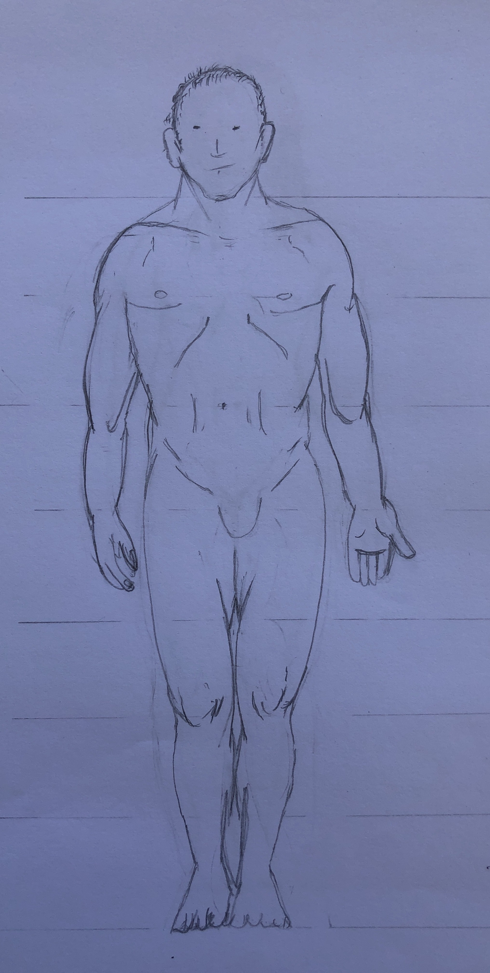 Él tiene los brazos demasiado cortos y su cabeza demasiado amplia, creo. También puedes descender un poco entre las piernas. El cuello de los caballeros generalmente está casi en la extensión de la cara (casi el mismo ancho). También tengo el cabello de ancho la caja torácica.
