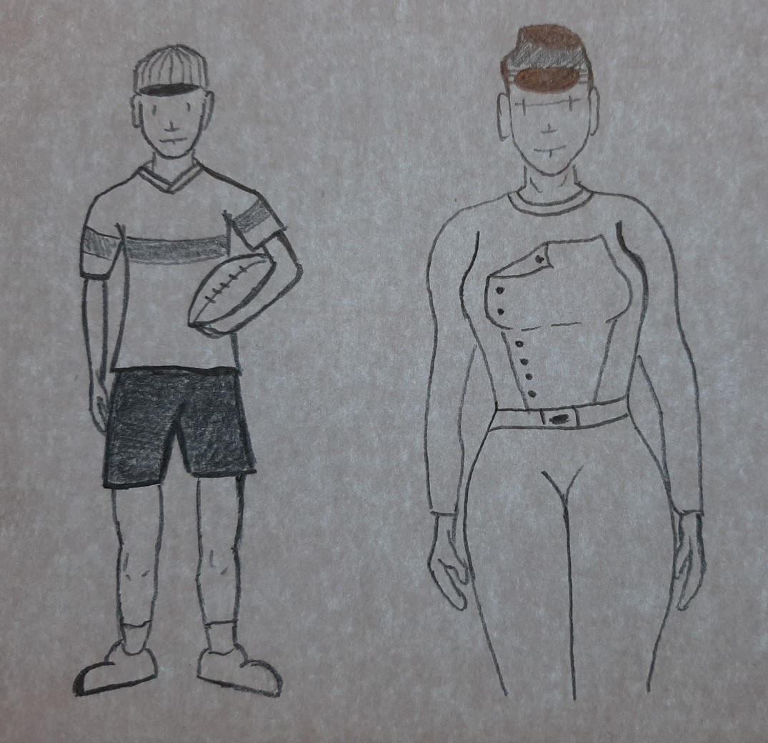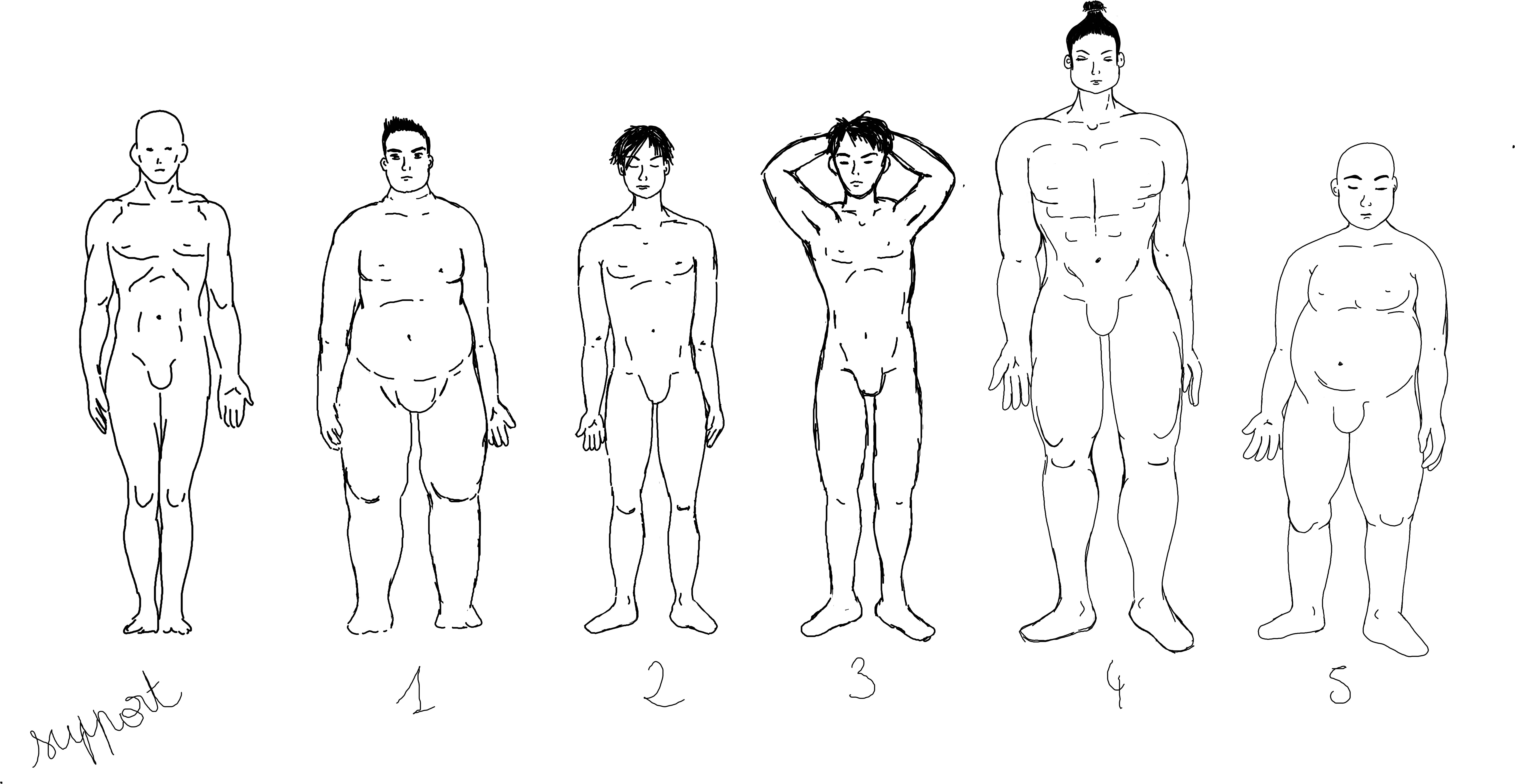 Pur l'homme par contre, c'est moins juste. Il a des épaules larges : c'est bien. Le problème, c'est qu'il a une taille très marqué et des hanches larges, comme sa voicine. Si tu retires les muscles du ventre, il a exactement la même morphologie, donc ça ne va pas. Je te joins une petite correction ^^