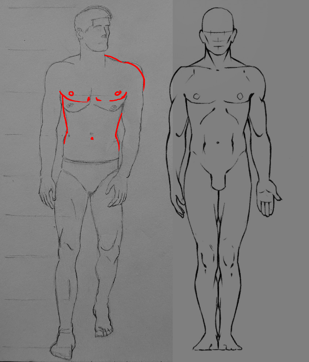 Au niveau des proportions c'est bien, ça fonctionne :) Et oui sur du réaliste c'est plus dur de tricher que sur du cartoon ^^ Le petit défaut ici est les pectoraux qui sont trop bas et ressemblent un peu à une poitrine féminine. Mais en modifiant ça c'est bon, tu peux d'ailleurs voir avec le modèle à côté que ça fonctionne :)