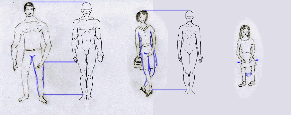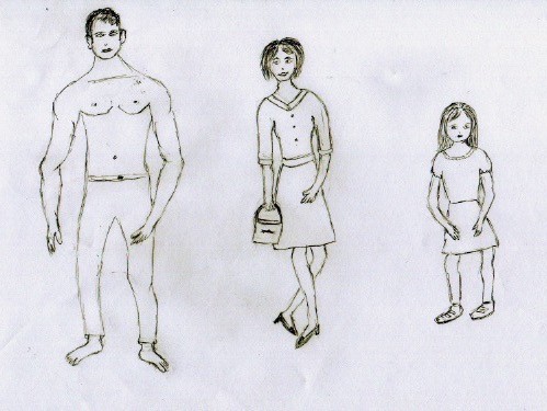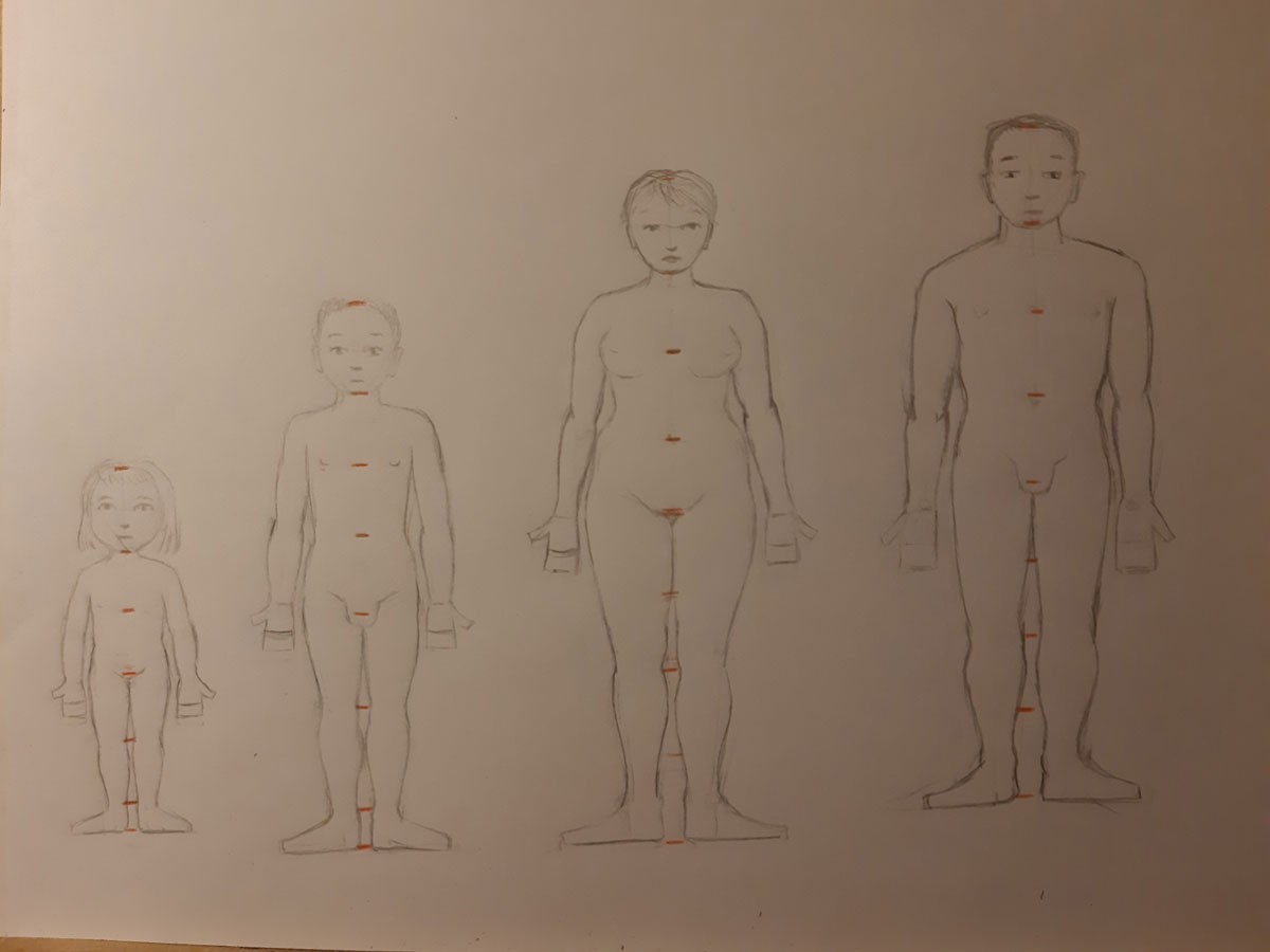 Joli travail ! Tout ça me paraît cohérent ! Pour l'homme et la femme tu as fait des personnages plus larges et trapus que les canons, mais c'est juste une morphologie différente, ça me semble juste :) Peut être la tête un peu trop grosse et les jambes un tout petit peu trop courtes pour l'homme. Pour la petite fille, c'est normal qu'elle ait la tête plus grosse par rapport à son corps par rapport à un adulte, mais elle est tout de même un peu trop grosse. Je valide en tous cas, tu as bien réalisé tes proportions :)