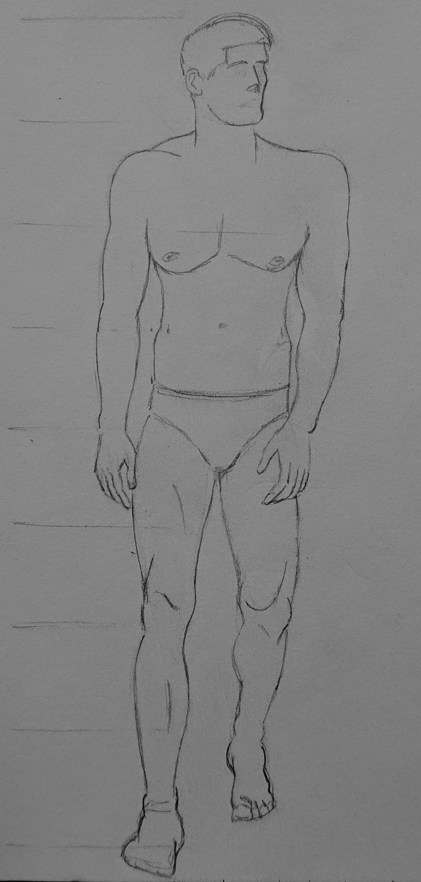 C'est du bon travail, les proportions sur la hauteur sont justes :) Ce qui est un peu bizarre c'est que ton buste manque de largeur. Tu auras un peu de travail aussi sut la forme des muscles (jambes notamment), mais ça tu le travailleras mieux dans les prochaines leçons sur le squelette (qui te fera comprendre les différents volumes du corps), et sur les muscles par dessus tout ça :) En attendant c'est validé :)