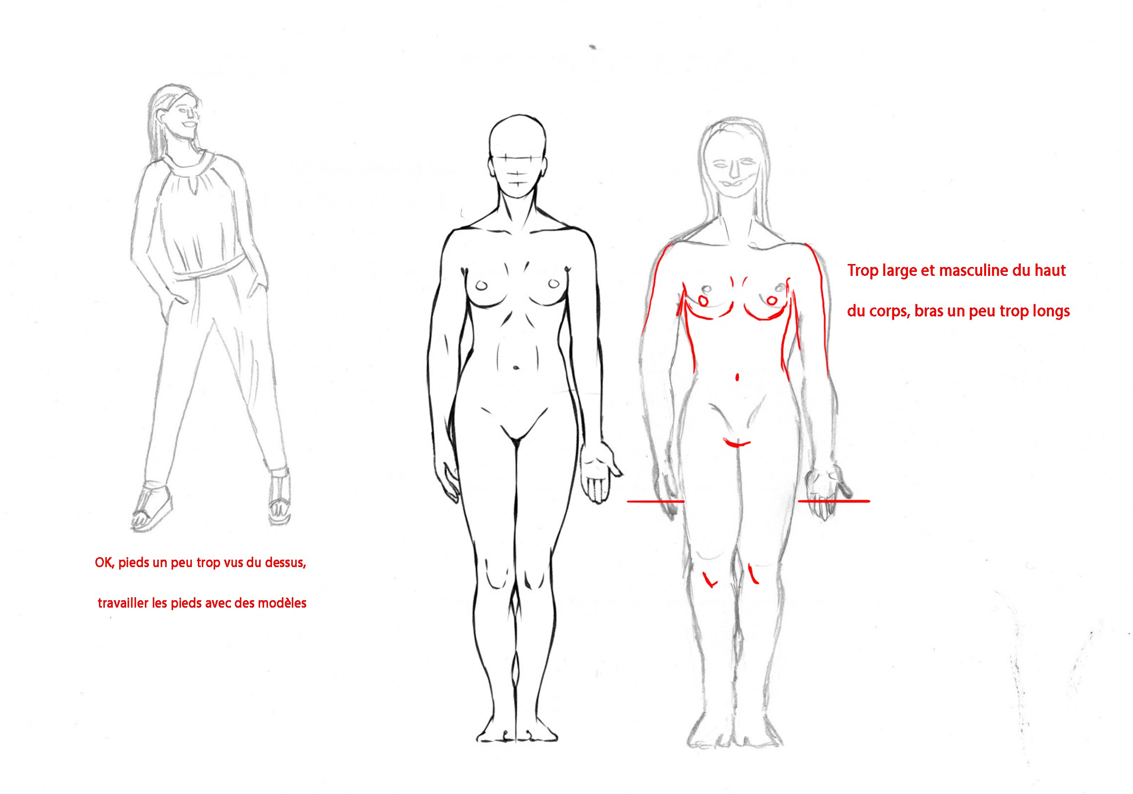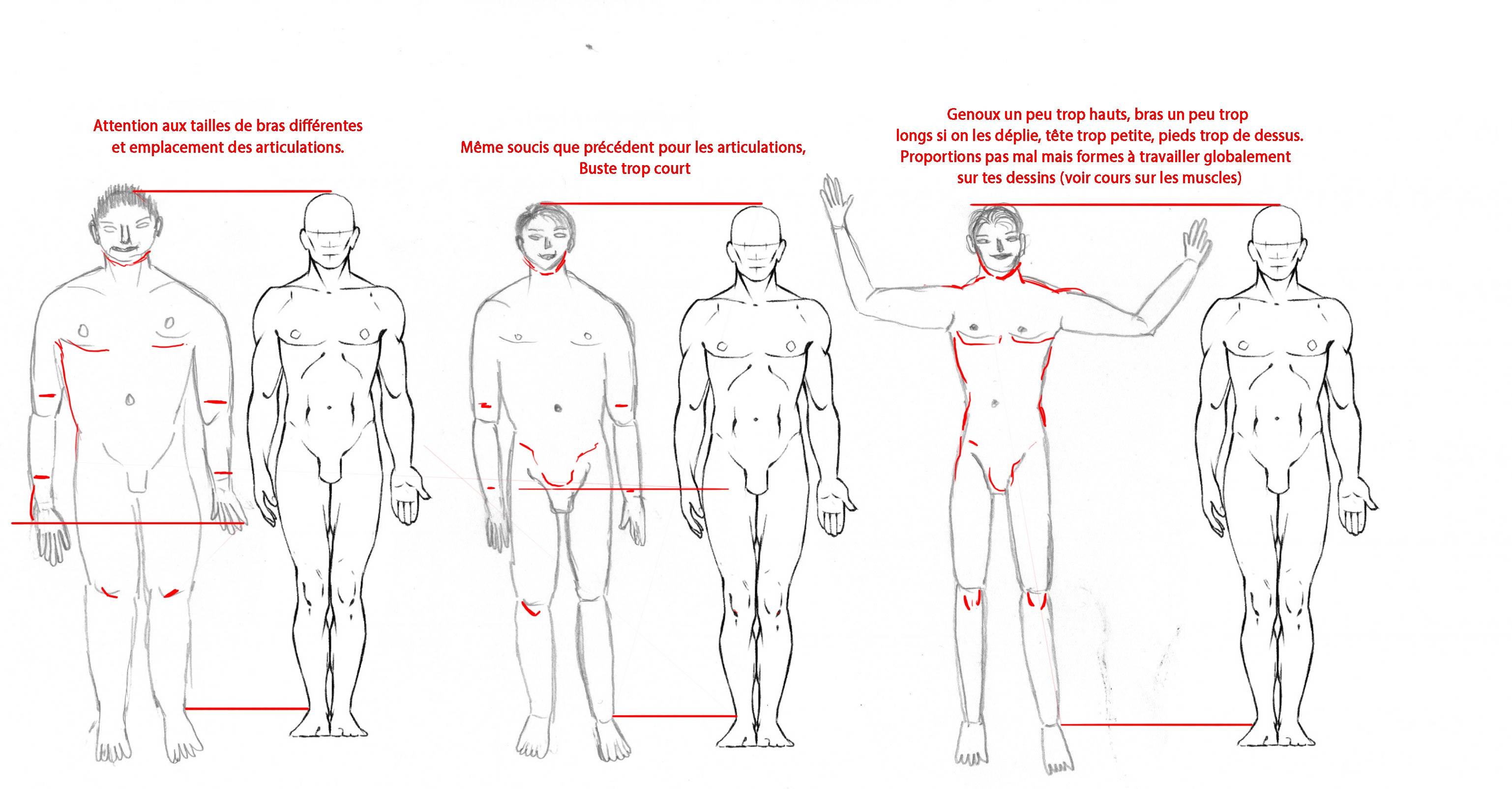 C'est pas mal niveau proportions ! Les choses à améliorer seront plutôt niveau muscles et squelette dans les prochaines leçons. Il y a quelques soucis niveau forme et épaisseurs des membres, et comment ils se tournent.