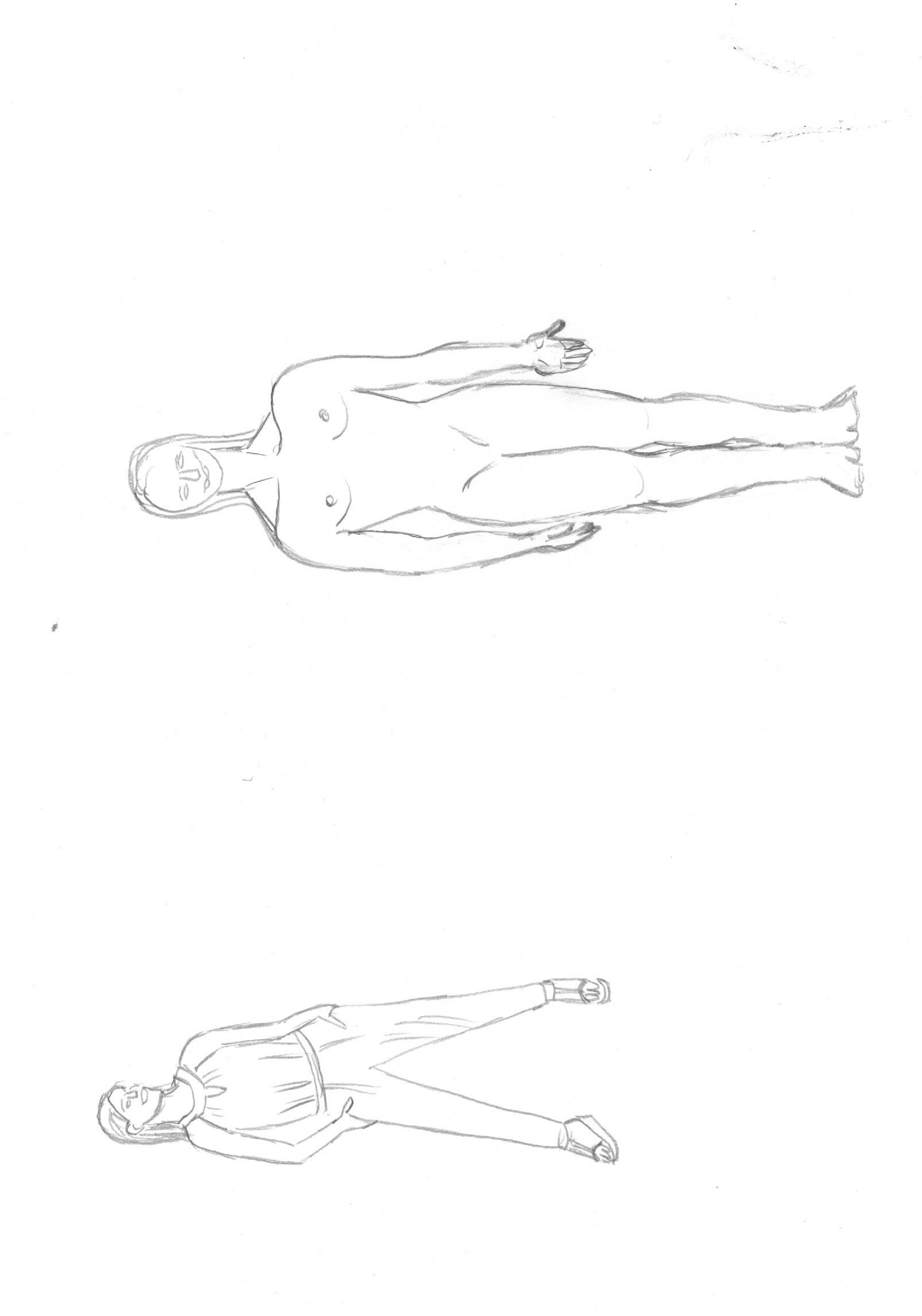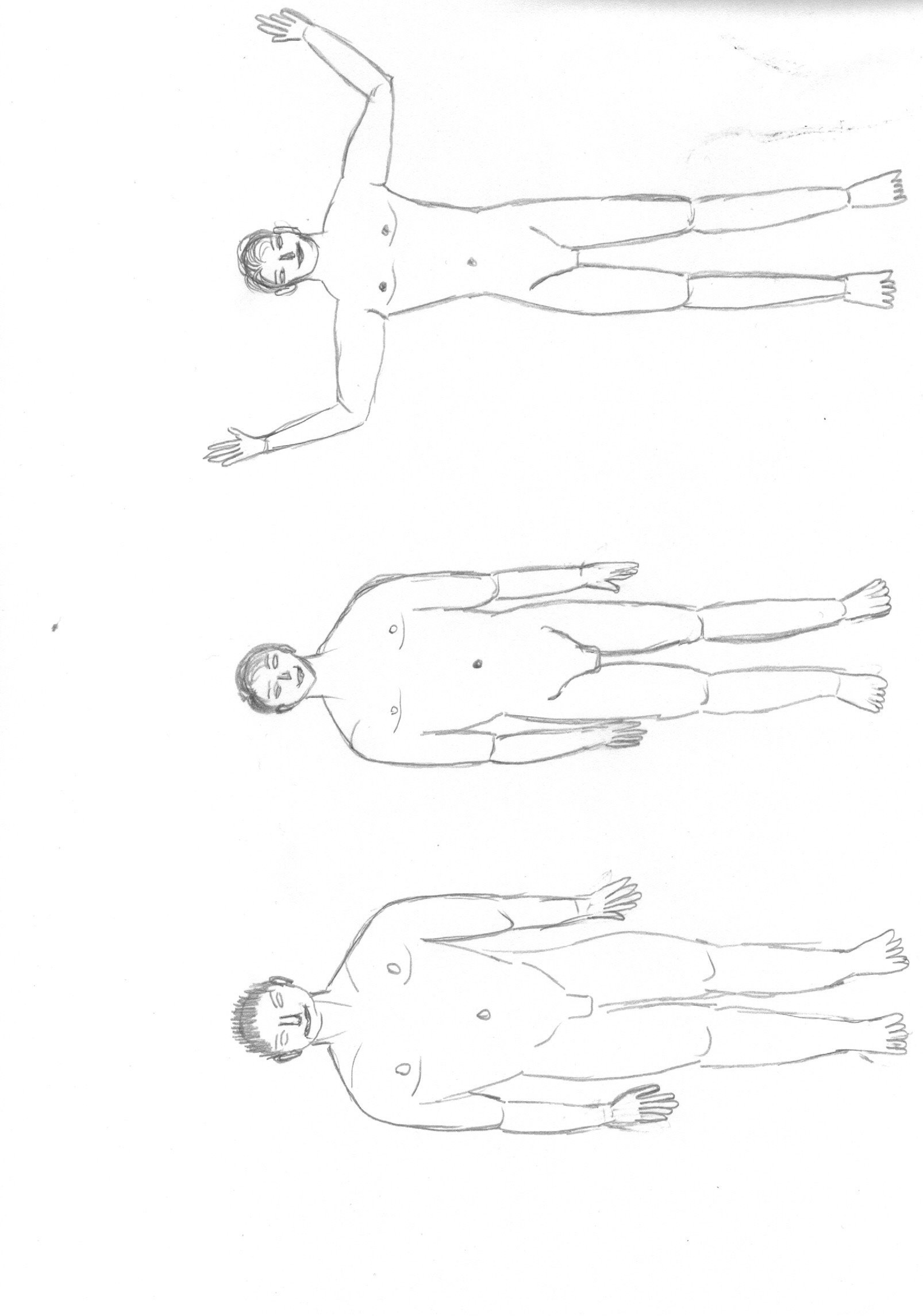 Commençons par l'homme. C'est pas mal, les proportions du buste et des jambes sont ) peu près bien. Le souci vien surtout des bras qui sont trop longs. Il faut penser qu'en les dépliant ça descend encore plus bas, donc là ils sont trop longs. Sinon on a l'imression que le genou de la jambe à droite est à l'envers, alors que sa position suggère qu'il les a orientés vers l'extérieur.