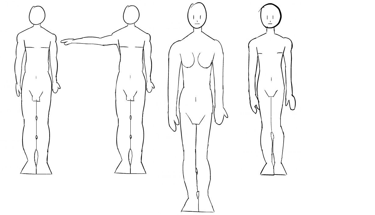 ¡Perdón por la espera! ¡No está mal! El defecto principal es que tiendes a hacer bustos que son demasiado largos, con la ingle demasiado baja. Lo vemos en tus primeros 3 caracteres. Para los primeros 2, la parte superior del cuerpo carece de un poco de ancho para un hombre y los brazos son demasiado cortos. El último personaje de la derecha es el mejor proporcional :) Globalmente piensa que los primos realistas son un poco más amplios y las cabezas un poco más grandes (excepto el último personaje). También marca el área de la rodilla, allí es difícil saber si lo coloca bien. Hay pequeñas imperfecciones en términos de formas corporales, pero lo verá en las próximas lecciones. En cualquier caso, es un buen comienzo, buen trabajo :)