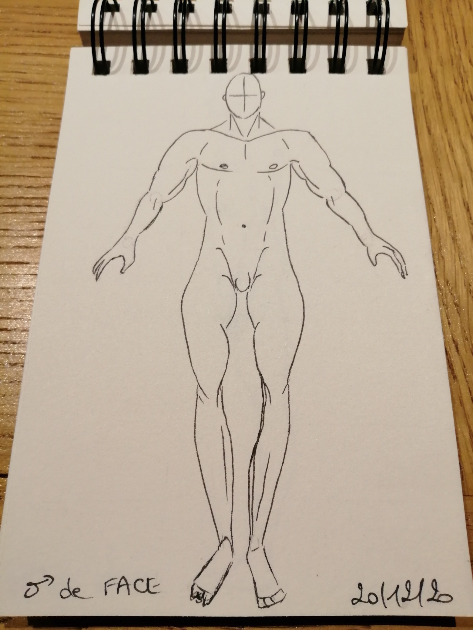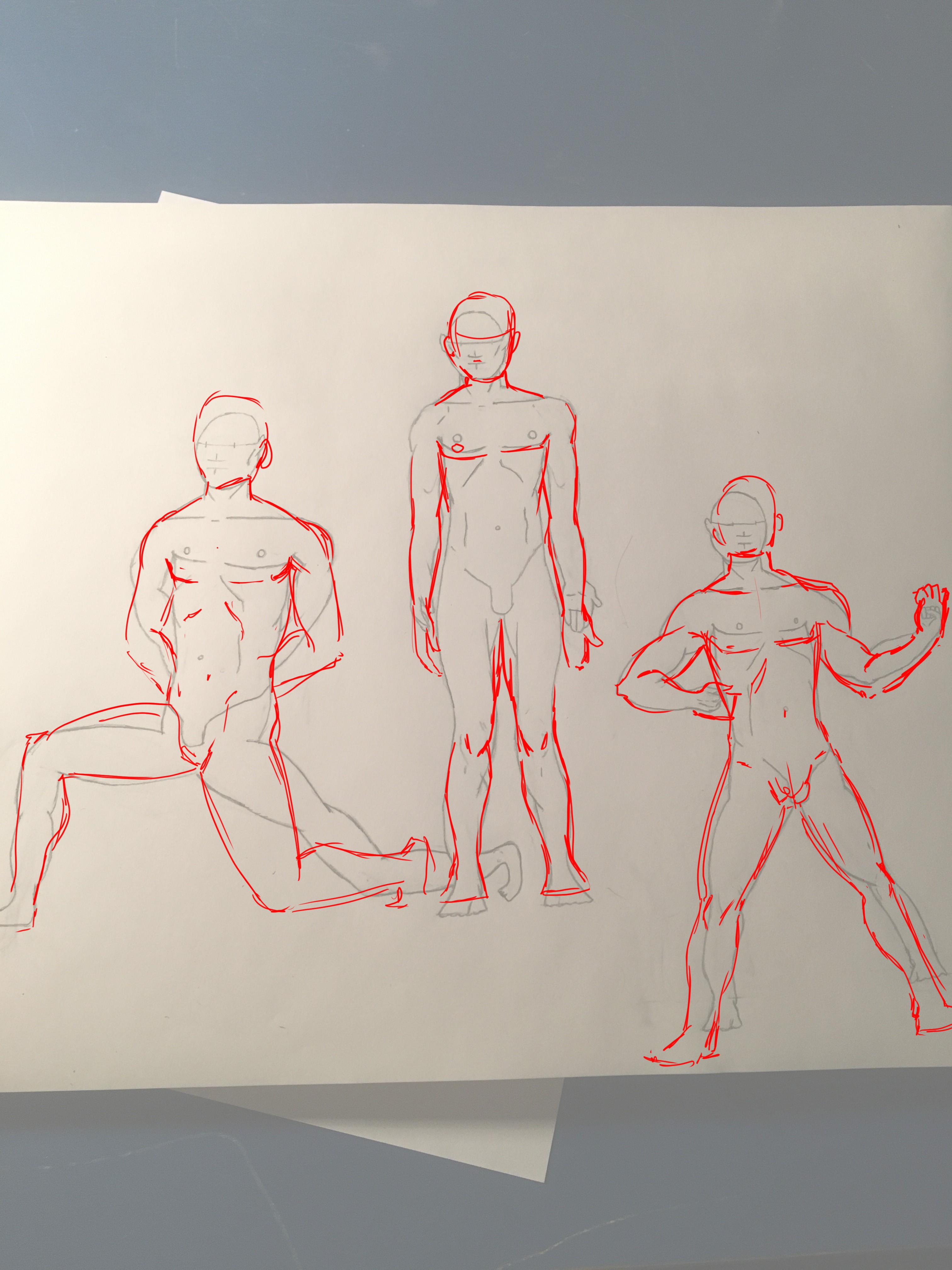 Pour compensé j'ai bien redessiné par dessus tes dessins pour que tu voies les améliorations. Au niveau des personnages sur celui en pose normale c'est pas mal. Vu qu'il a les jambes écartées, ça ne doit pas descendre aussi bas que pieds joints. Les genoux sont un peu trop bas, les bras un peu courts et la têtes un peu petite. Pour les autres, c'est un bon exercice de faire des positions, mais j'ai l'impression que tu n'as pas encore compris comment s'articule le corps humain, par exemple pour le personnage à gauche, la jambe à droite à une articulation en trop. Tu comprendras mieux tout ce fonctionnement dans les leçons suivantes, que ce soit sur la forme des muscles et comment ça s'articule. Attention aussi aux correspondances de longueur des membres entre chaque positions. Je te conseille de regarder des photos en référence quand tu veux dessiner une position. C'est par l'observation qu'on comprend, progresse, et qu'on peut retranscrire tout seul les règles assimilées plus tard :) C'est du travail soigné en tous cas, bien joué :)
